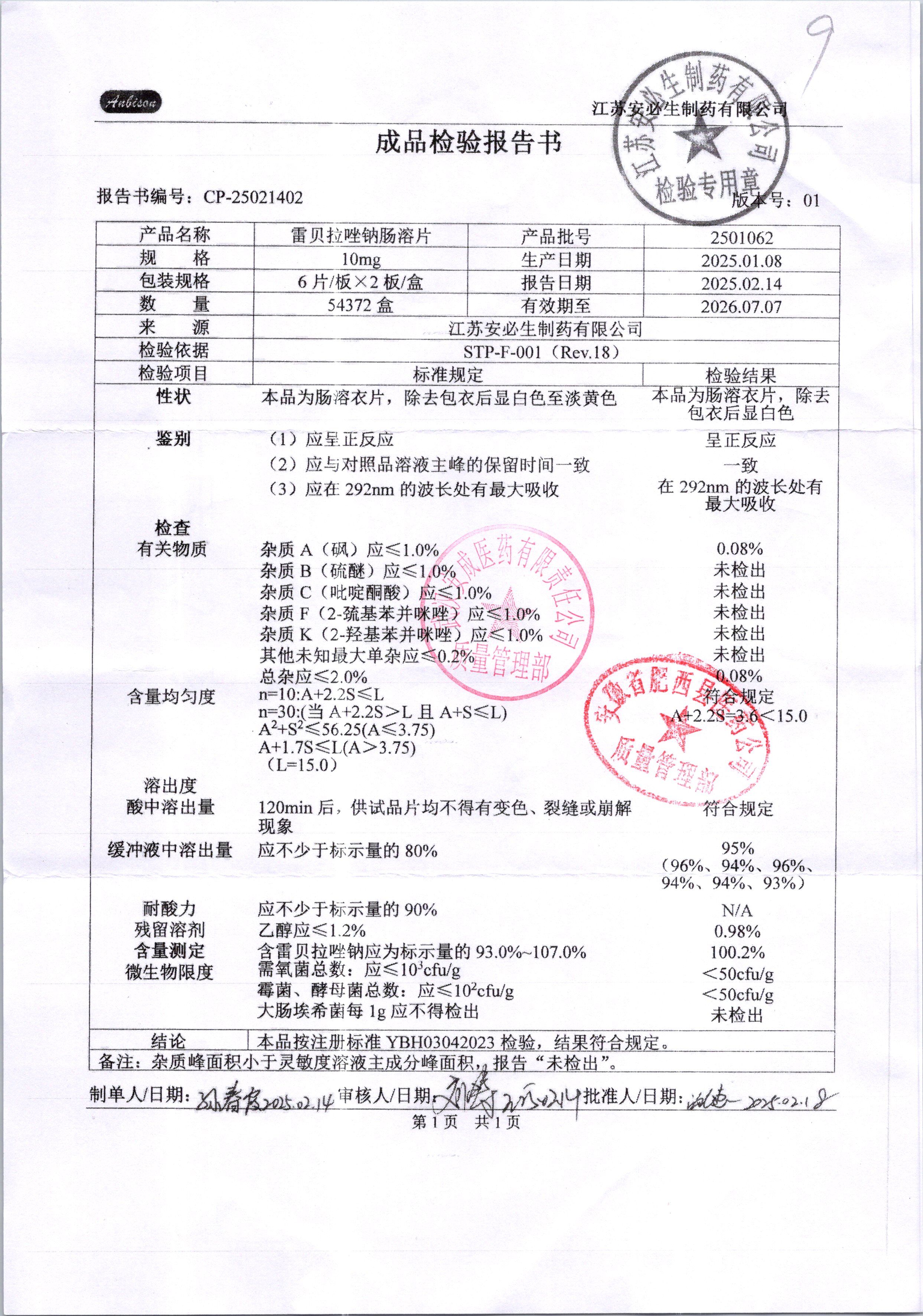 雷貝拉唑鈉腸溶片 20mg*12片 2501012 查看詳情
