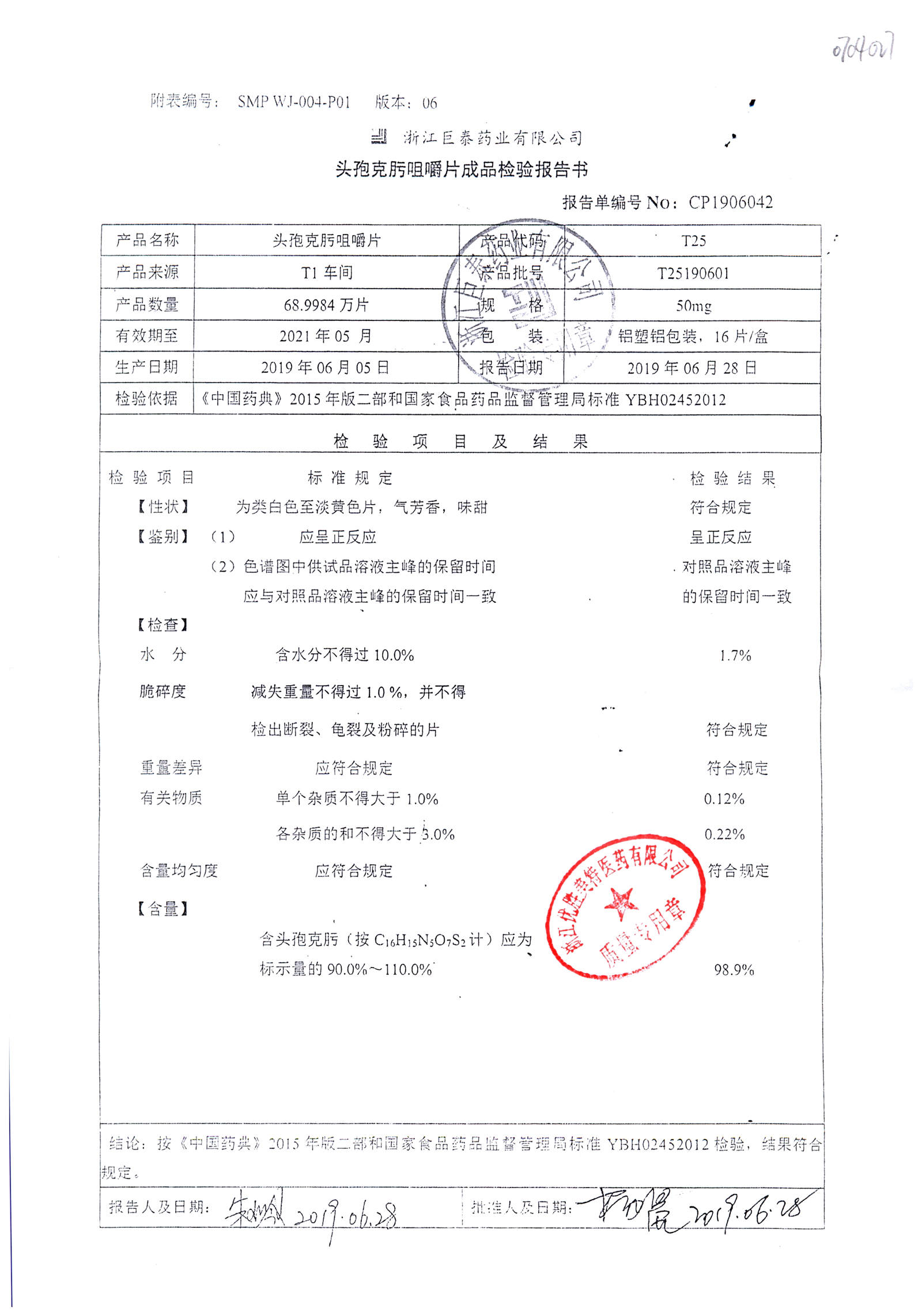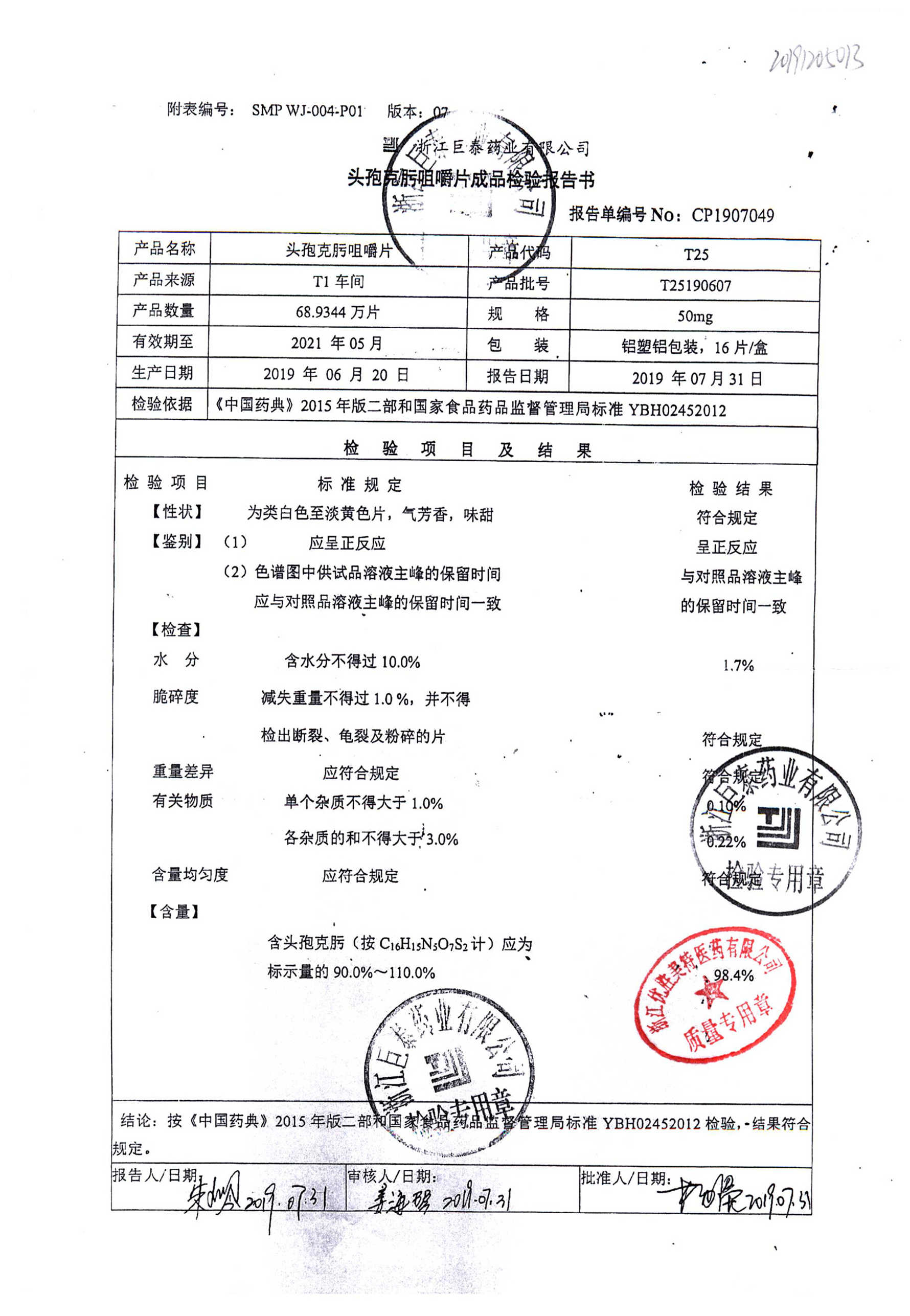 | 頭孢克肟咀嚼片 | 50mg*16s | T25190201 | 查看詳情 |