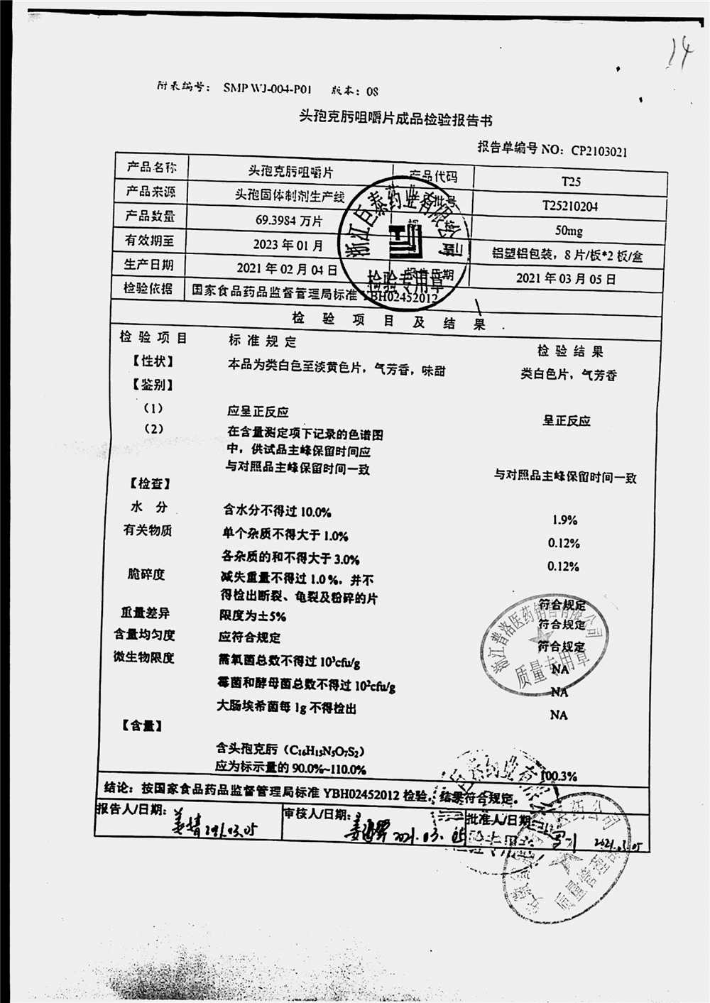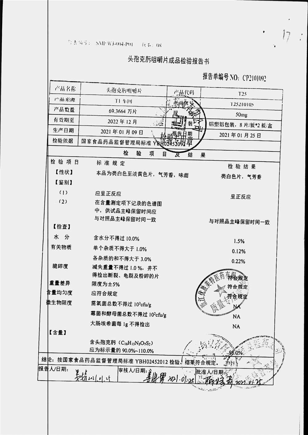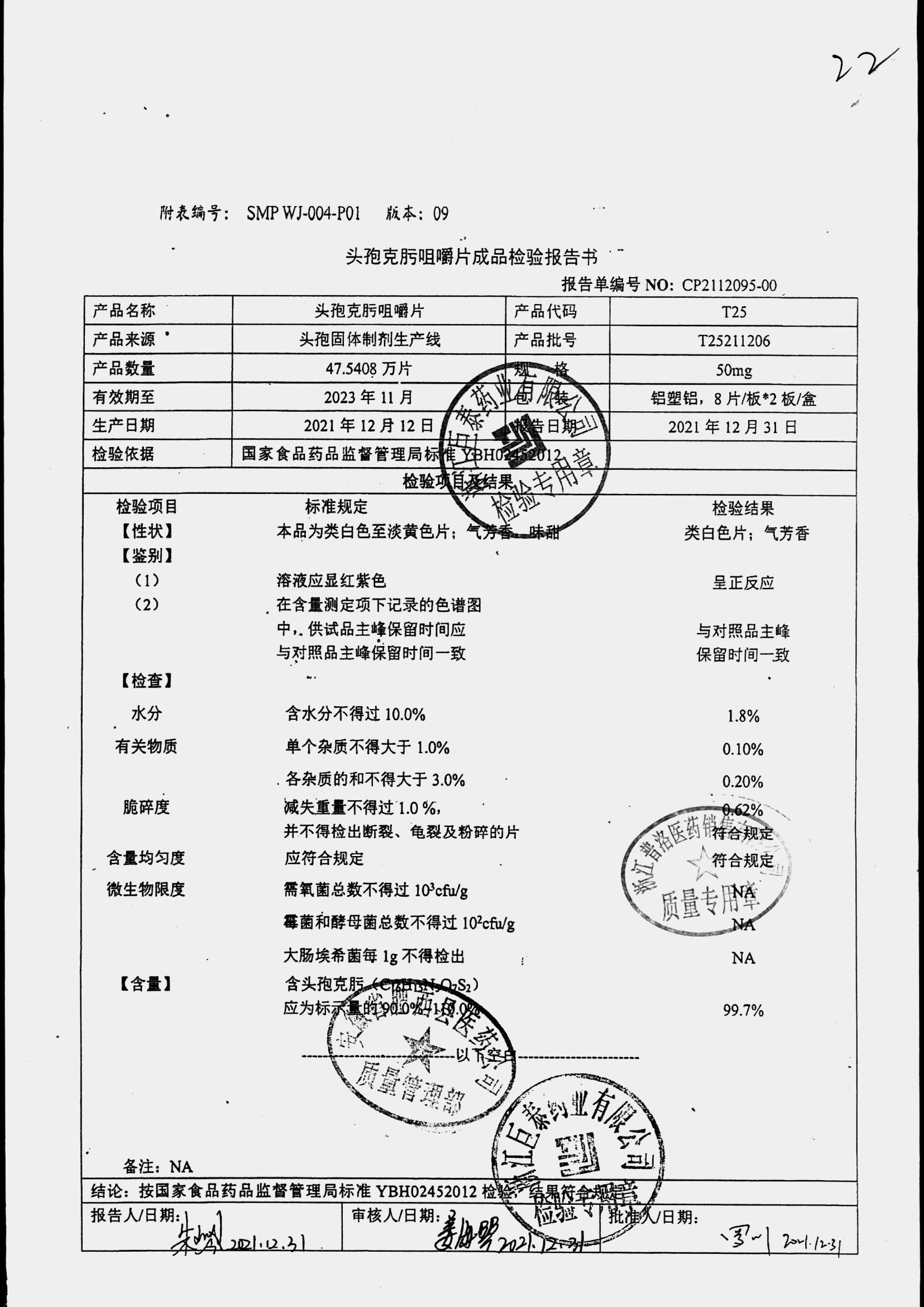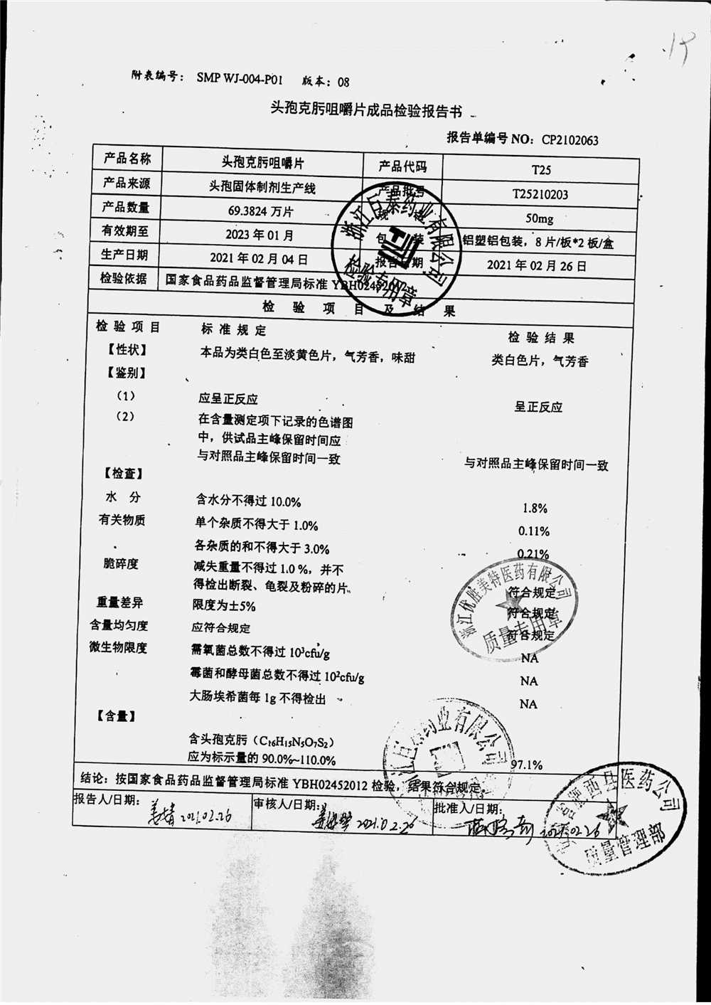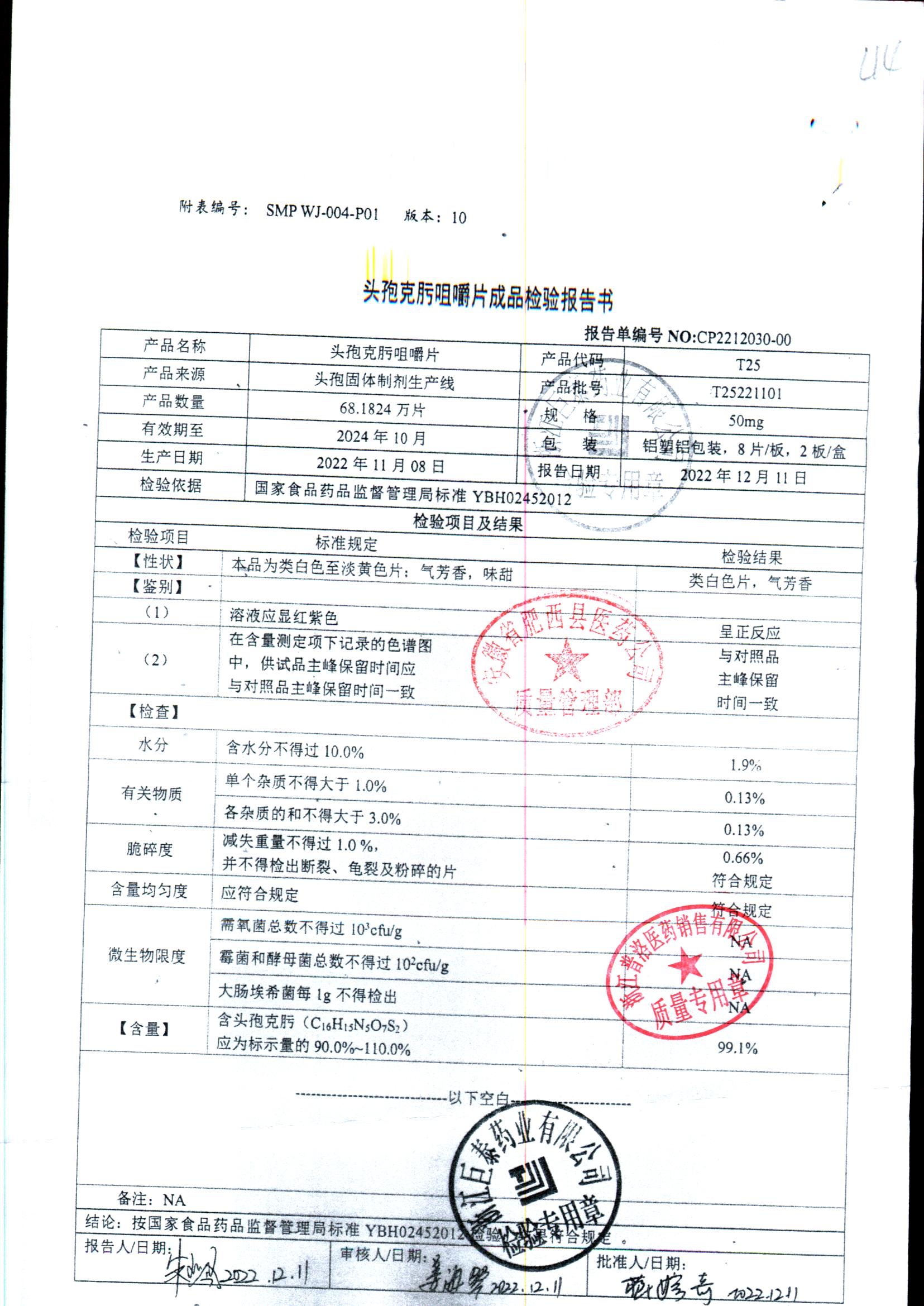 | 頭孢克肟咀嚼片 | 50mg*16s | T25220201/1 | 查看詳情 |