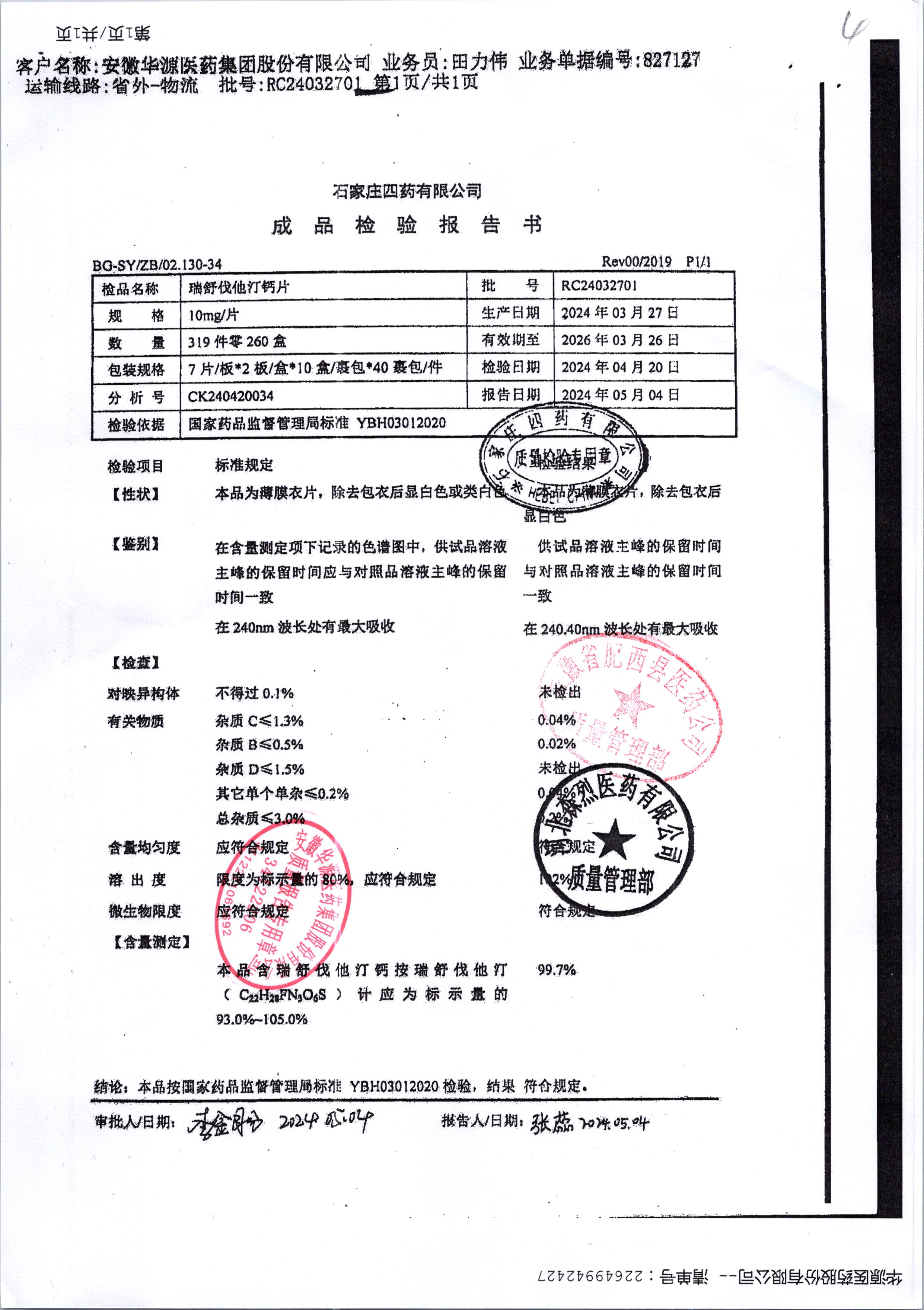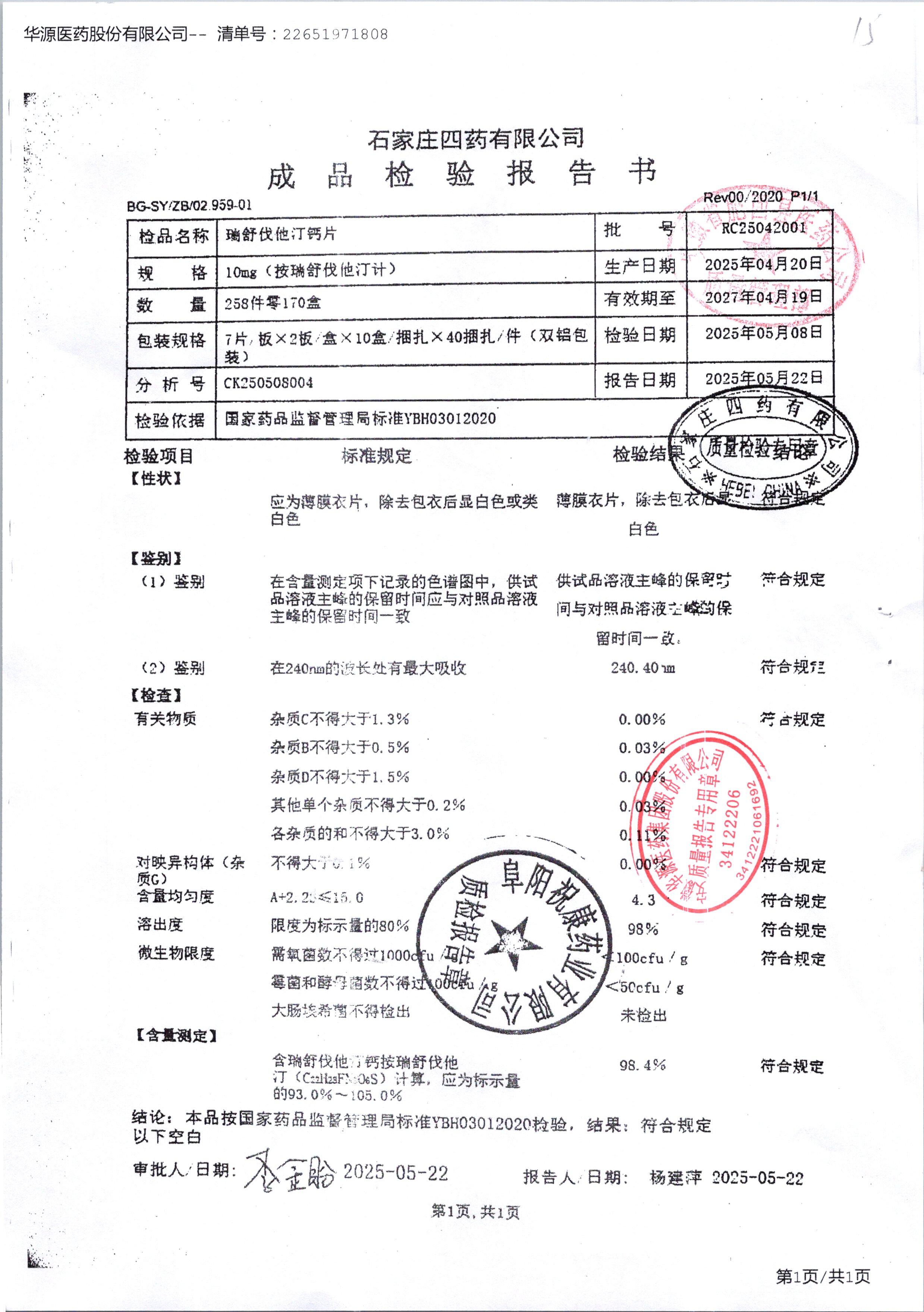 瑞舒伐他汀鈣片 10mg RC24032701 查看詳情