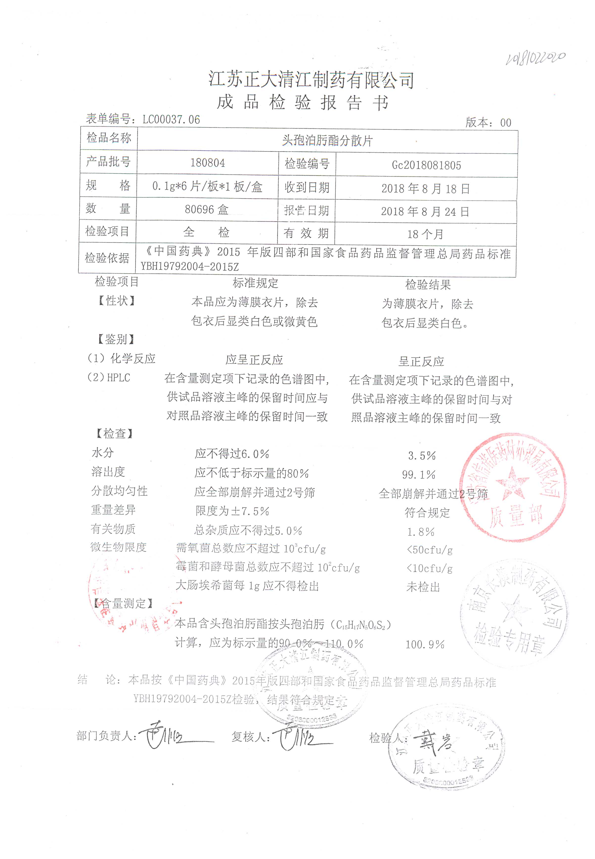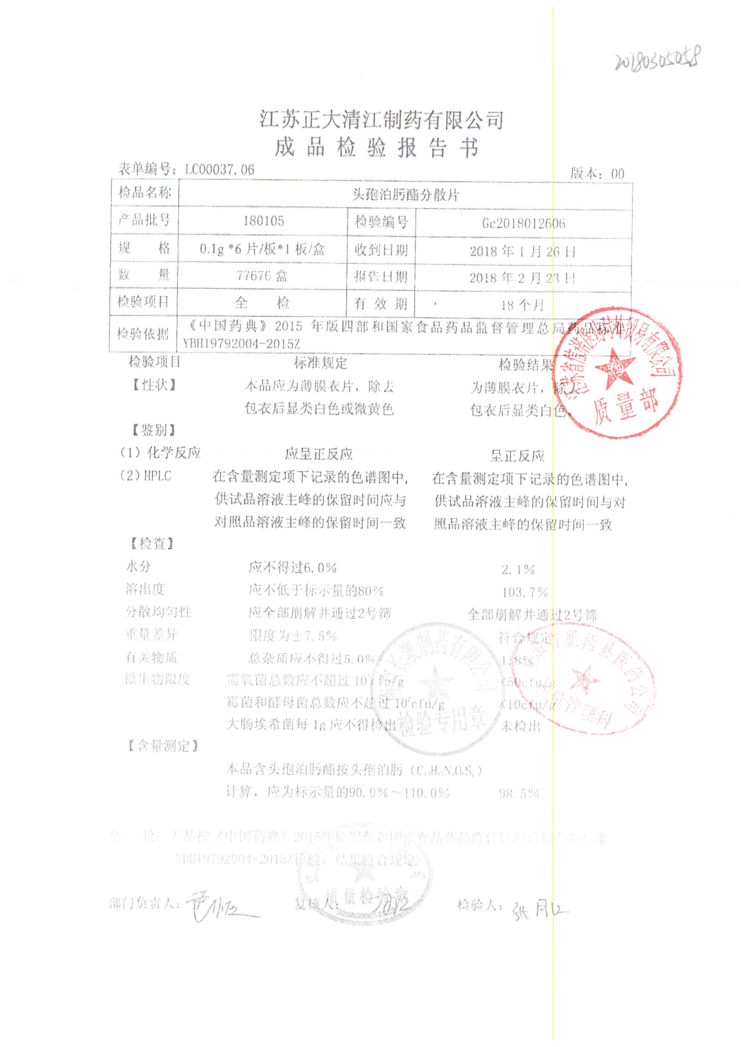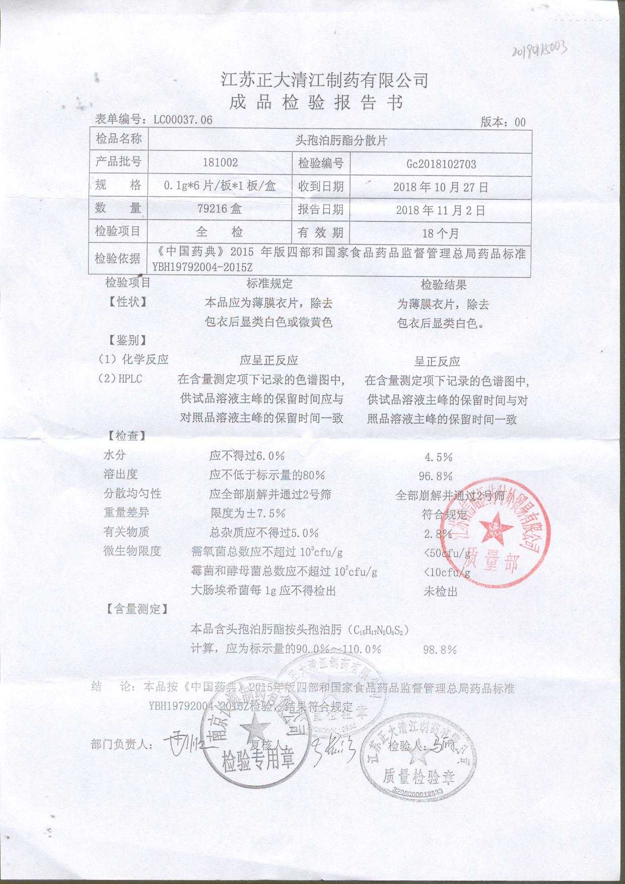 | 頭孢泊肟酯分散片 | 0.1g*6s | 180804 | 查看詳情 |