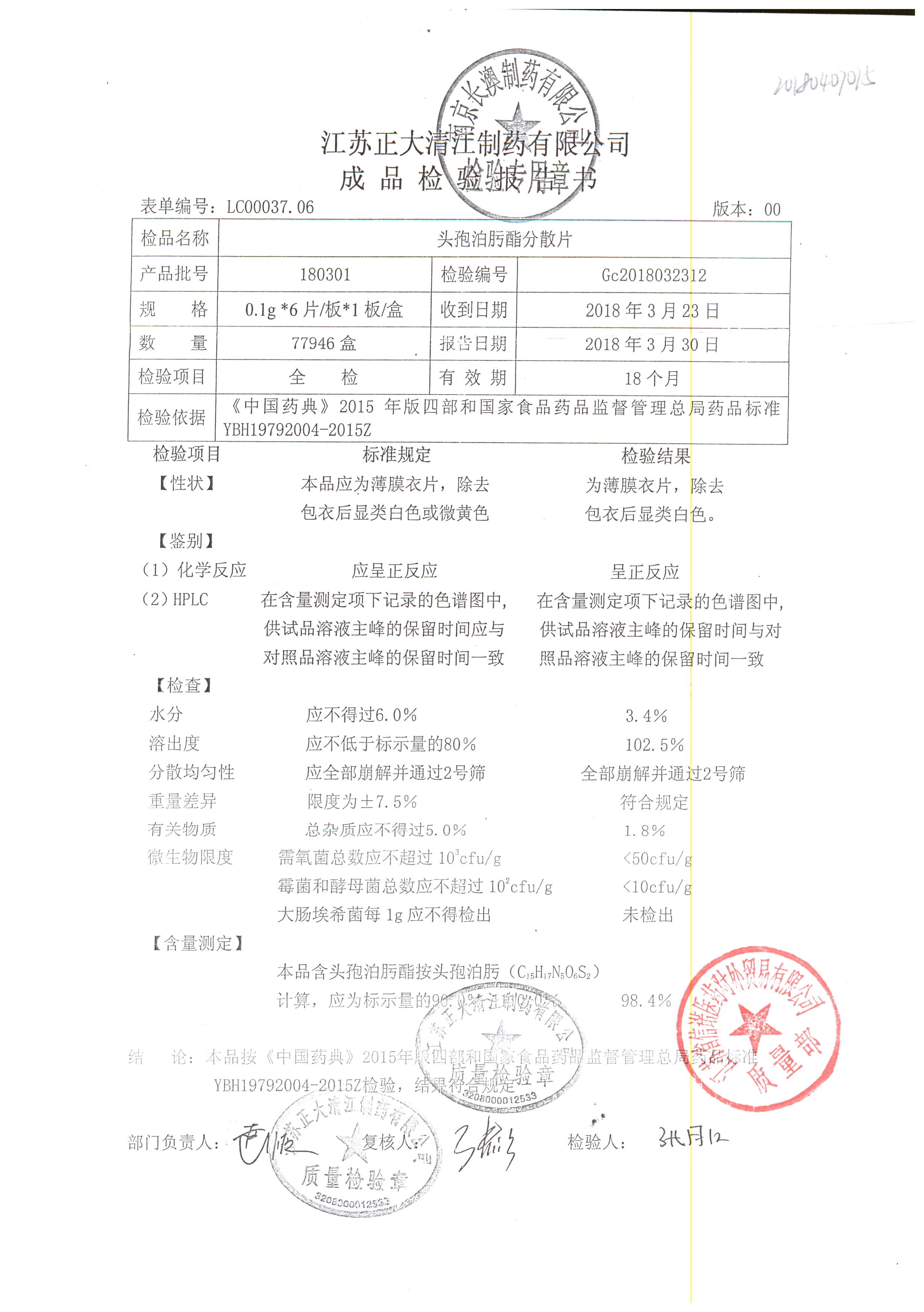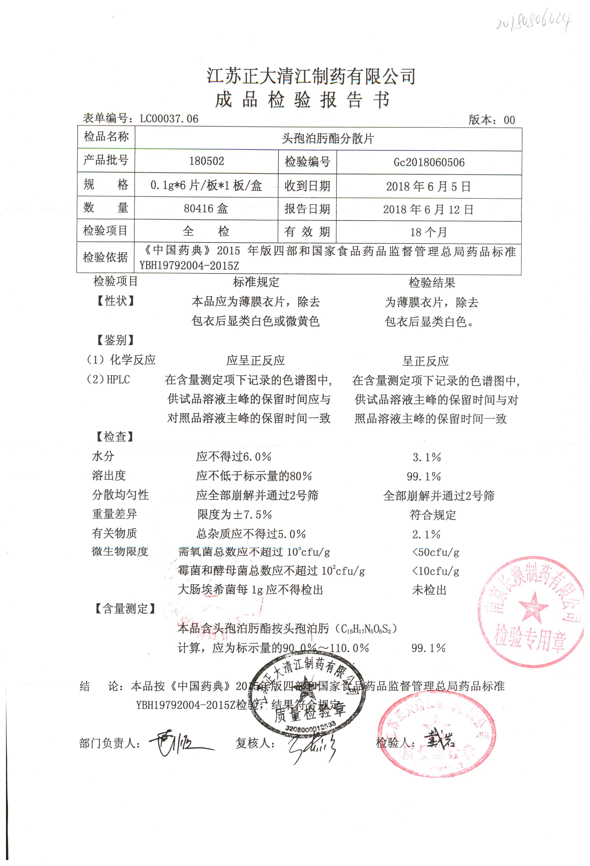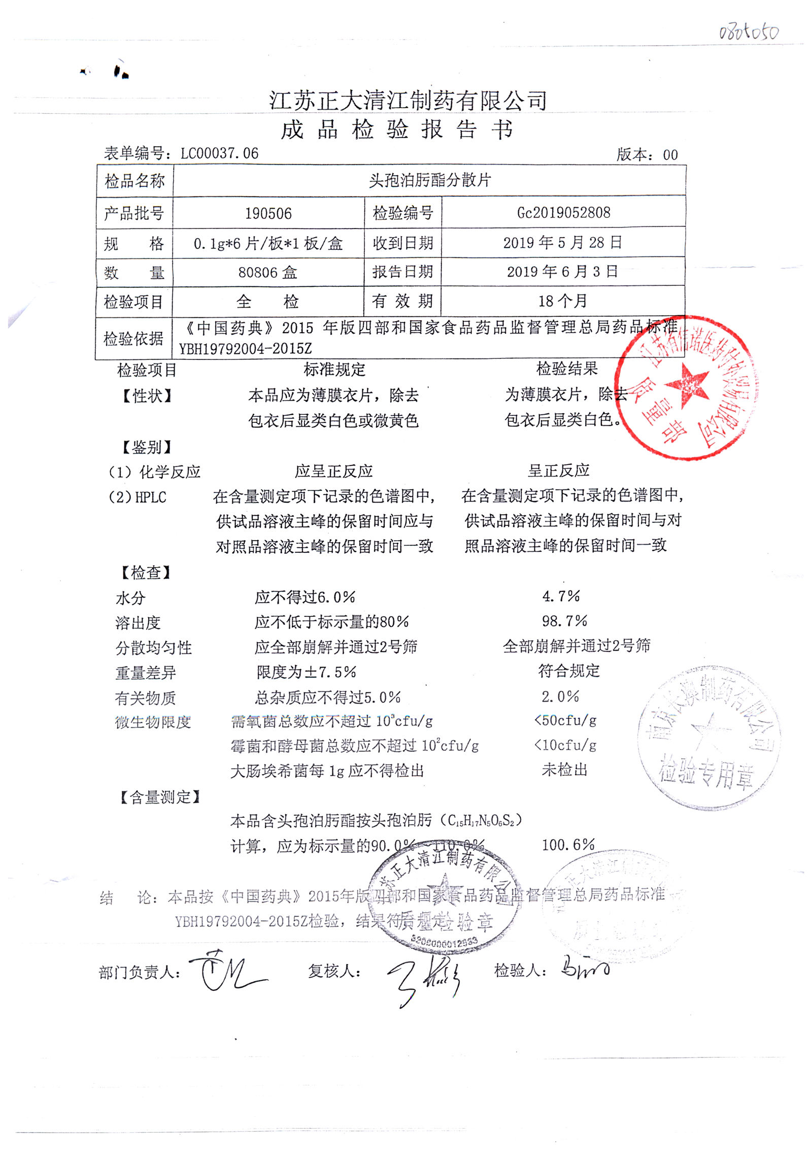 | 頭孢泊肟酯分散片 | 0.1g*6s | 180804 | 查看詳情 |