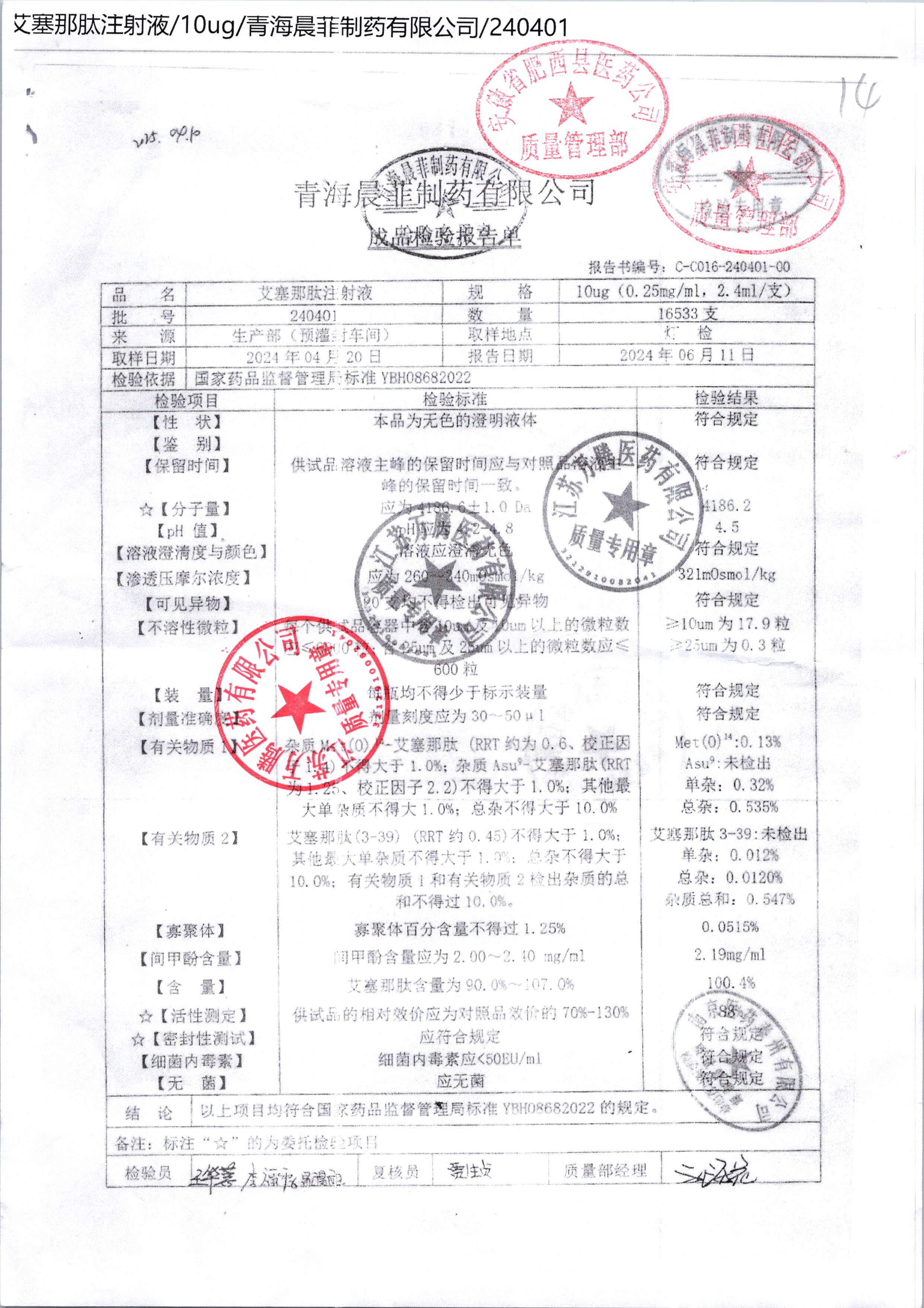 艾塞那肽注射液 10UP 240401 查看詳情