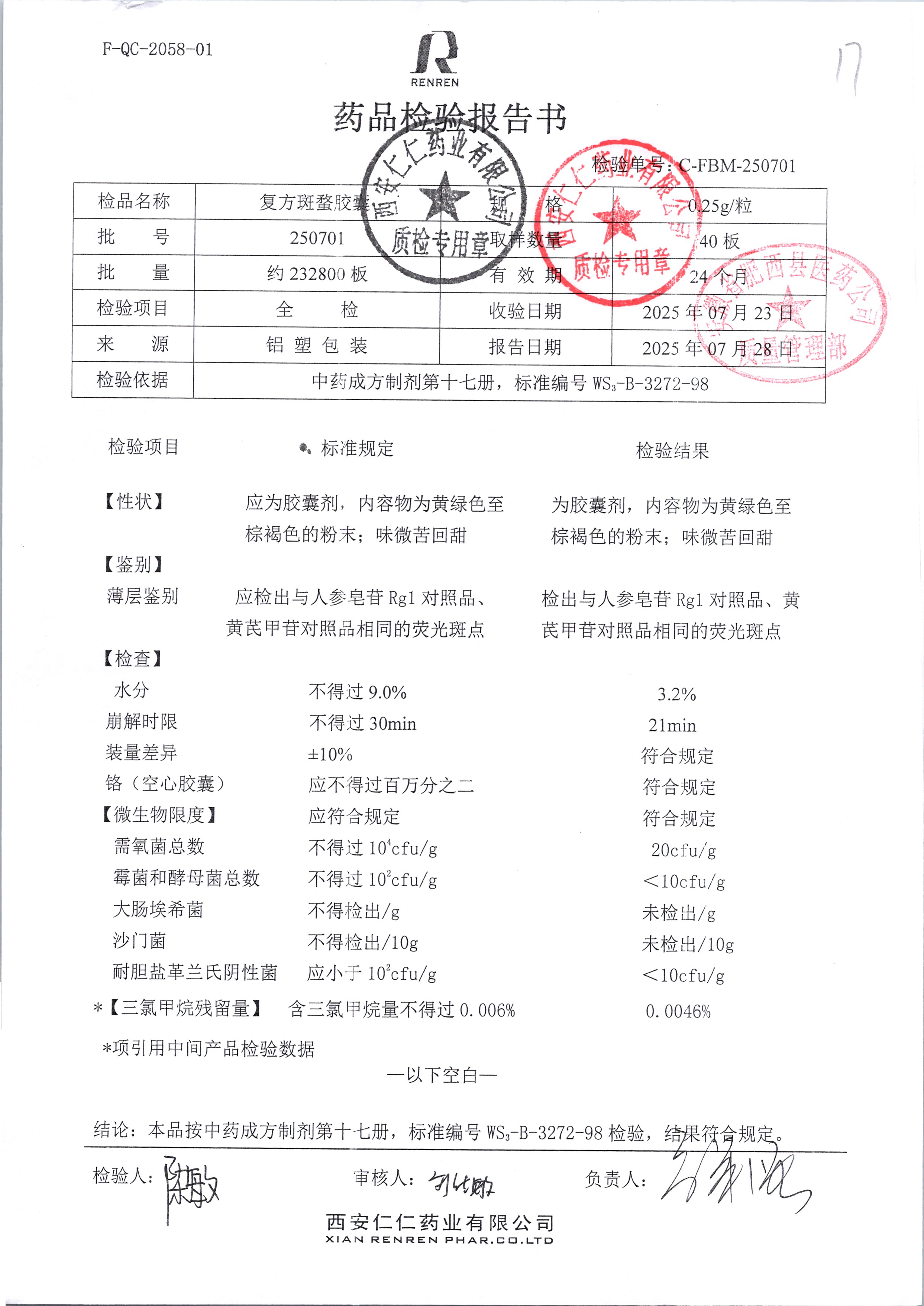 復方斑蝥膠囊 0.25g 250701 查看詳情