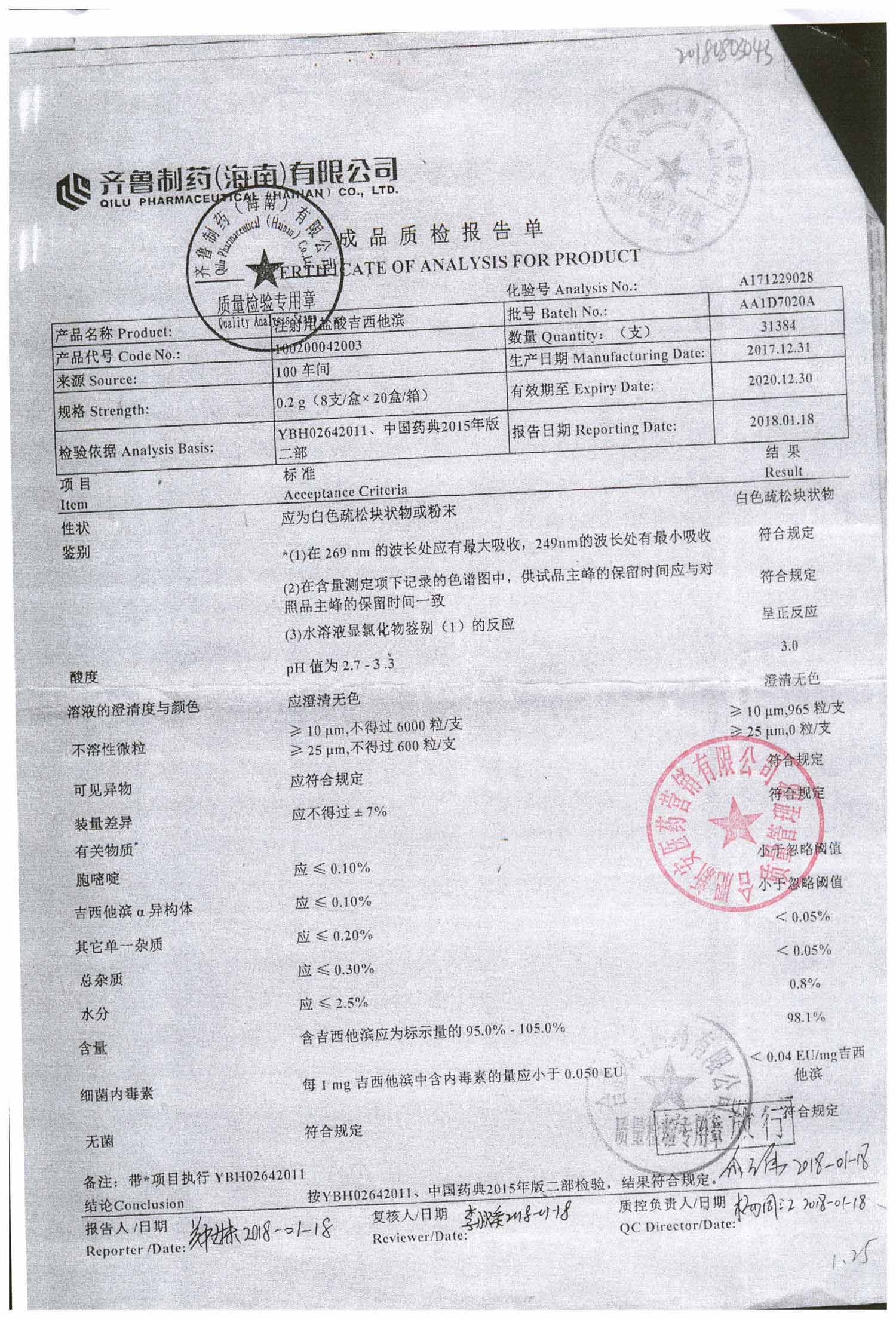 注射用鹽酸吉西他濱 0.2g*8支 AA1D7020A 查看詳情
