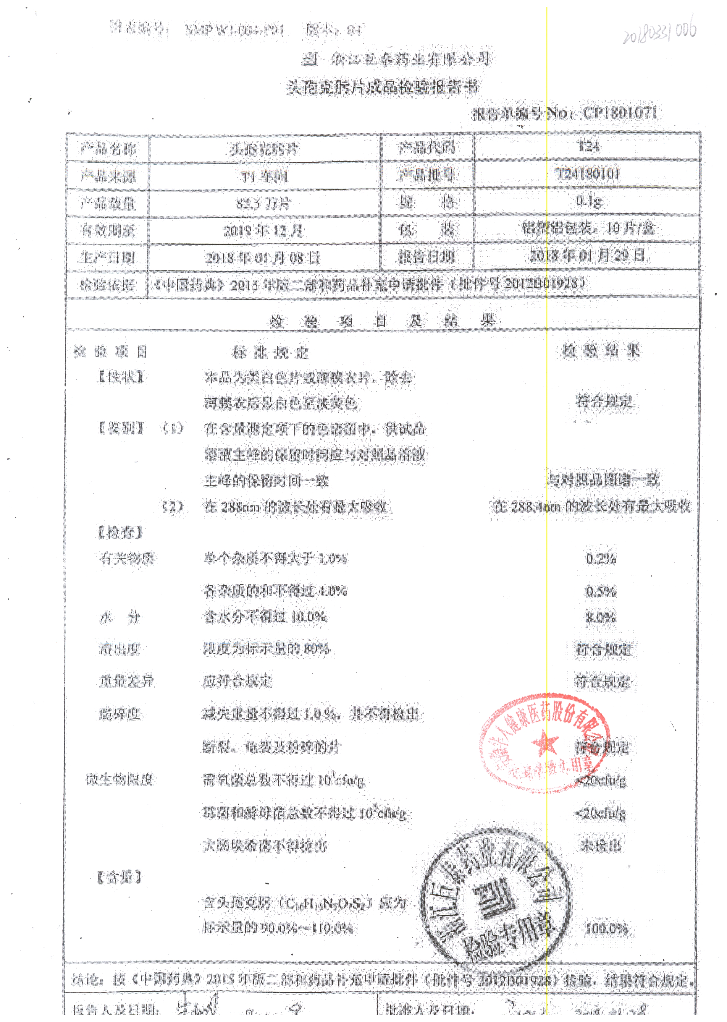 | 頭孢克肟片 | 0.1g*10s | T24181101 | 查看詳情 |