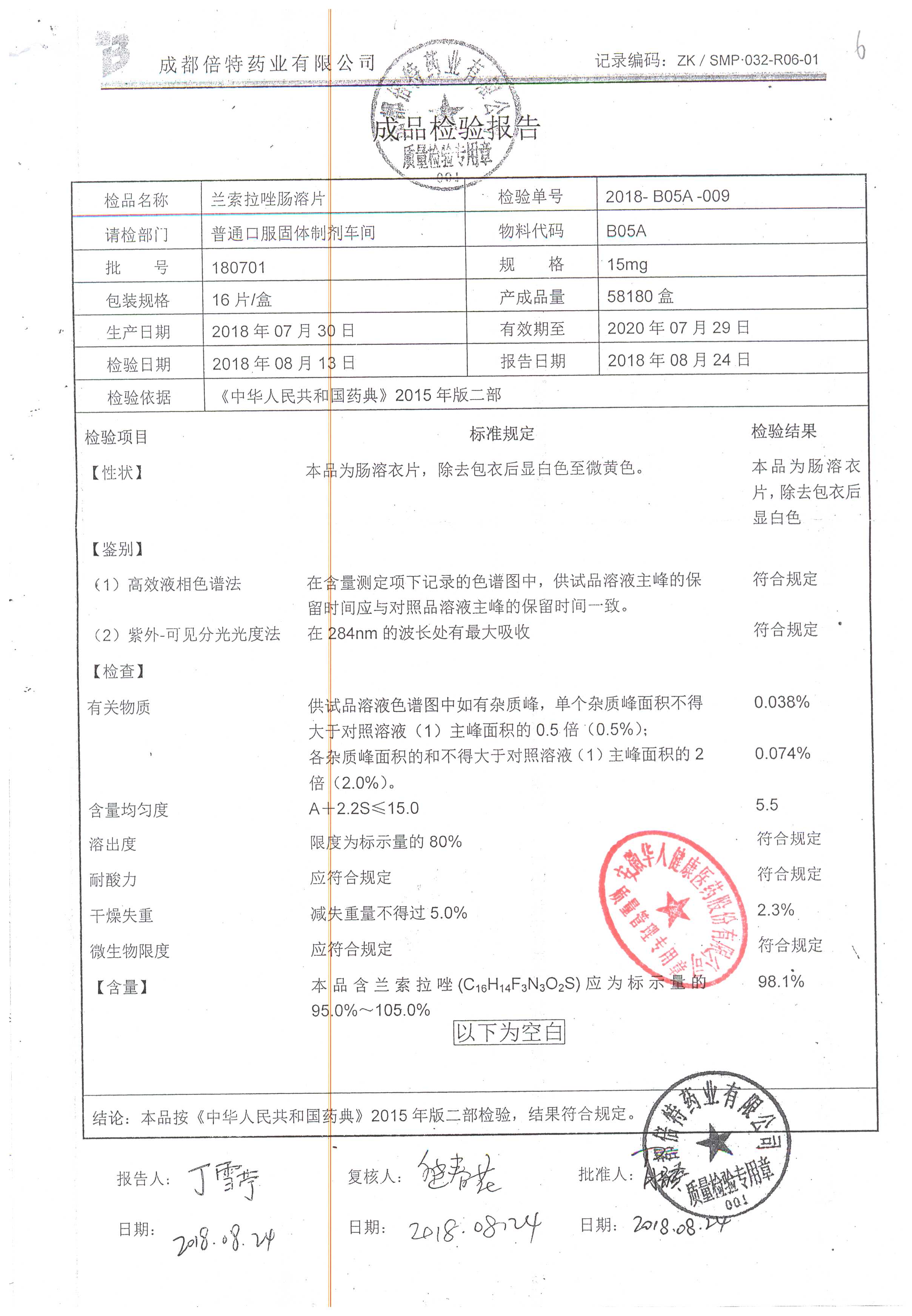 蘭索拉唑腸溶片 15mg*16s 180701 查看詳情