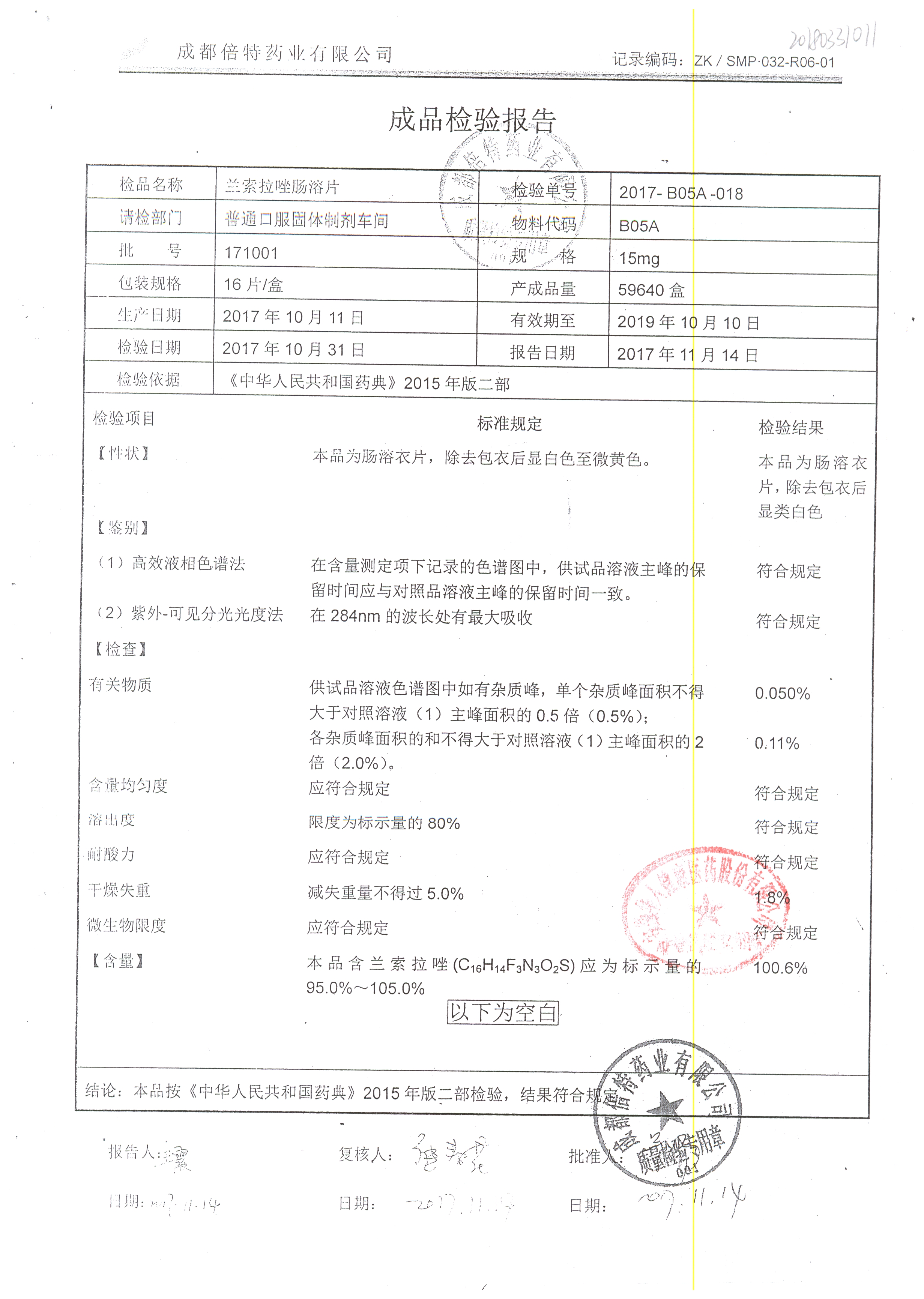 蘭索拉唑腸溶片 15mg*16s 171001 查看詳情