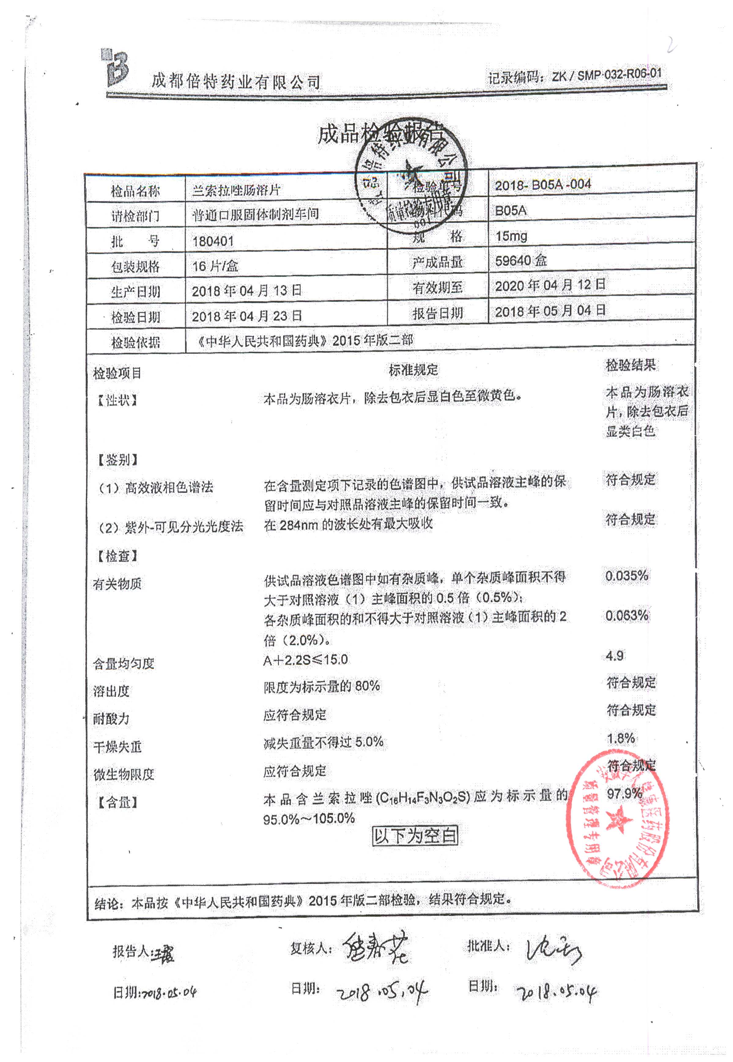 蘭索拉唑腸溶片 15mg*16s 180401 查看詳情