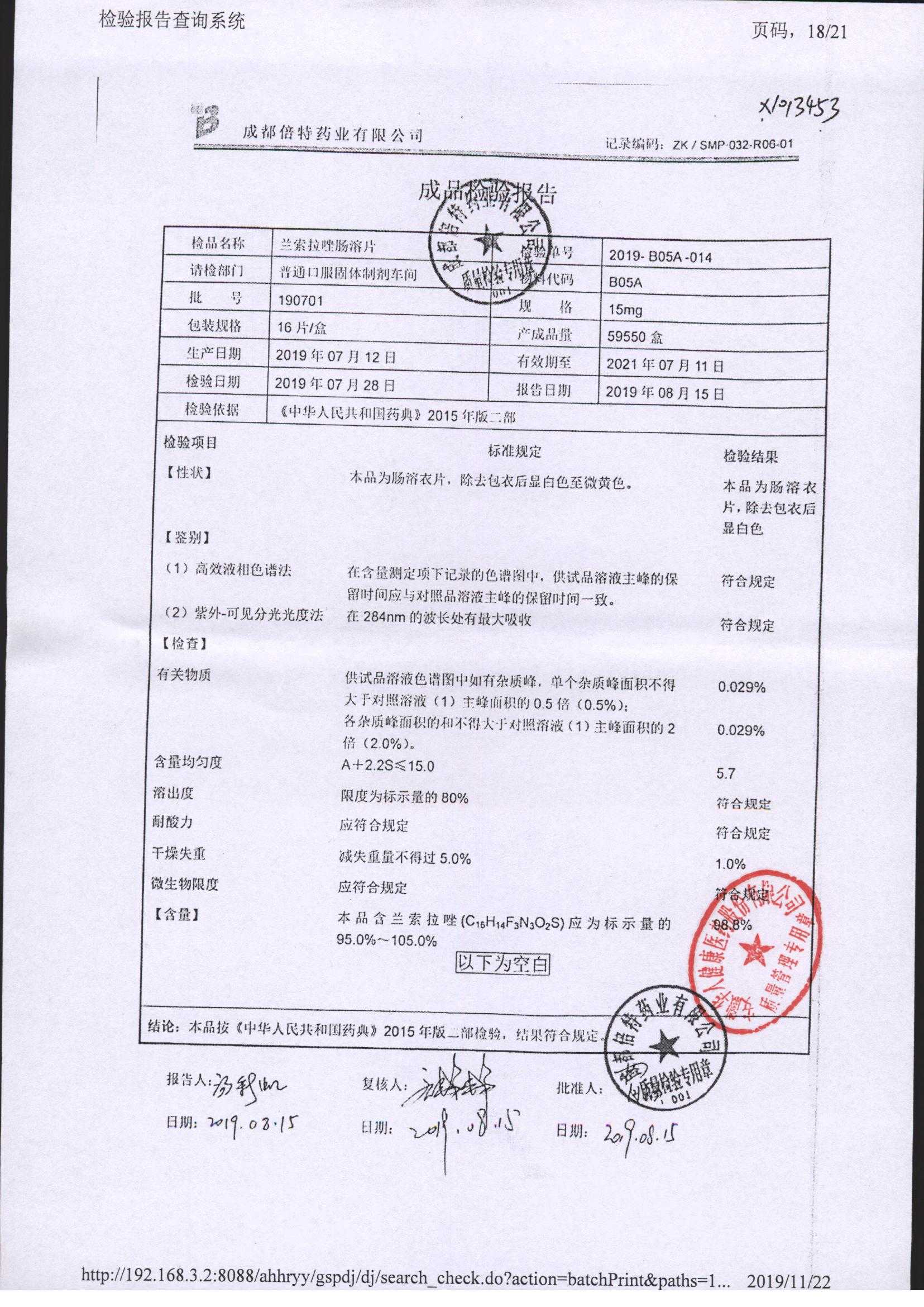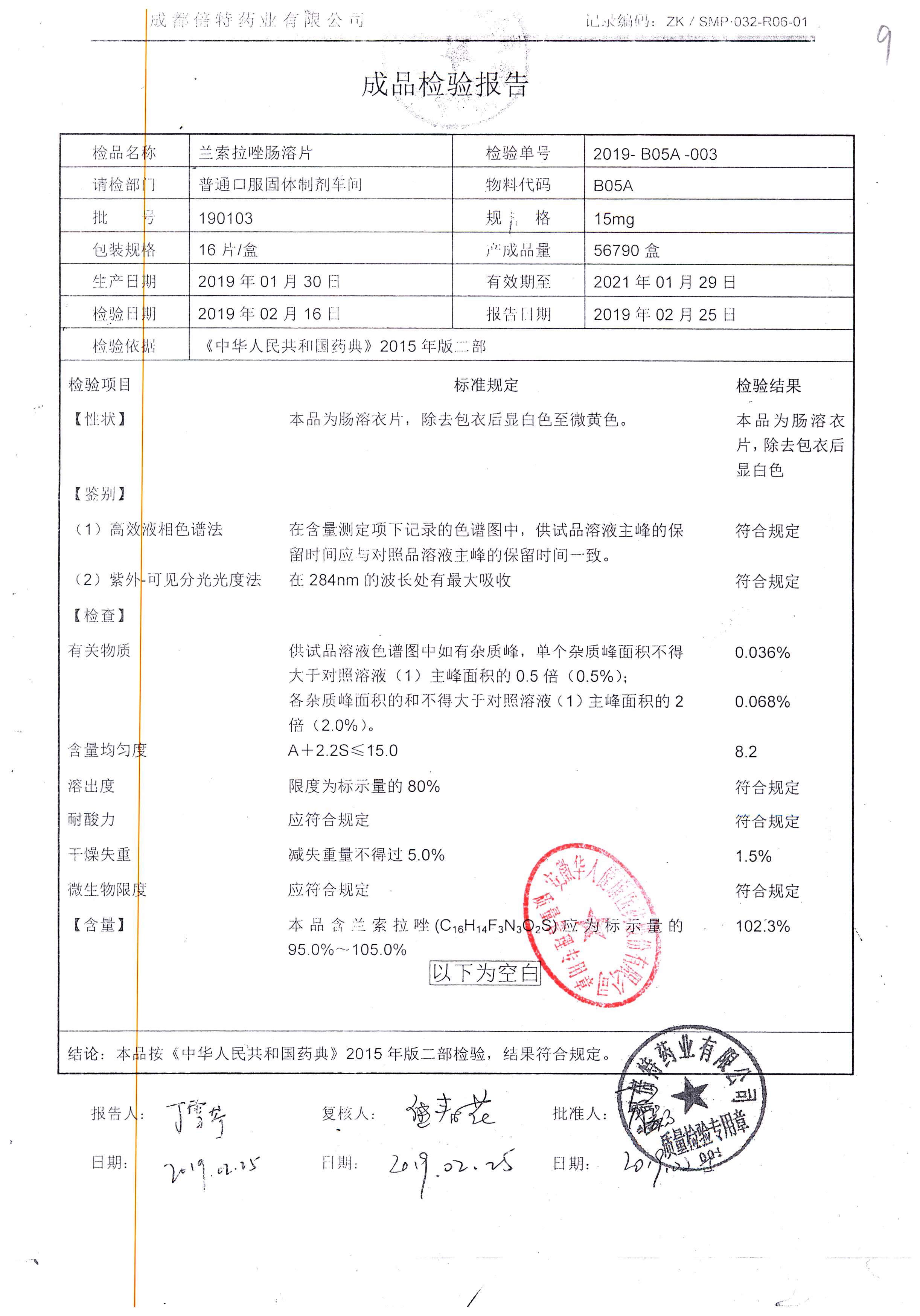 蘭索拉唑腸溶片 15mg*16s 190103 查看詳情
