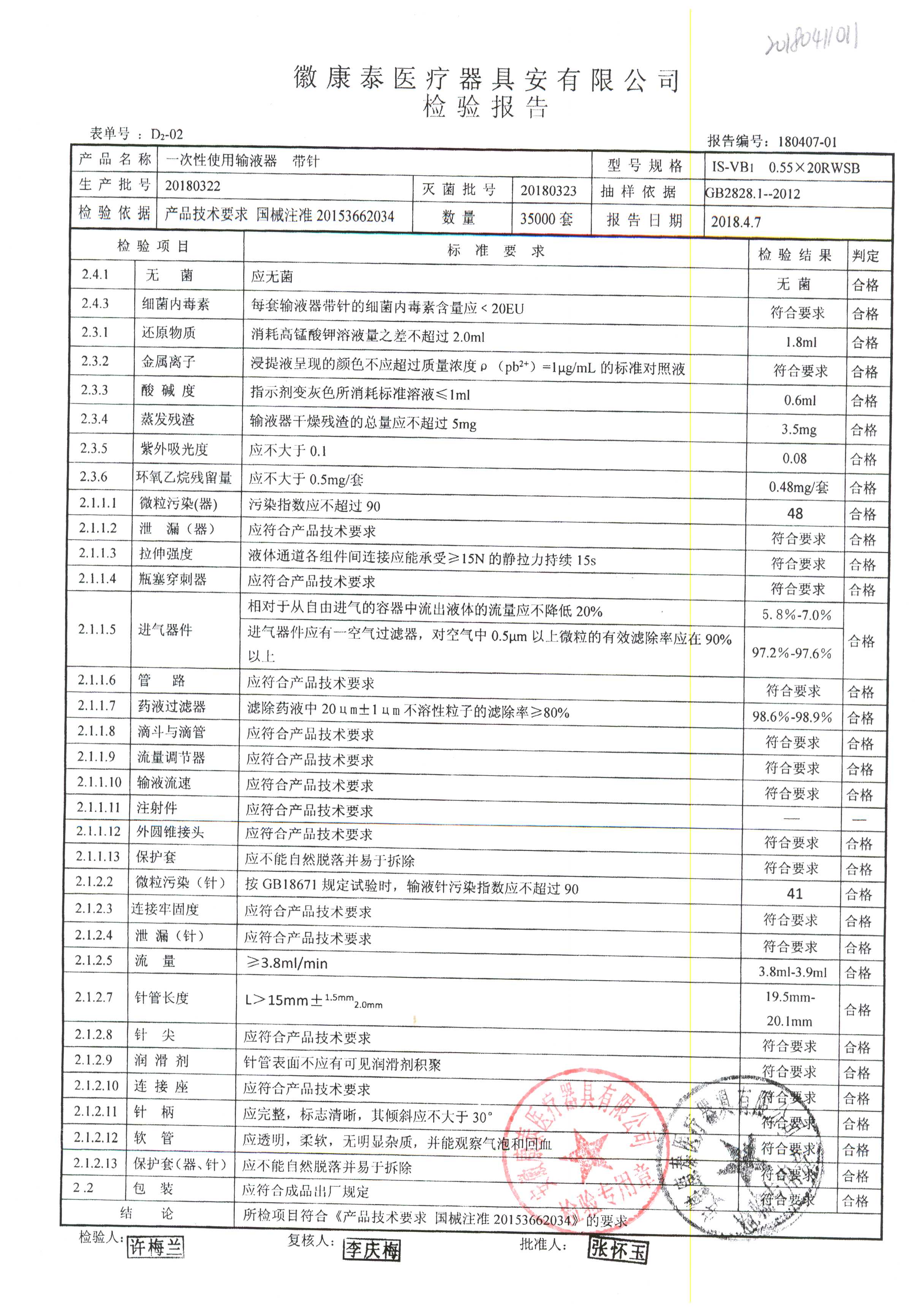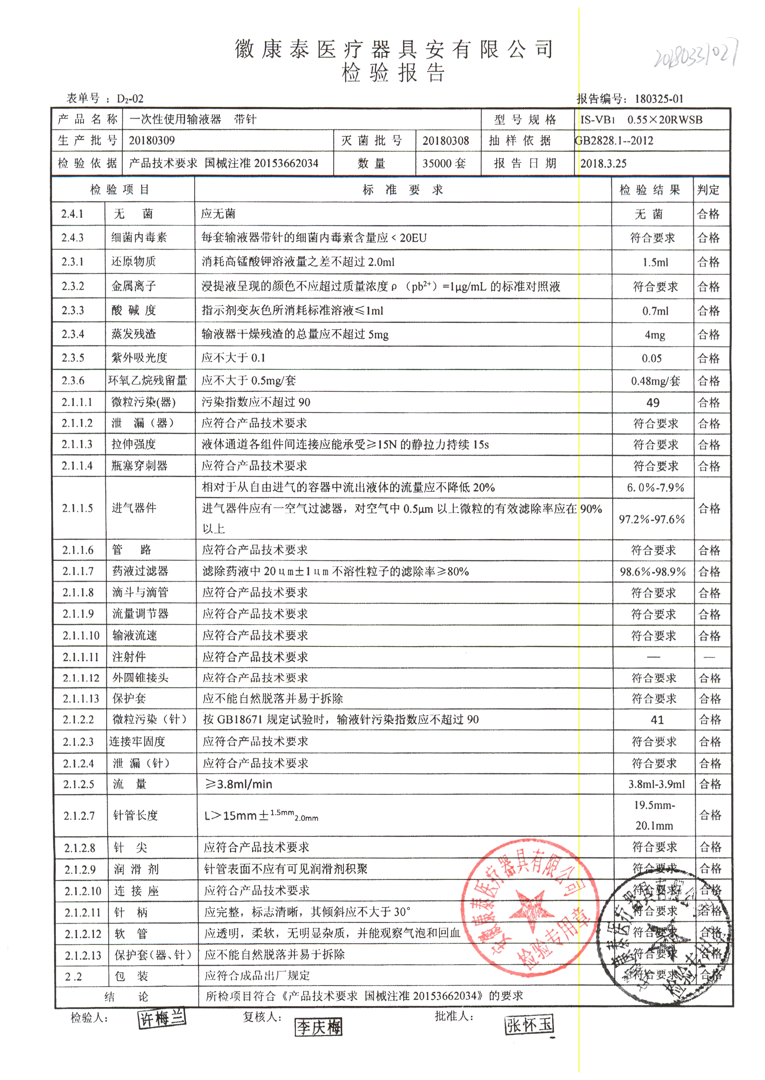 | 一次性使用輸液器 帶針 | 0.55*20RWSB | 20180203 | 查看詳情 |