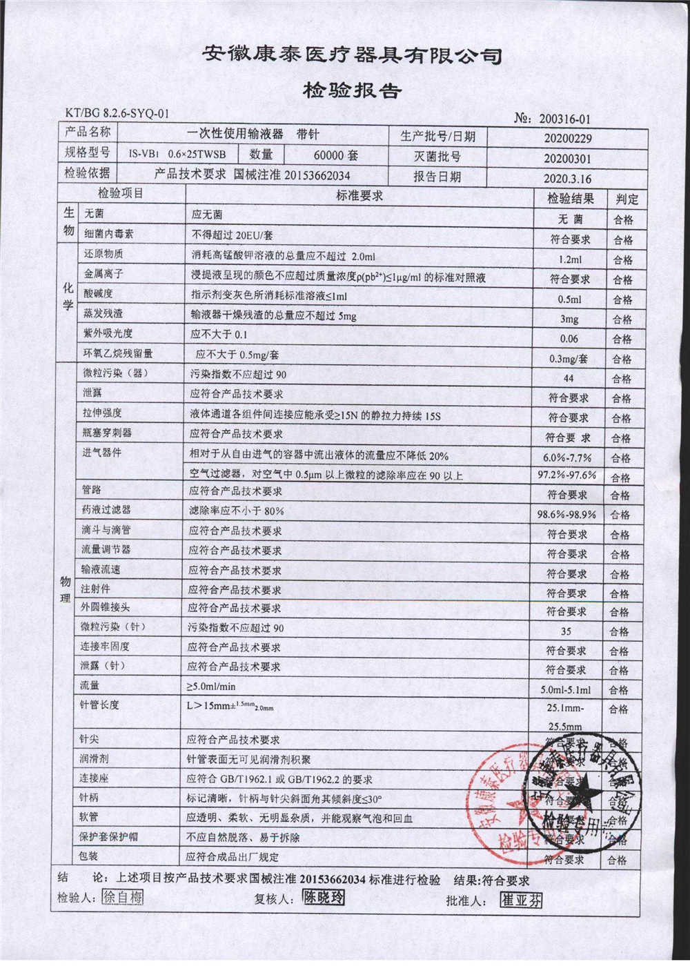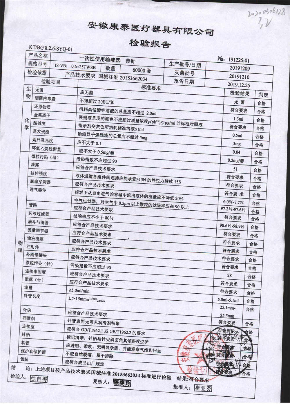 | 一次性使用輸液器 帶針 | 0.6*25TWSB | 20200320 | 查看詳情 |