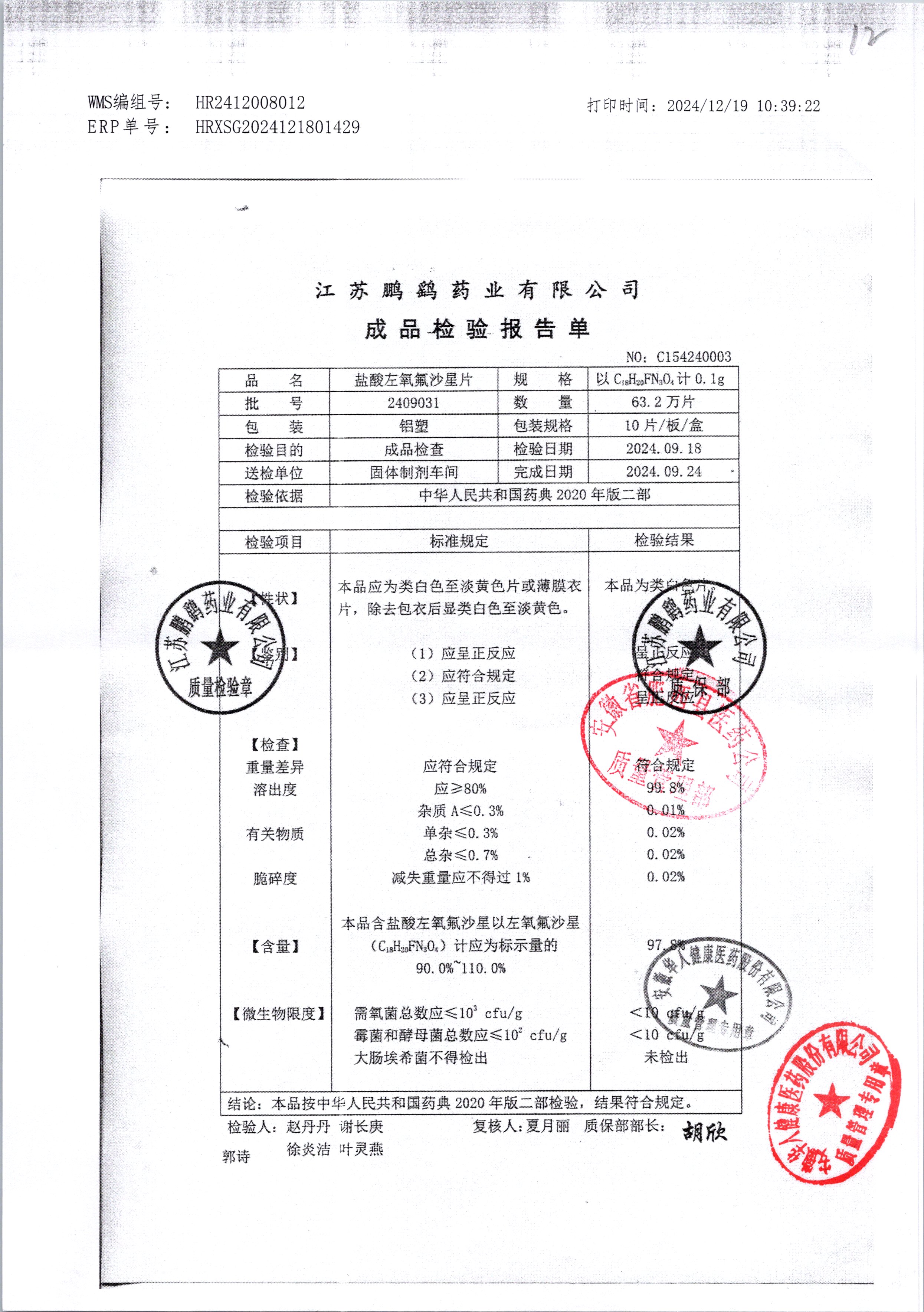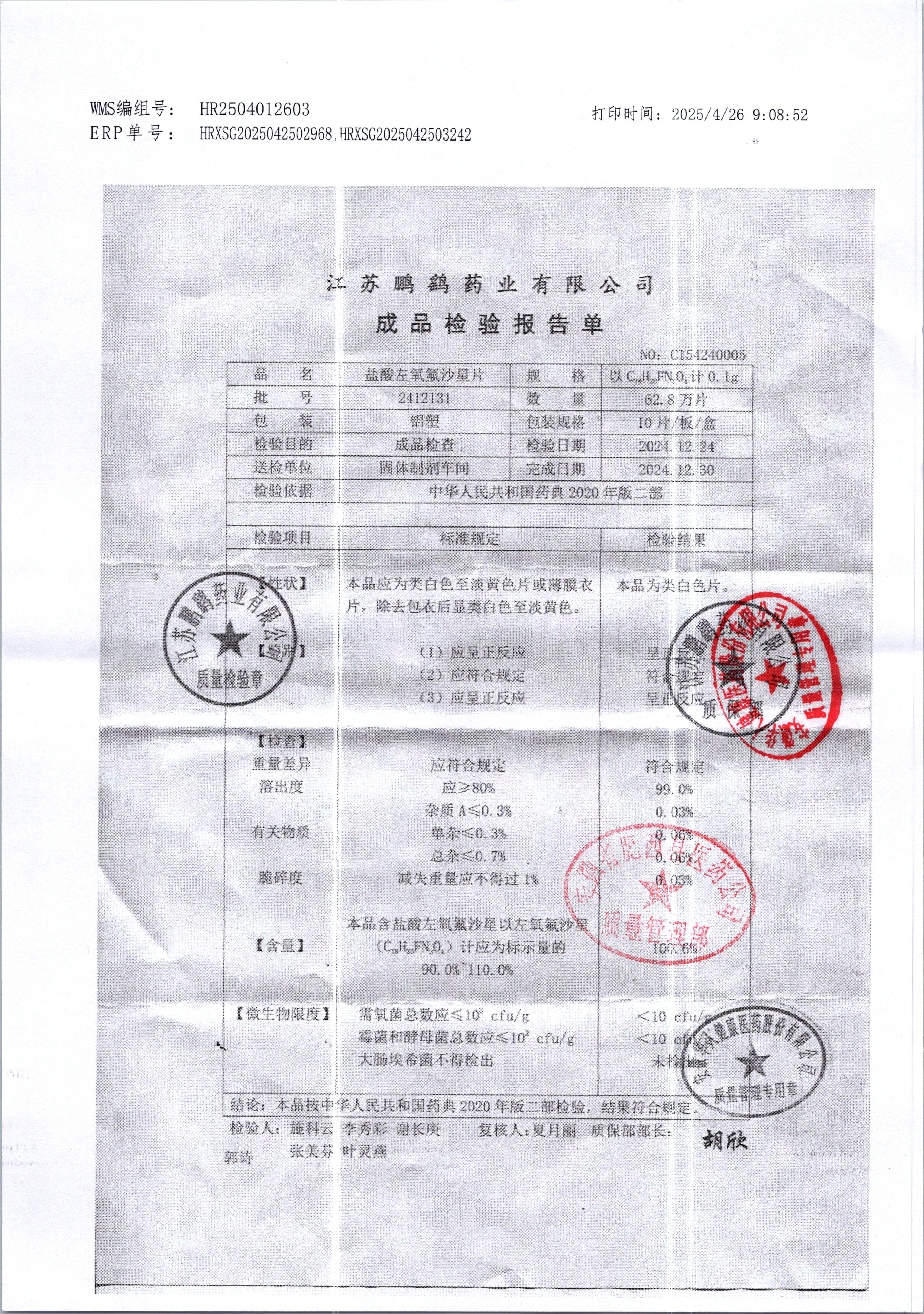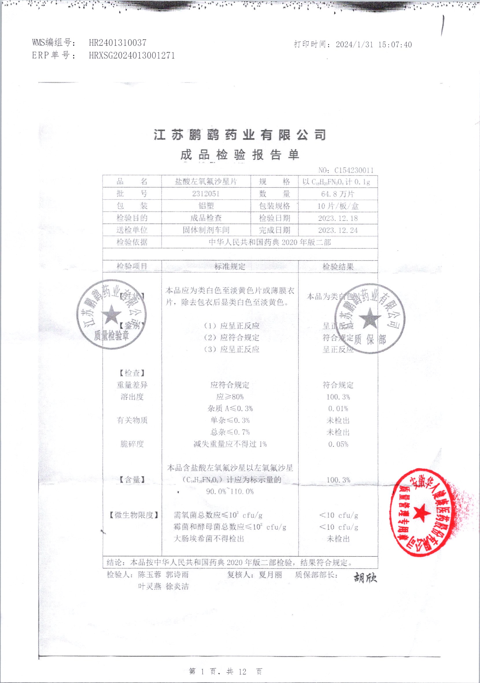 | 鹽酸左氧氟沙星片 | 16s | 2312051 | 查看詳情 |