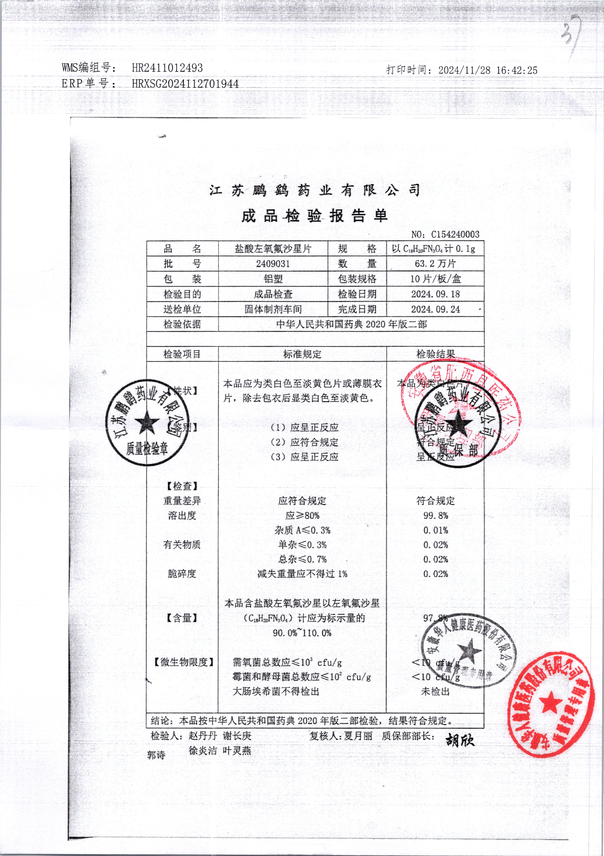 | 鹽酸左氧氟沙星片 | 16s | 2409031 | 查看詳情 |