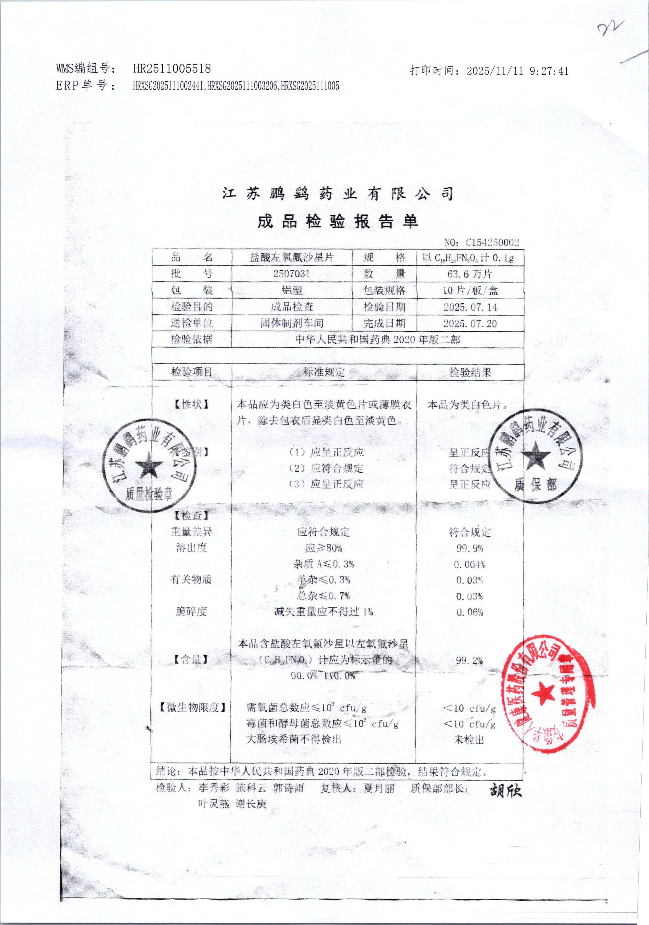 | 鹽酸左氧氟沙星片 | 16s | 2507031 | 查看詳情 |
