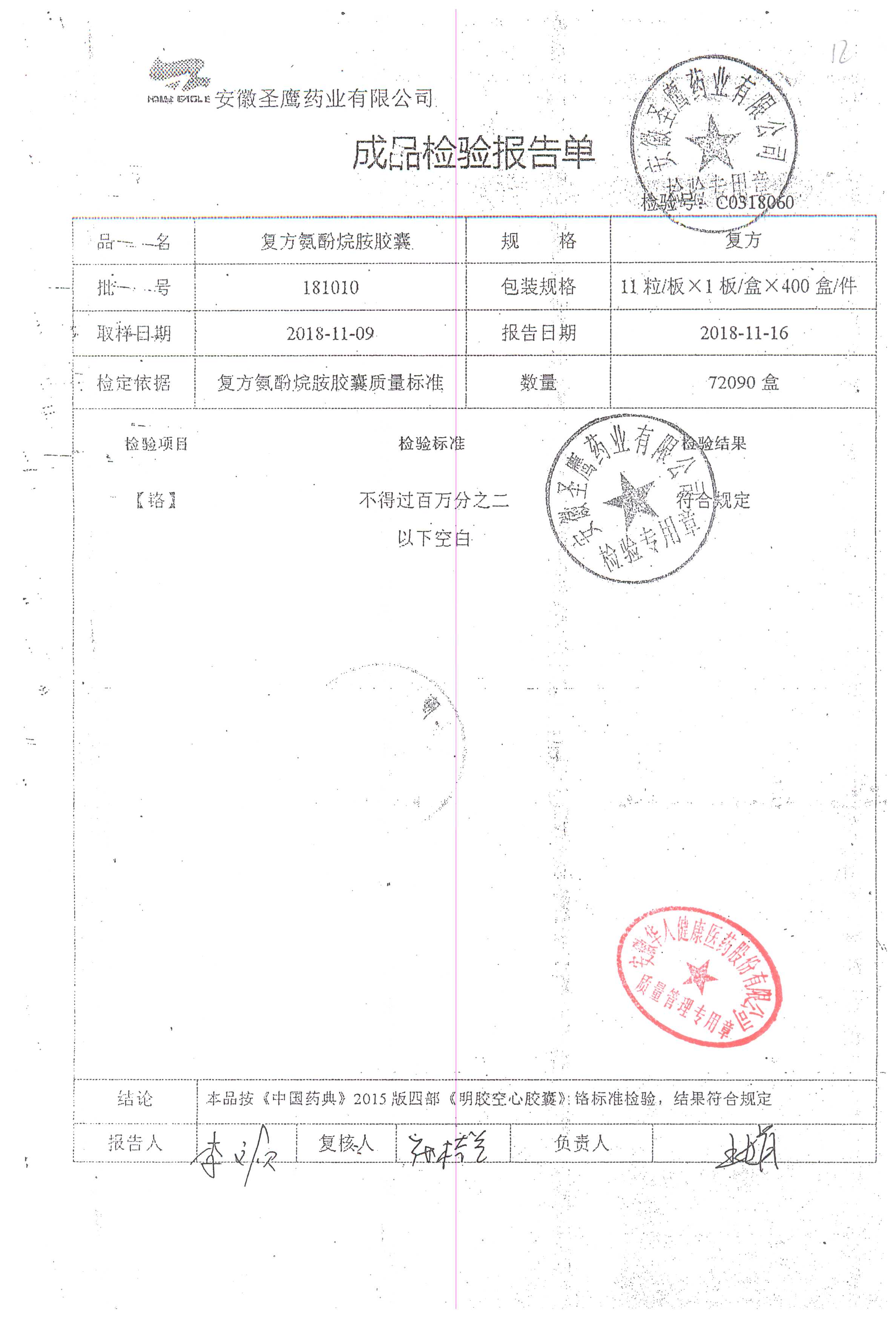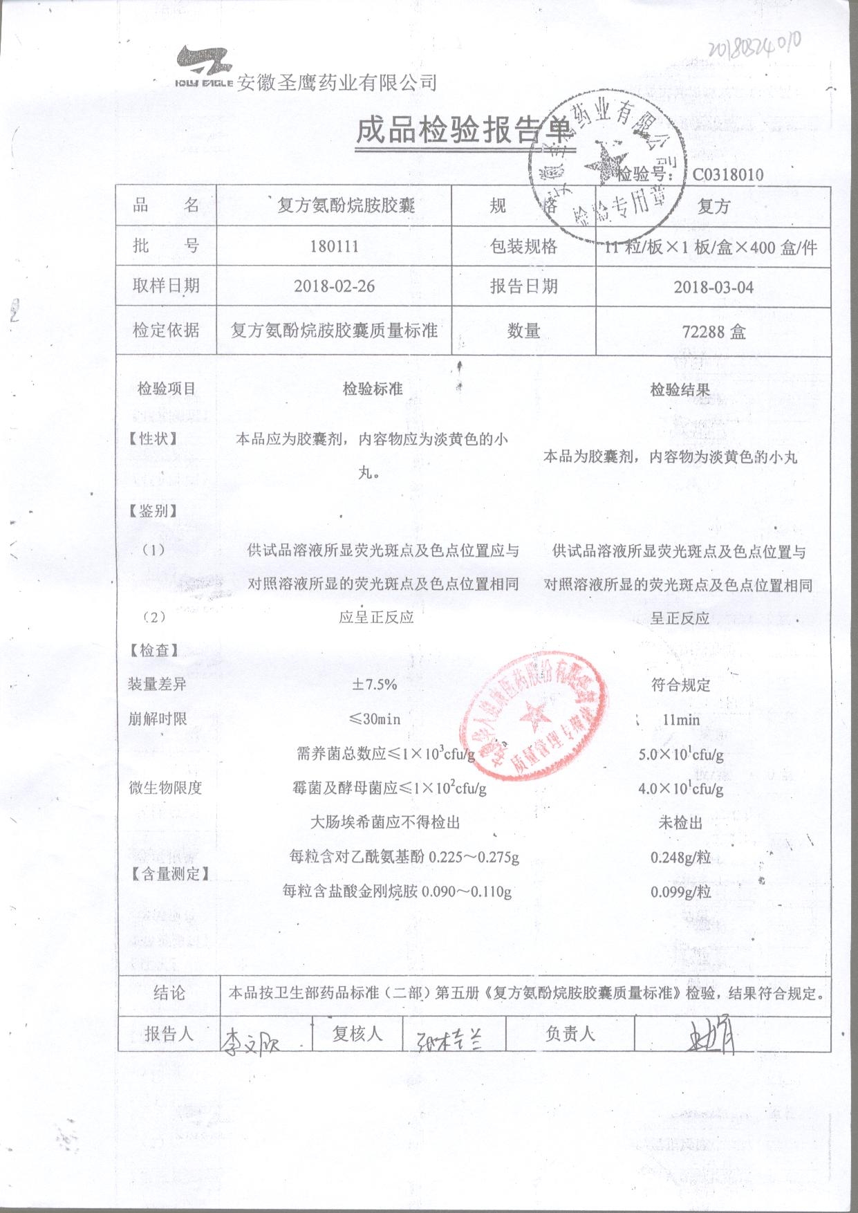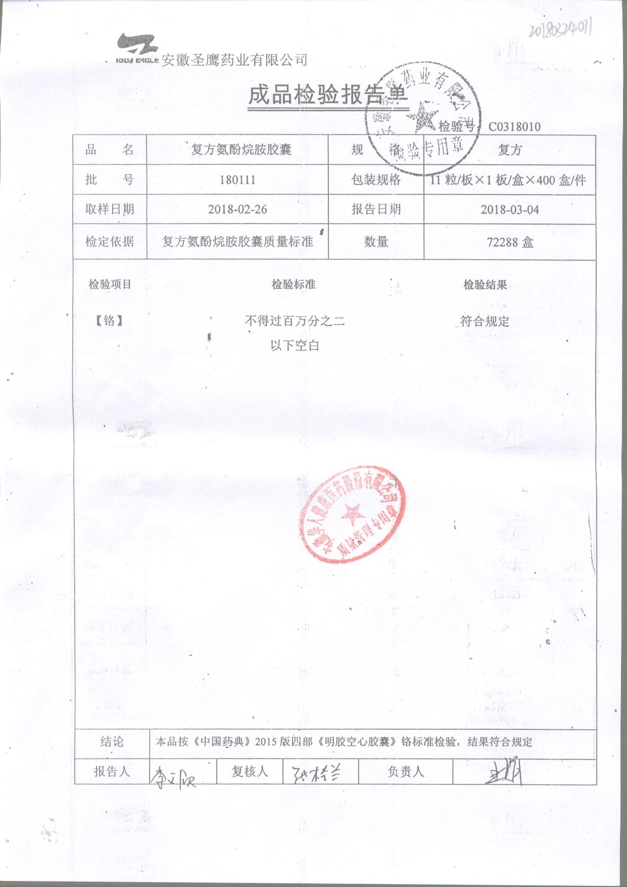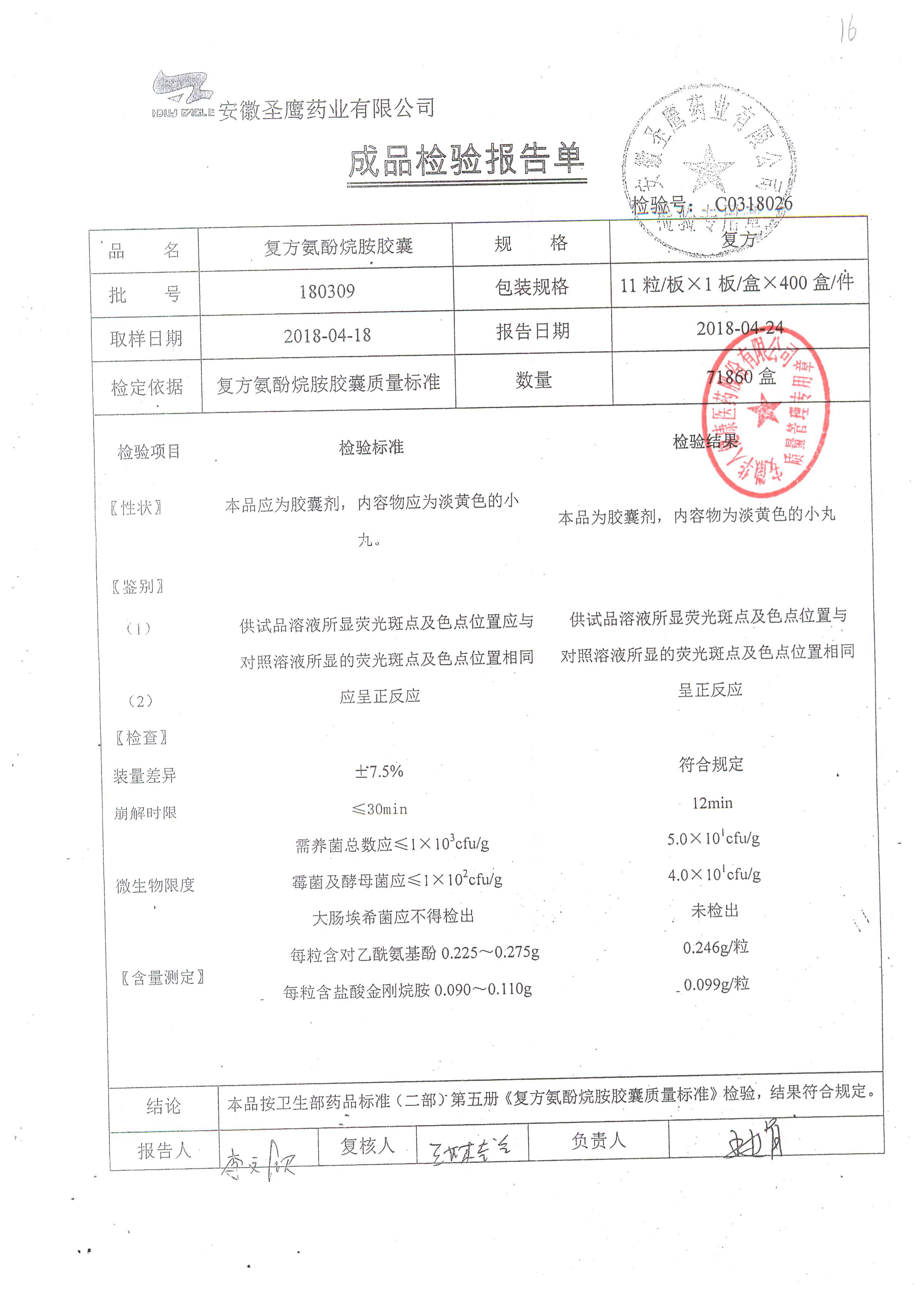 | 復方氨酚烷胺膠囊 | 11s*1 | 180309(鉻) | 查看詳情 |