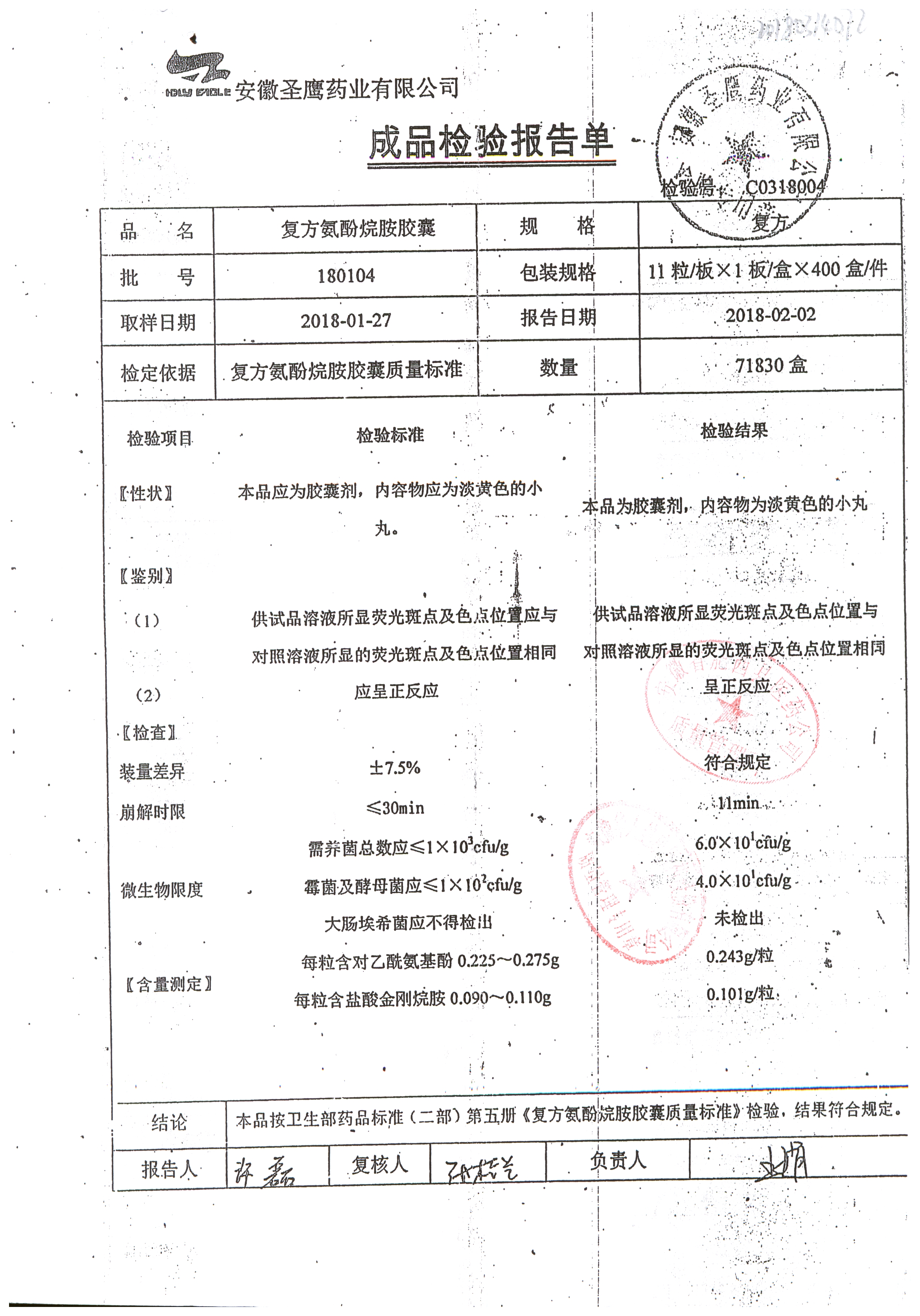 | 復方氨酚烷胺膠囊 | 11s*1 | 180405(1/2) | 查看詳情 |
