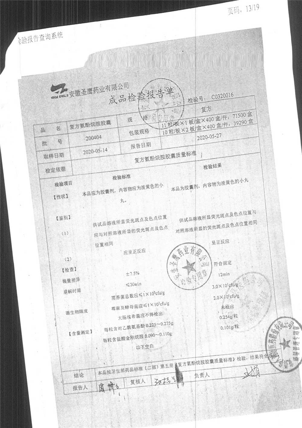 | 復方氨酚烷胺膠囊 | 11s*1 | 190501 | 查看詳情 |