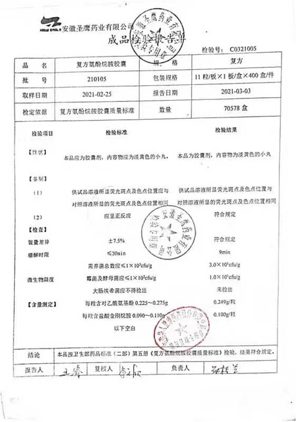 | 復方氨酚烷胺膠囊 | 11s*1 | 210105(1/2) | 查看詳情 |