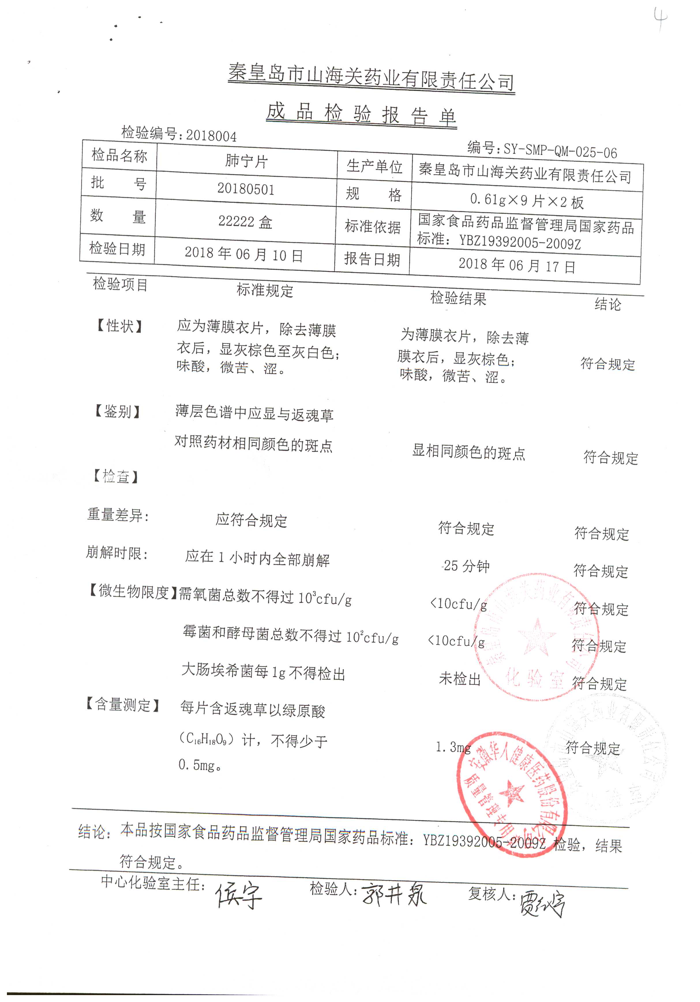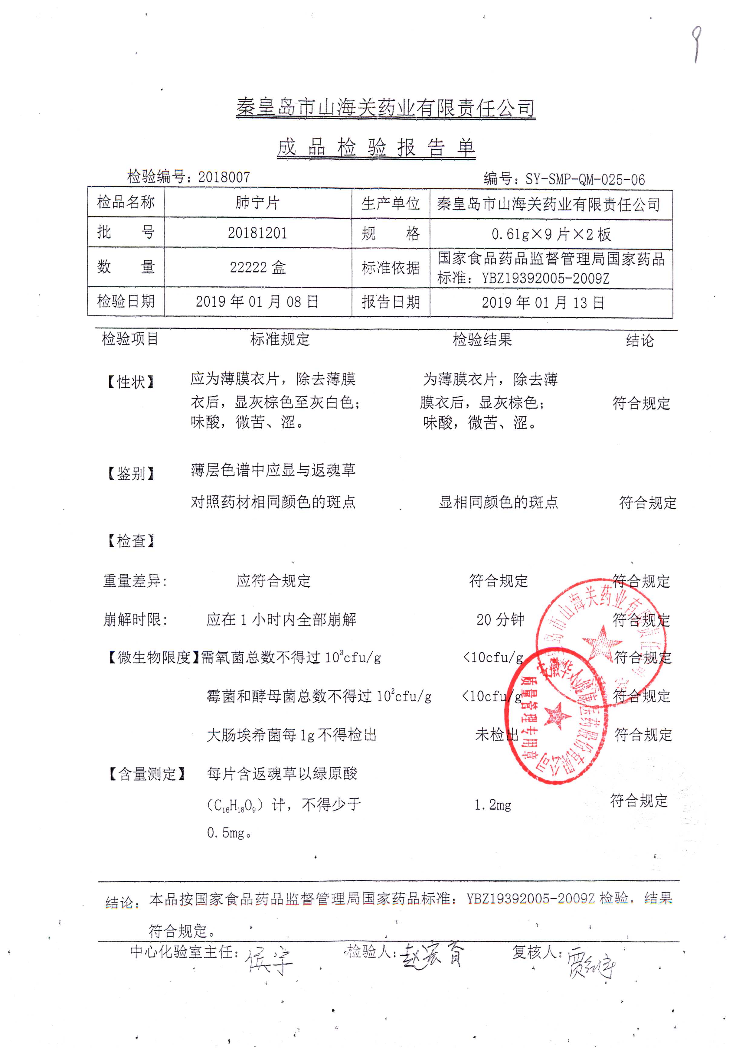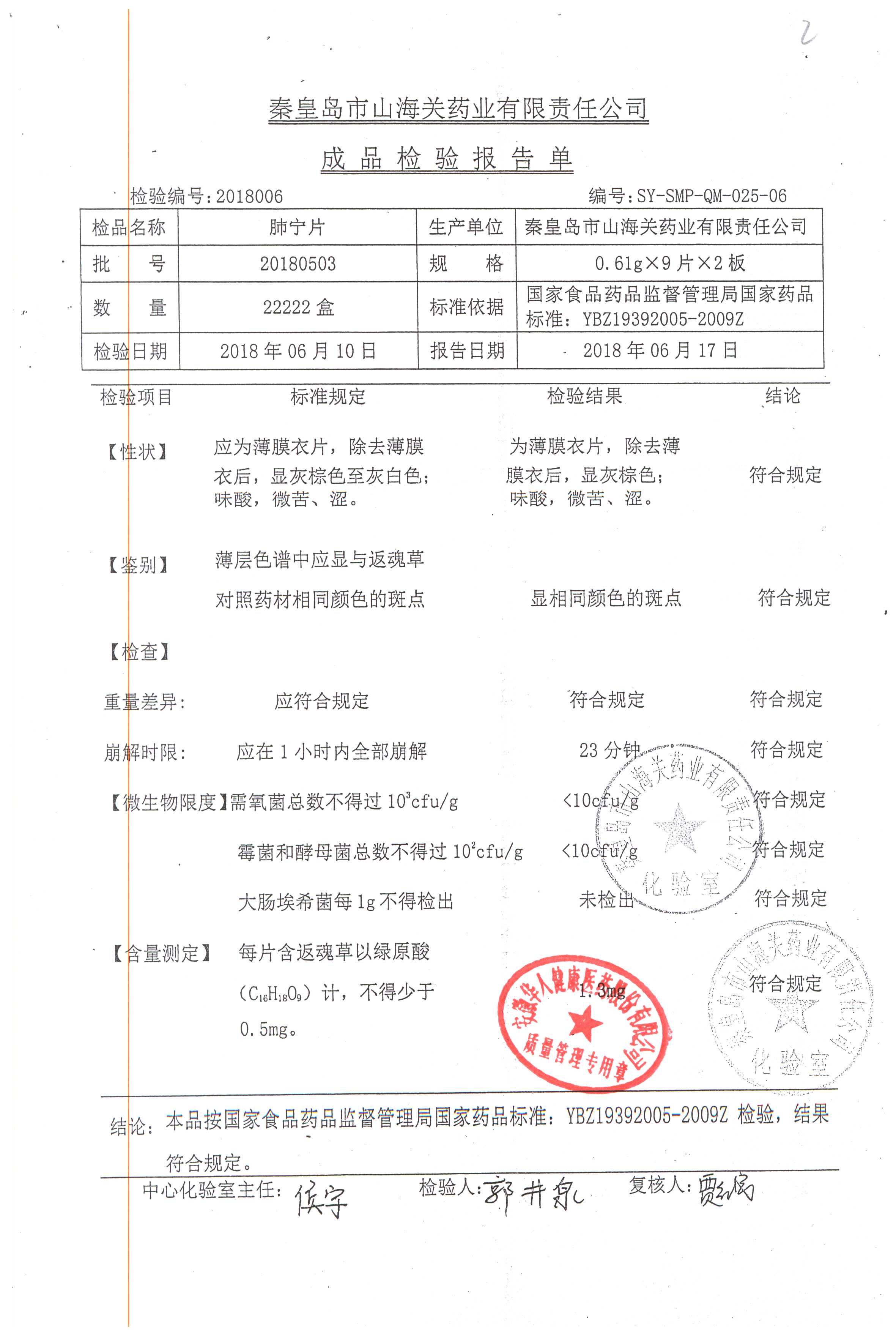 | 肺寧片 | 0.61g*18s | 20181201 | 查看詳情 |