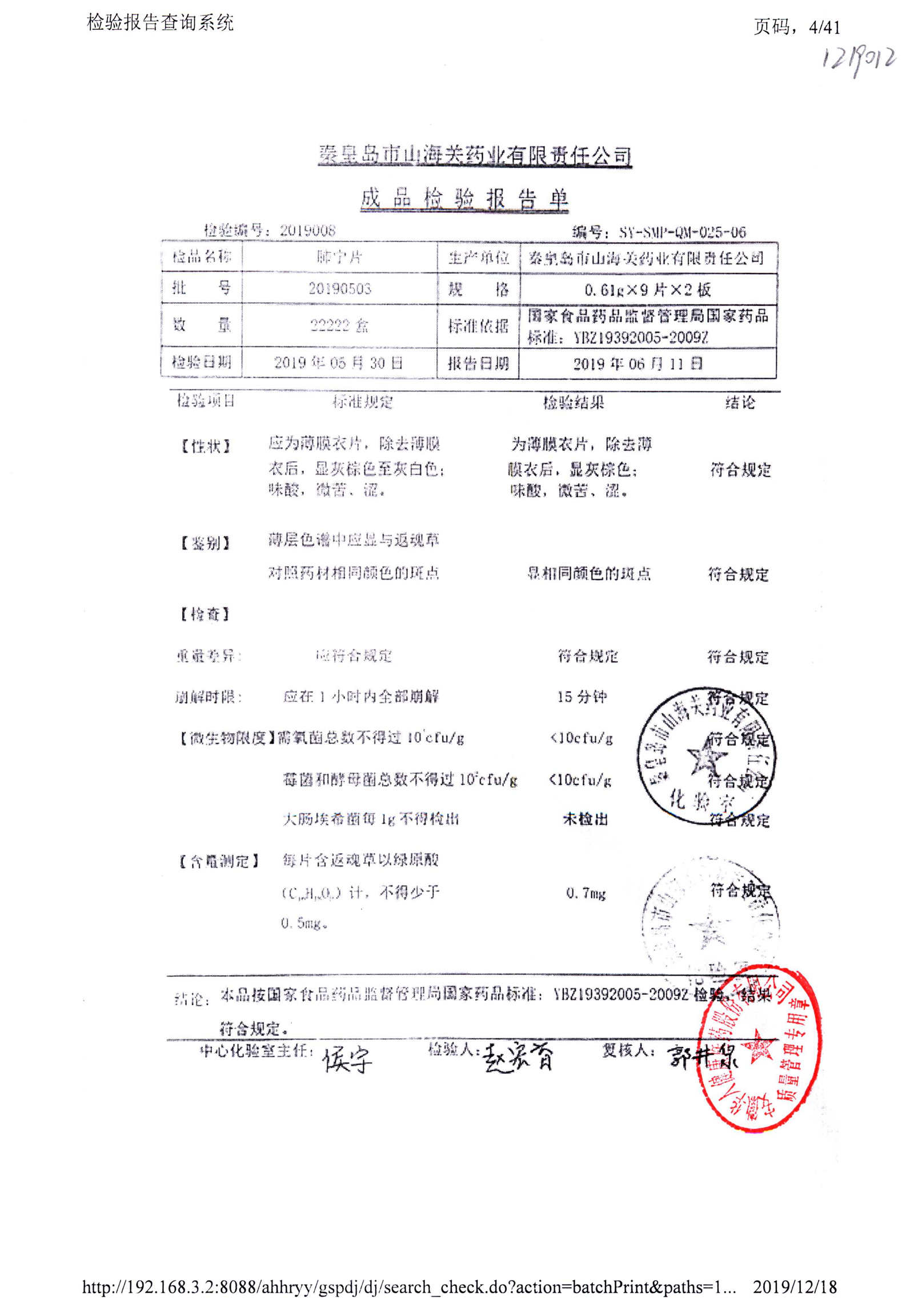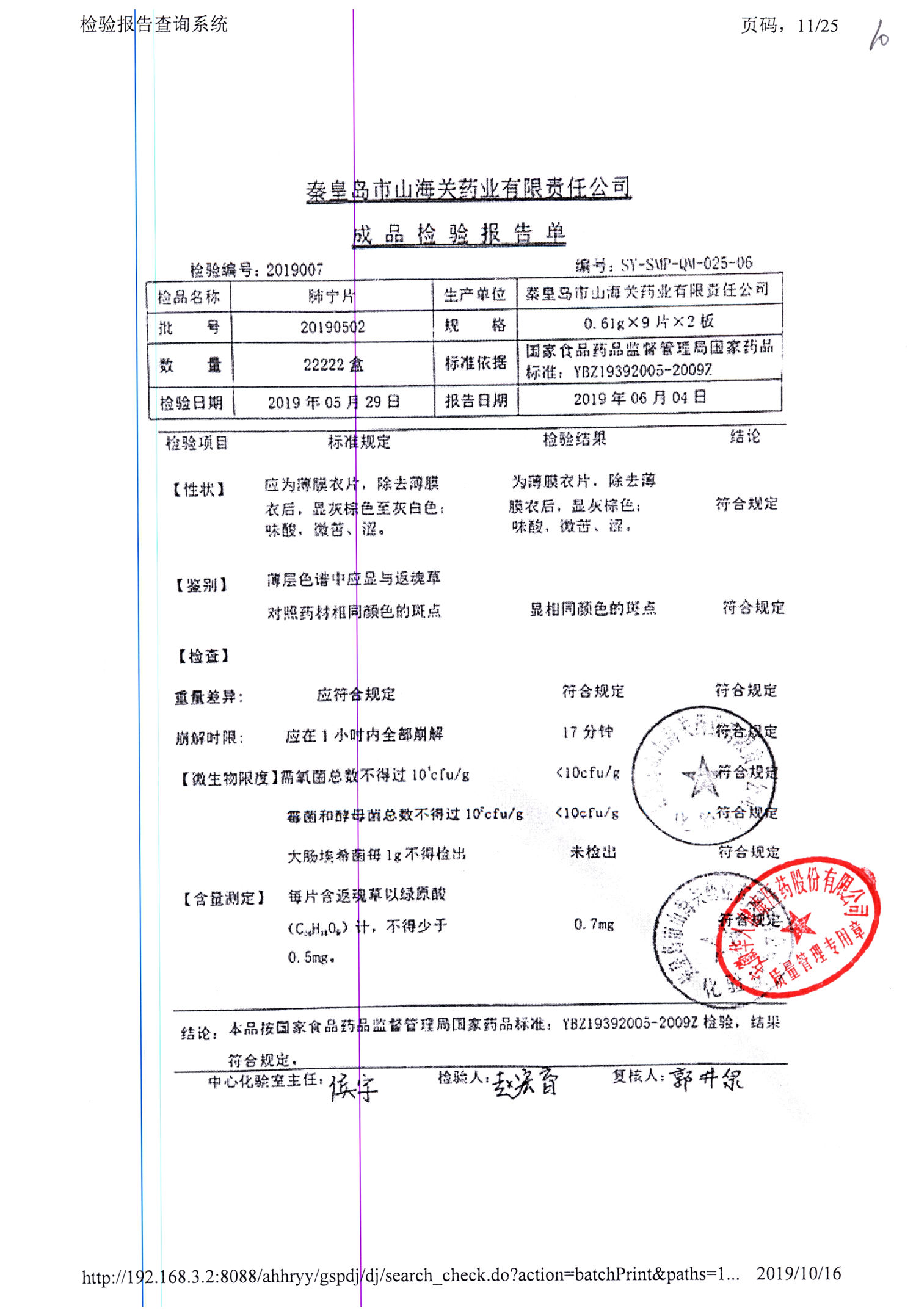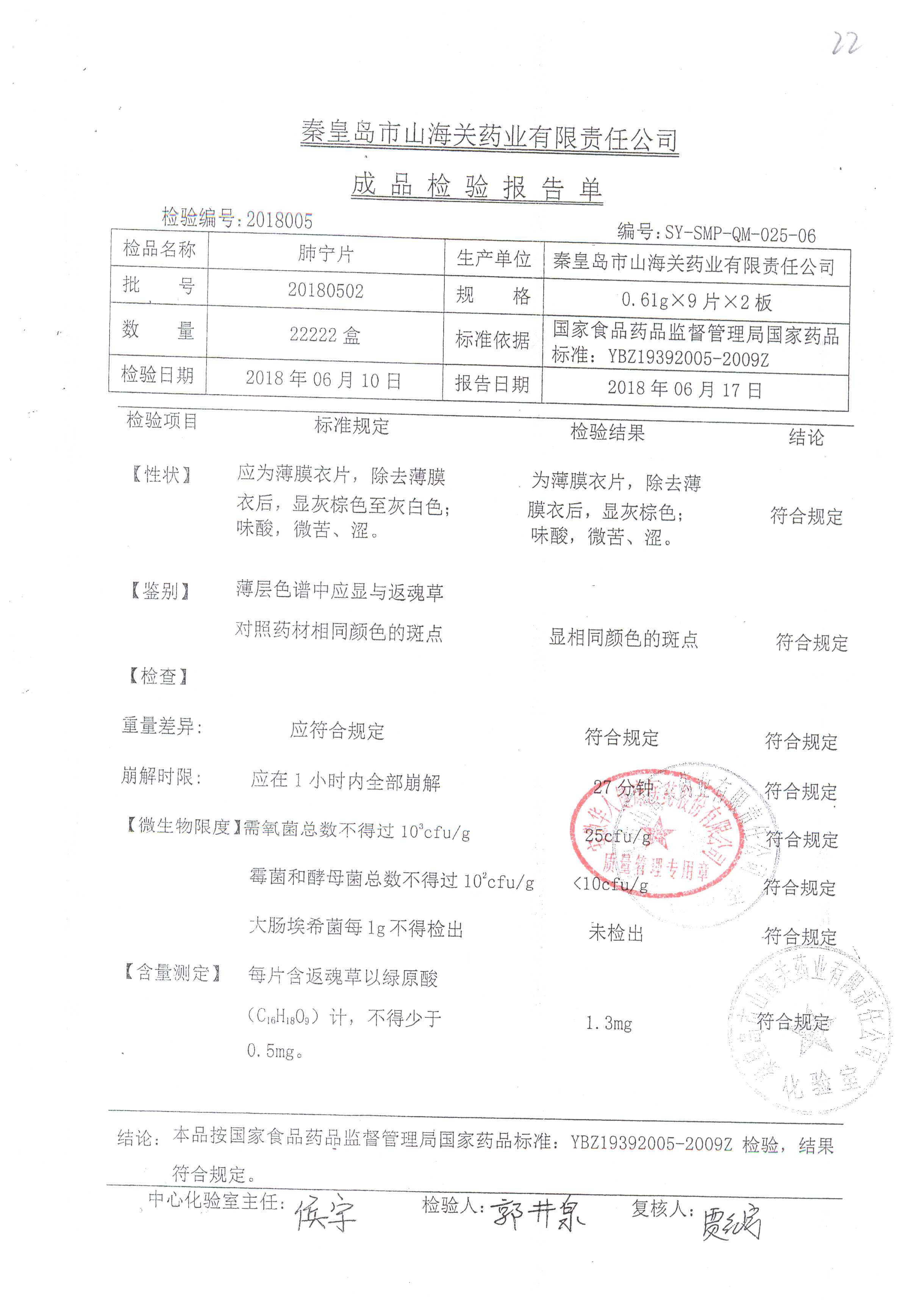 | 肺寧片 | 0.61g*18s | 20181201 | 查看詳情 |