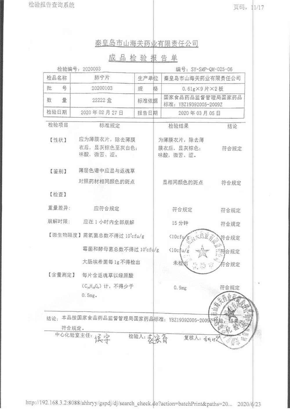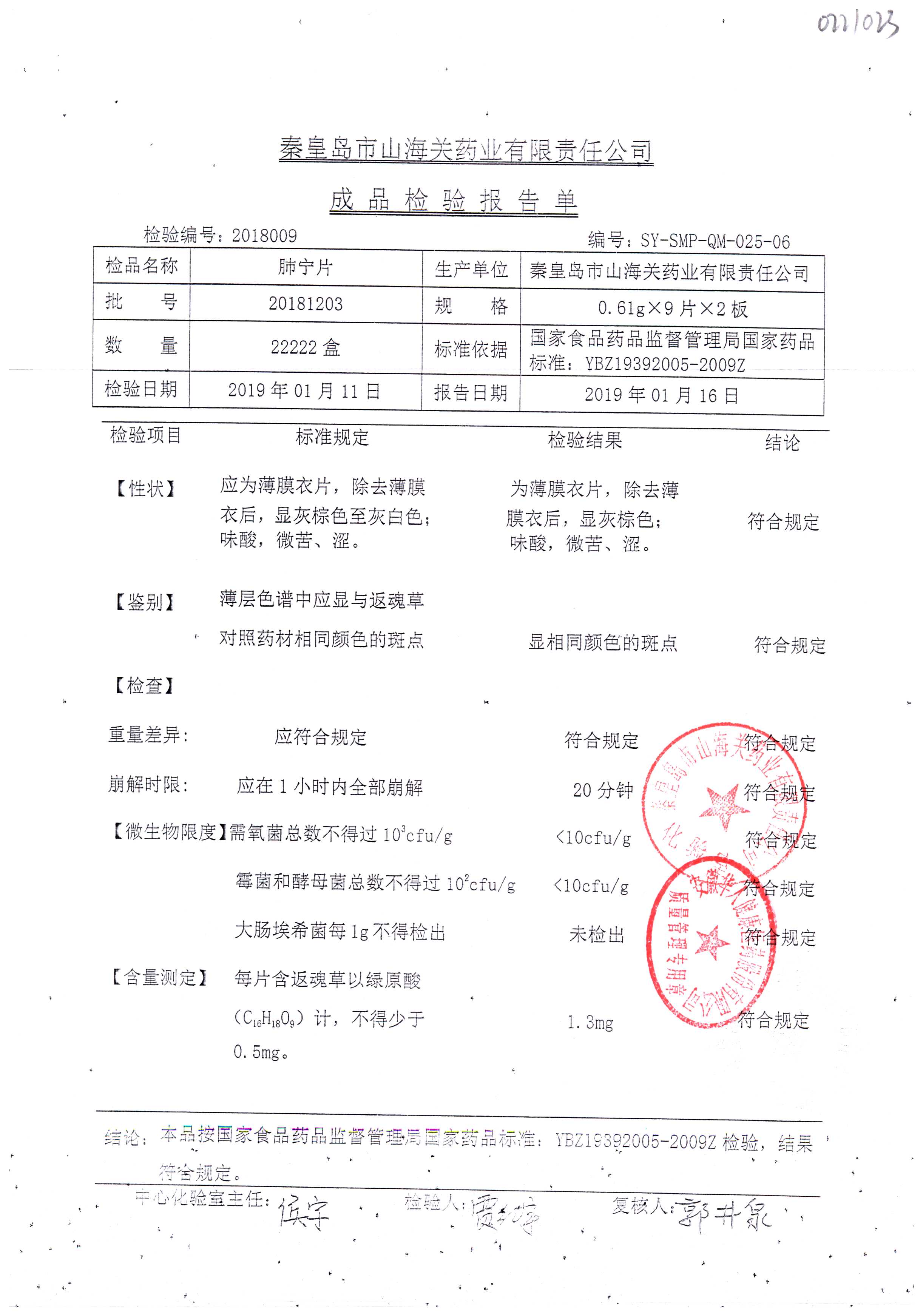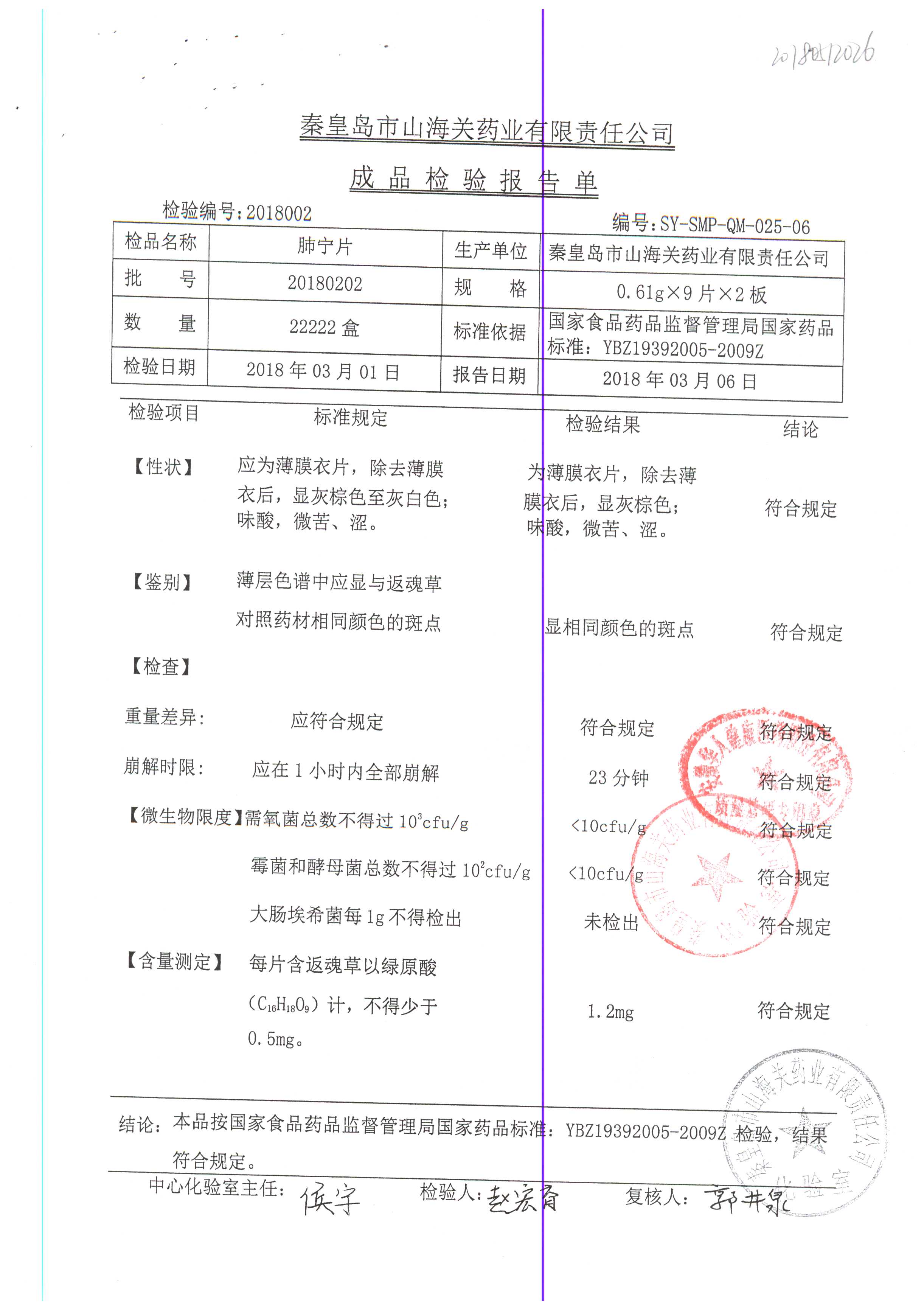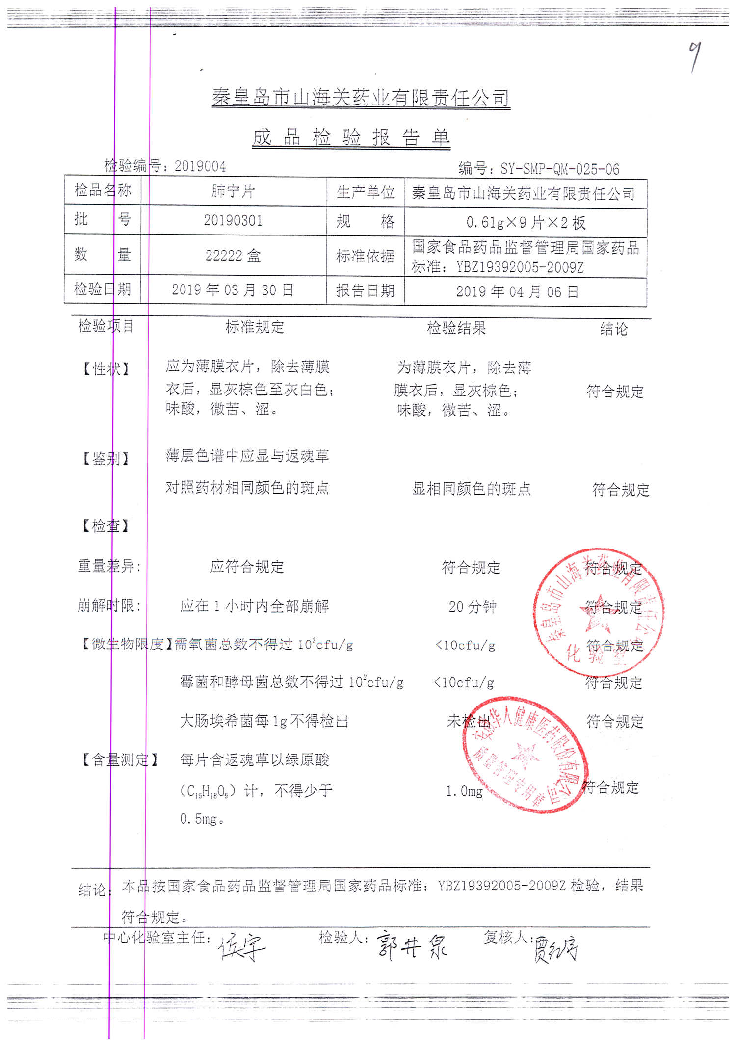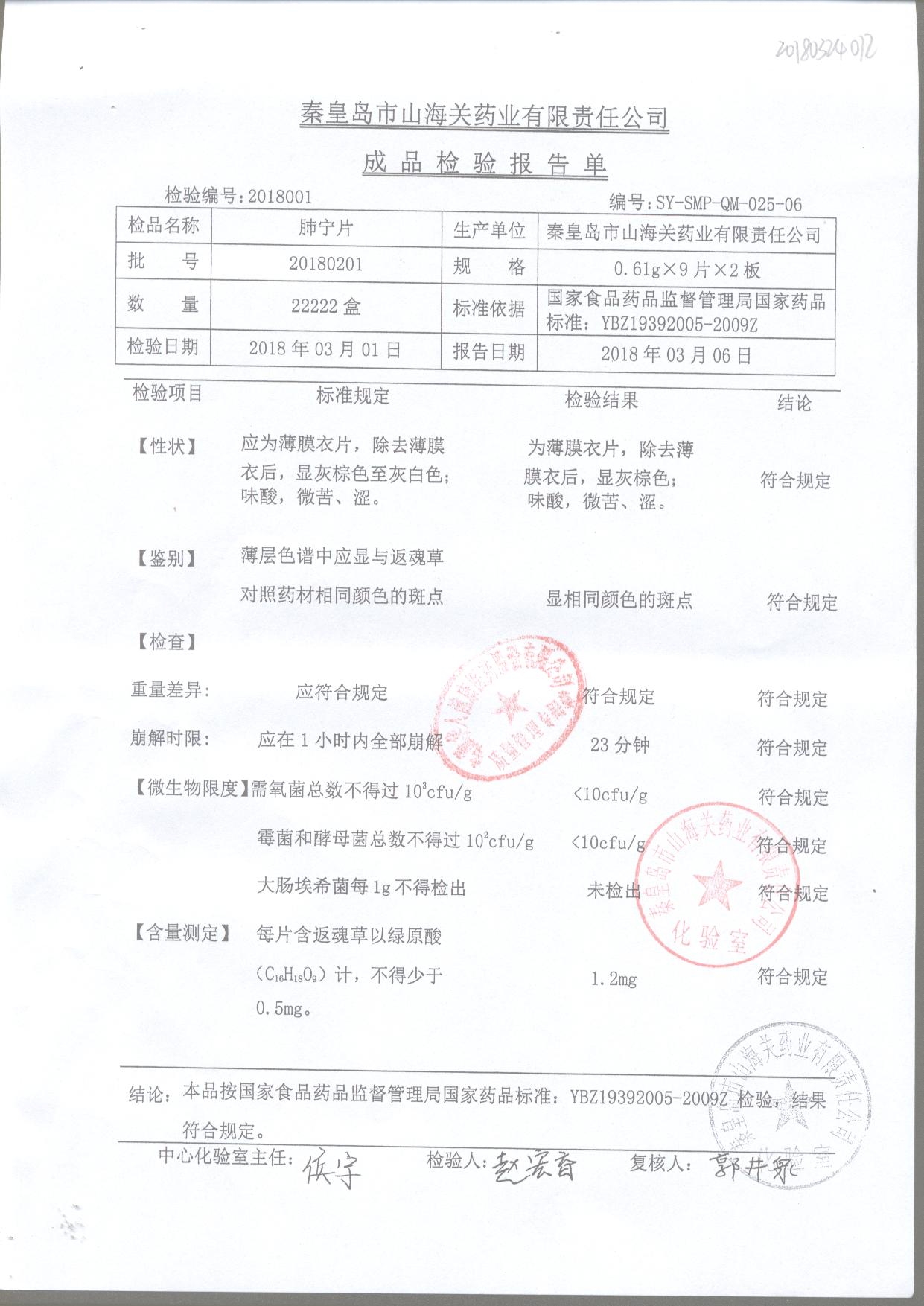 | 肺寧片 | 0.61g*18s | 20210102 | 查看詳情 |