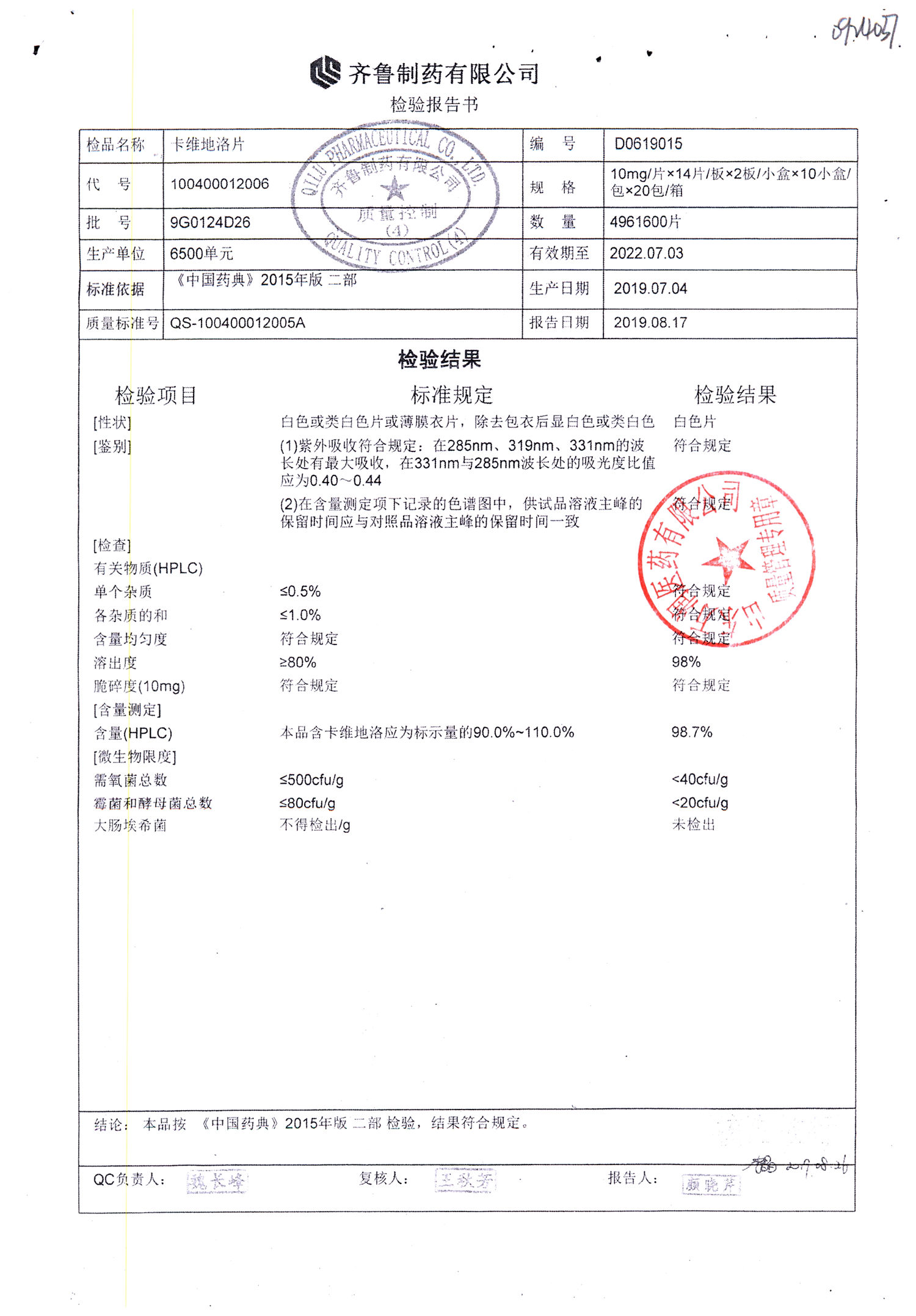 | 卡維地洛片 | 10mg*14*2 | 9G0124D26 | 查看詳情 |