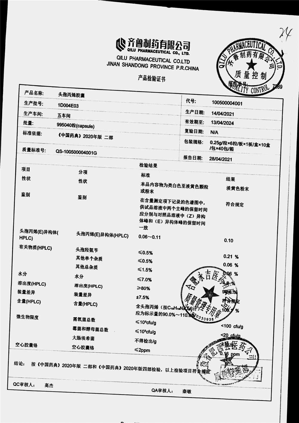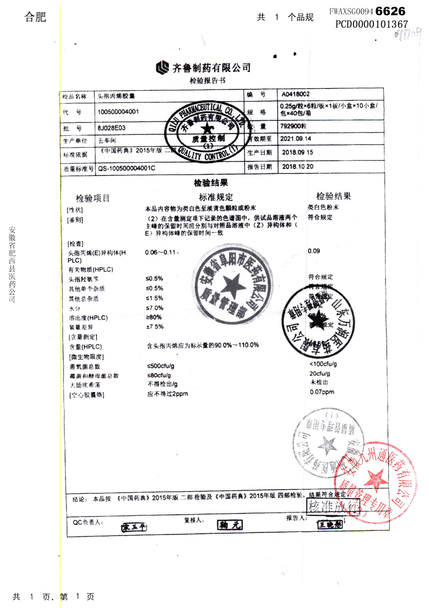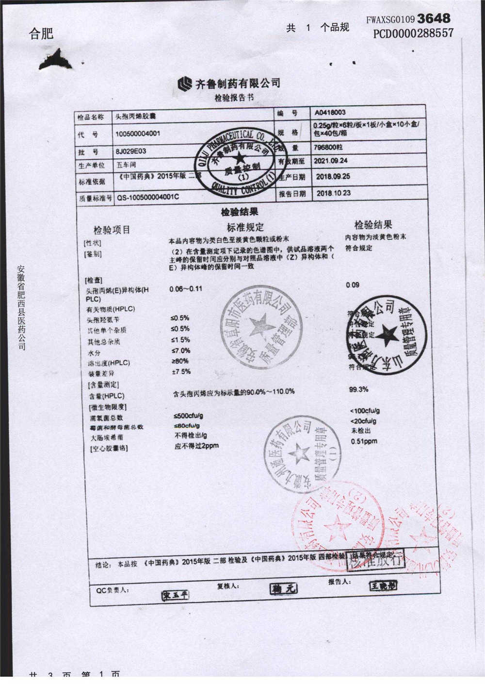 | 頭孢丙烯膠囊 | 0.25g*6s | 8J029E03 | 查看詳情 |