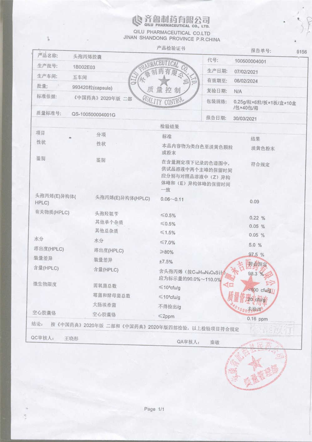 | 頭孢丙烯膠囊 | 0.25g*6s | 0G006E03 | 查看詳情 |