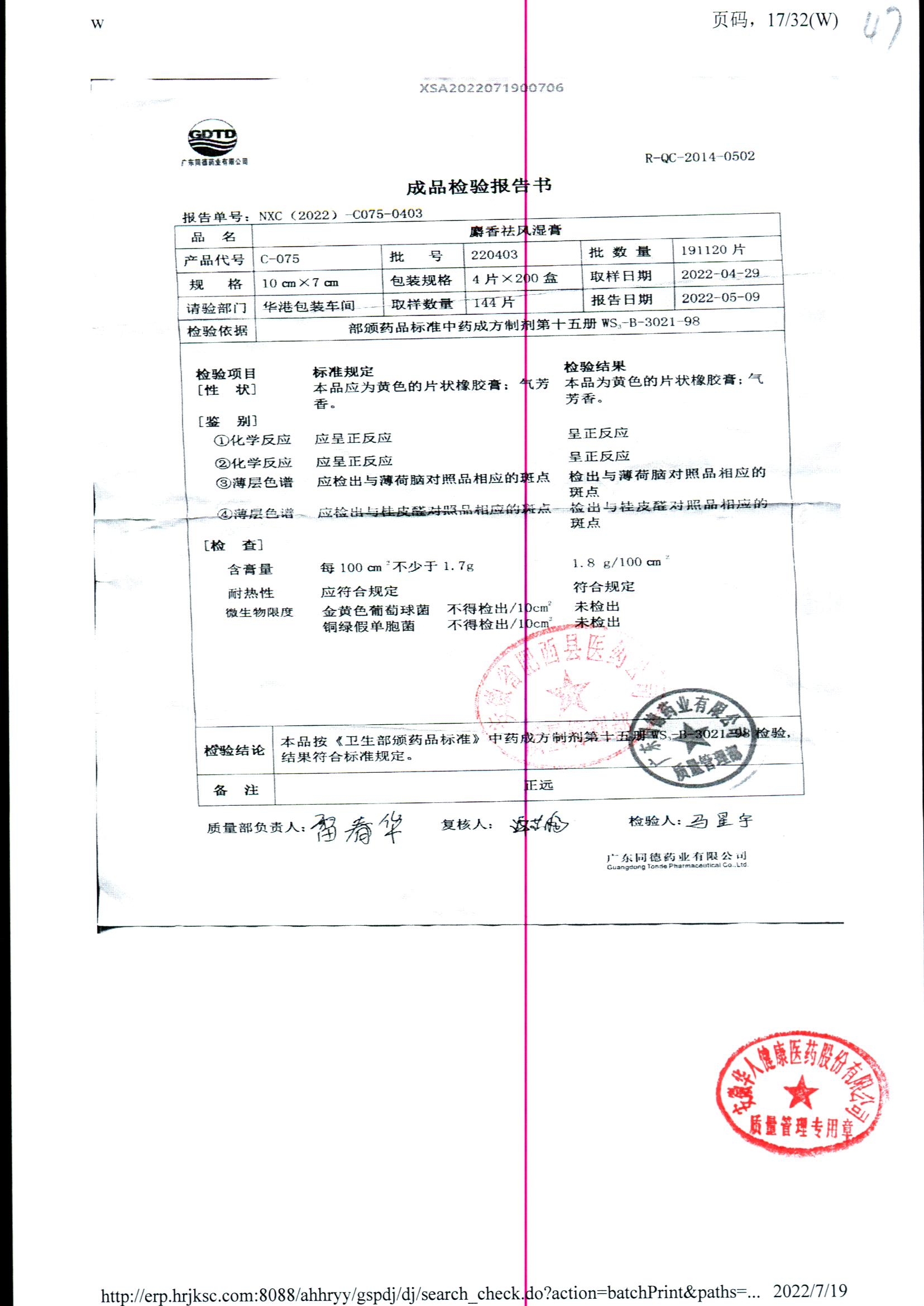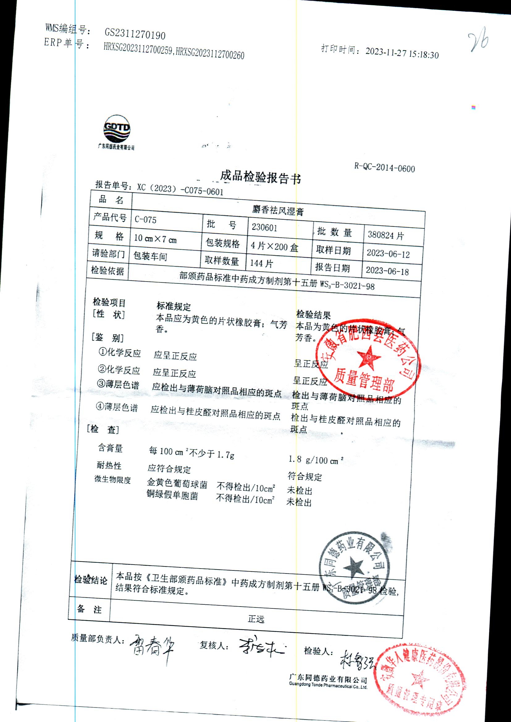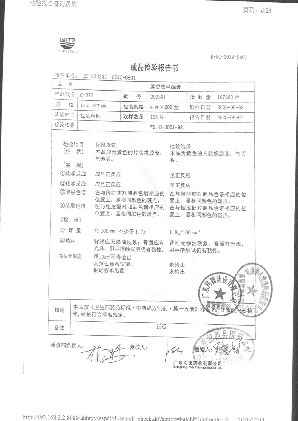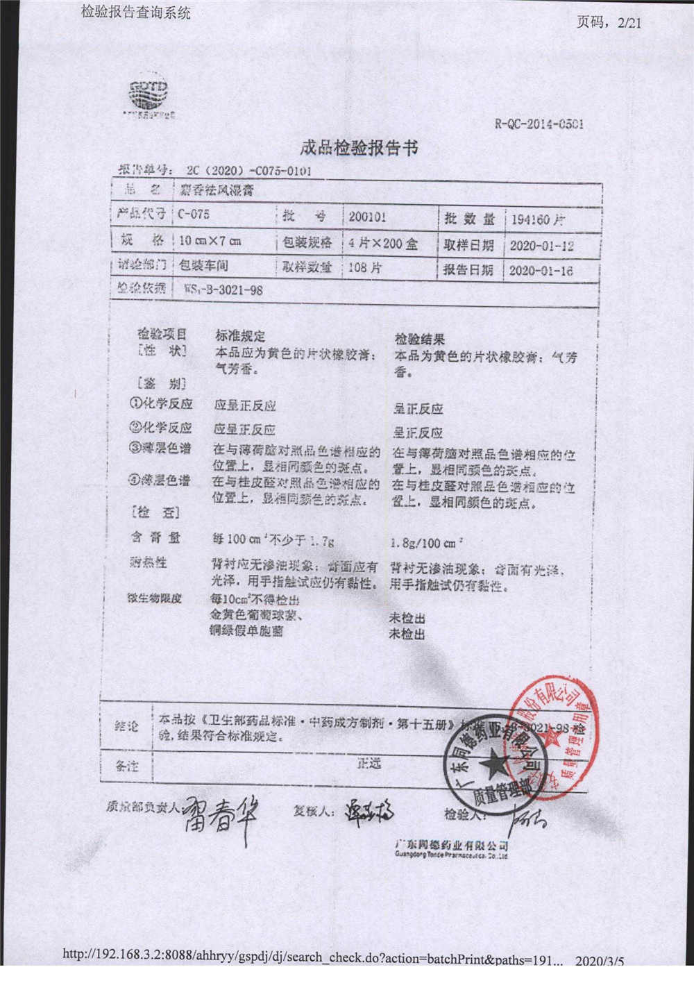 | 麝香祛風濕膏 | 10cm*7cm*4片 | 20181001 | 查看詳情 |