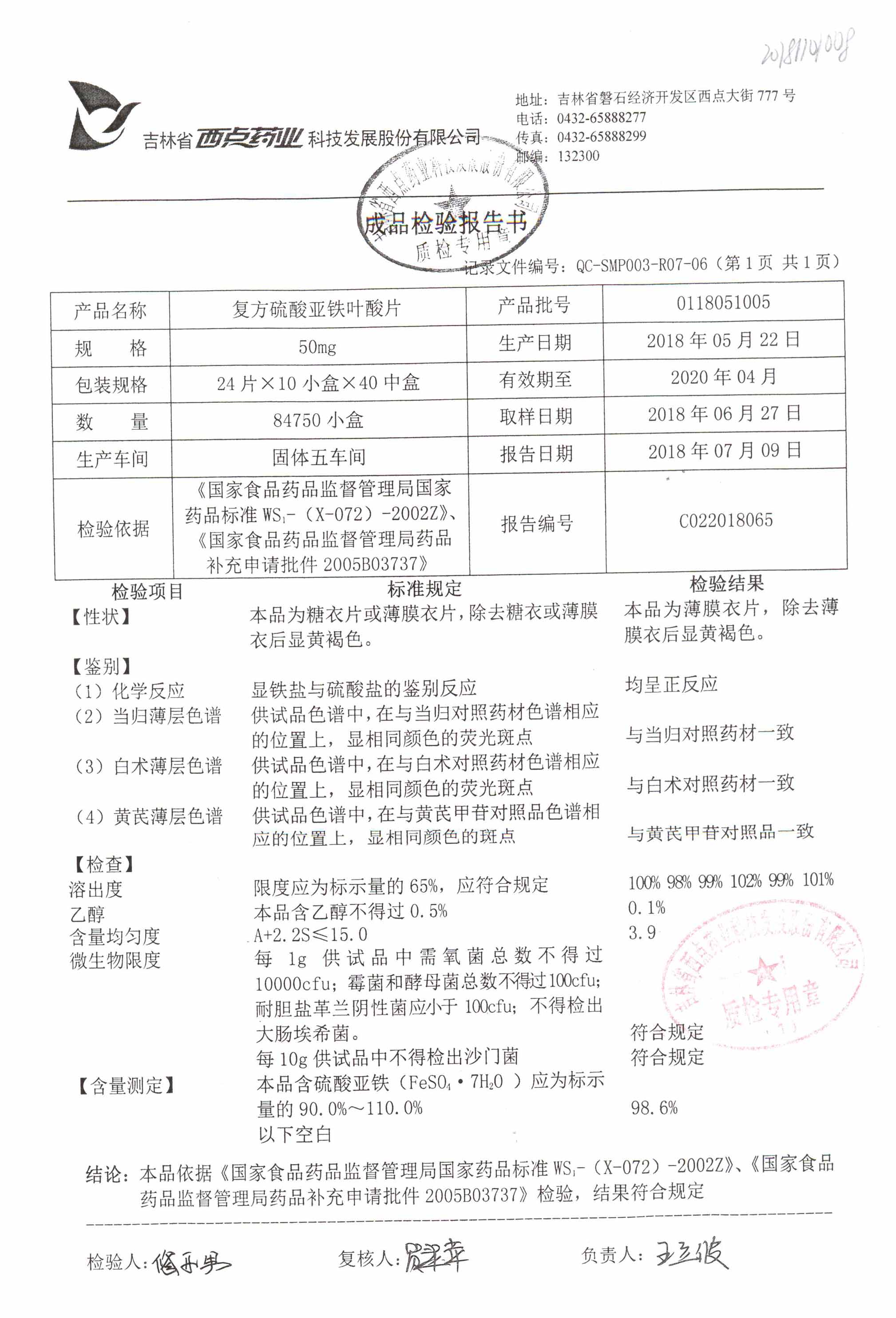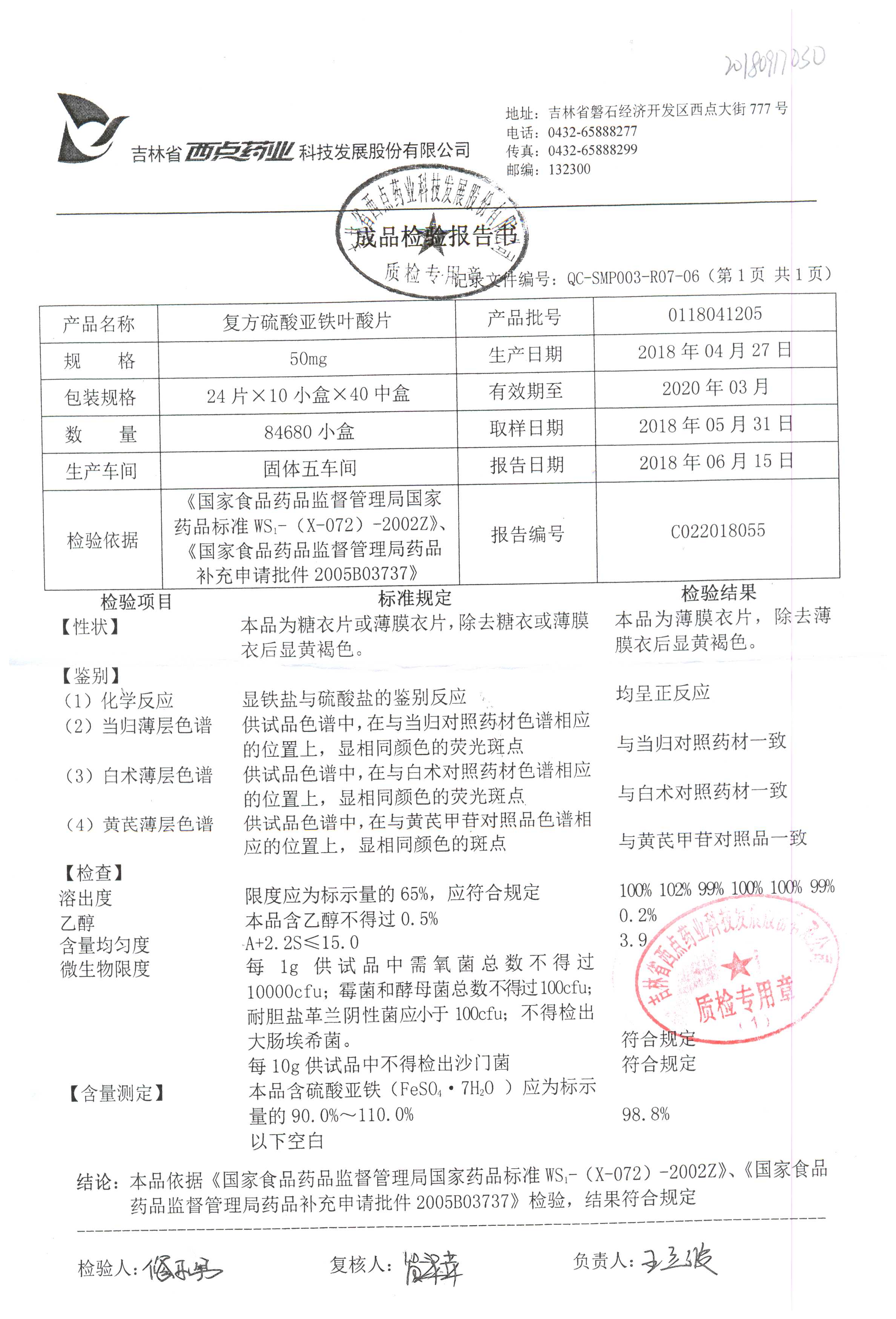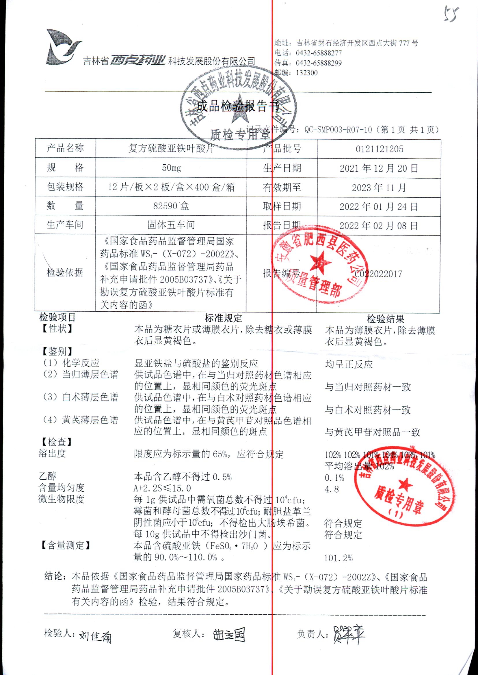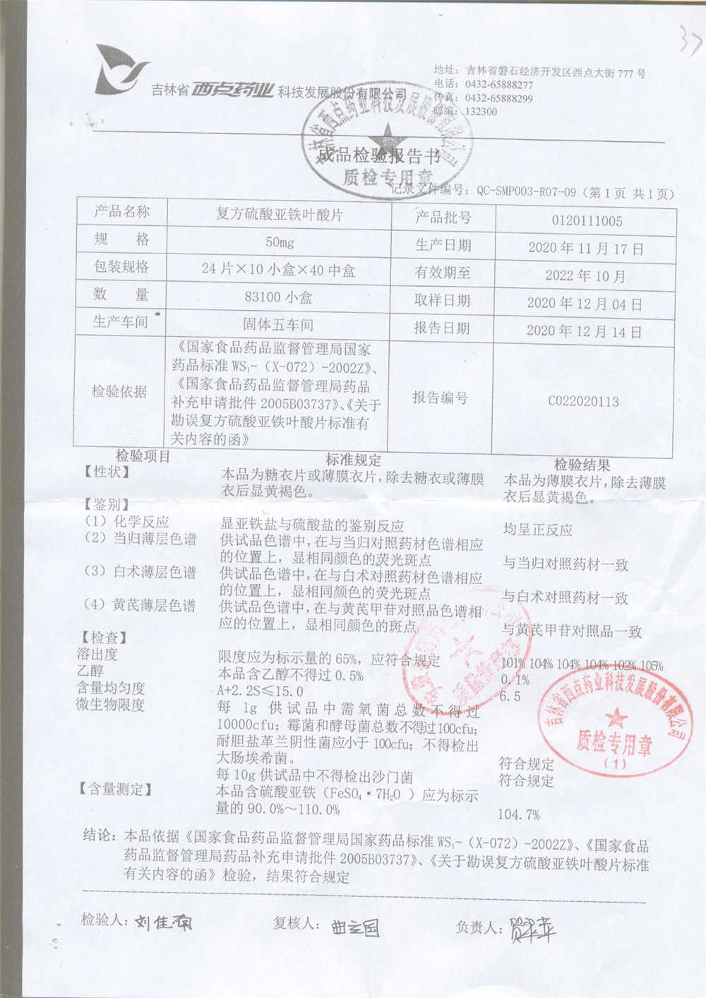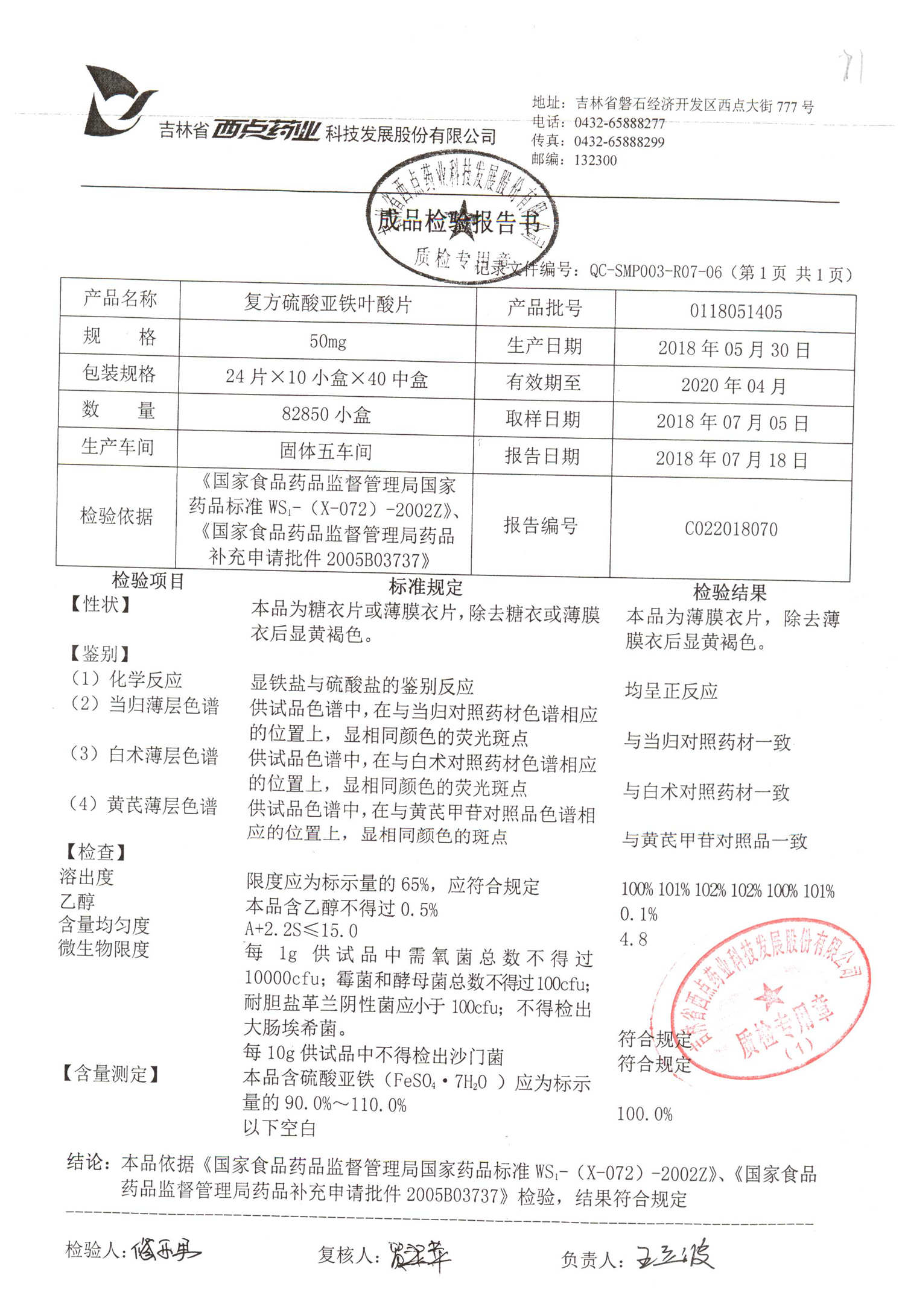 | 復方硫酸亞鐵葉酸片 | 50mg*24s | 0120120705 | 查看詳情 |