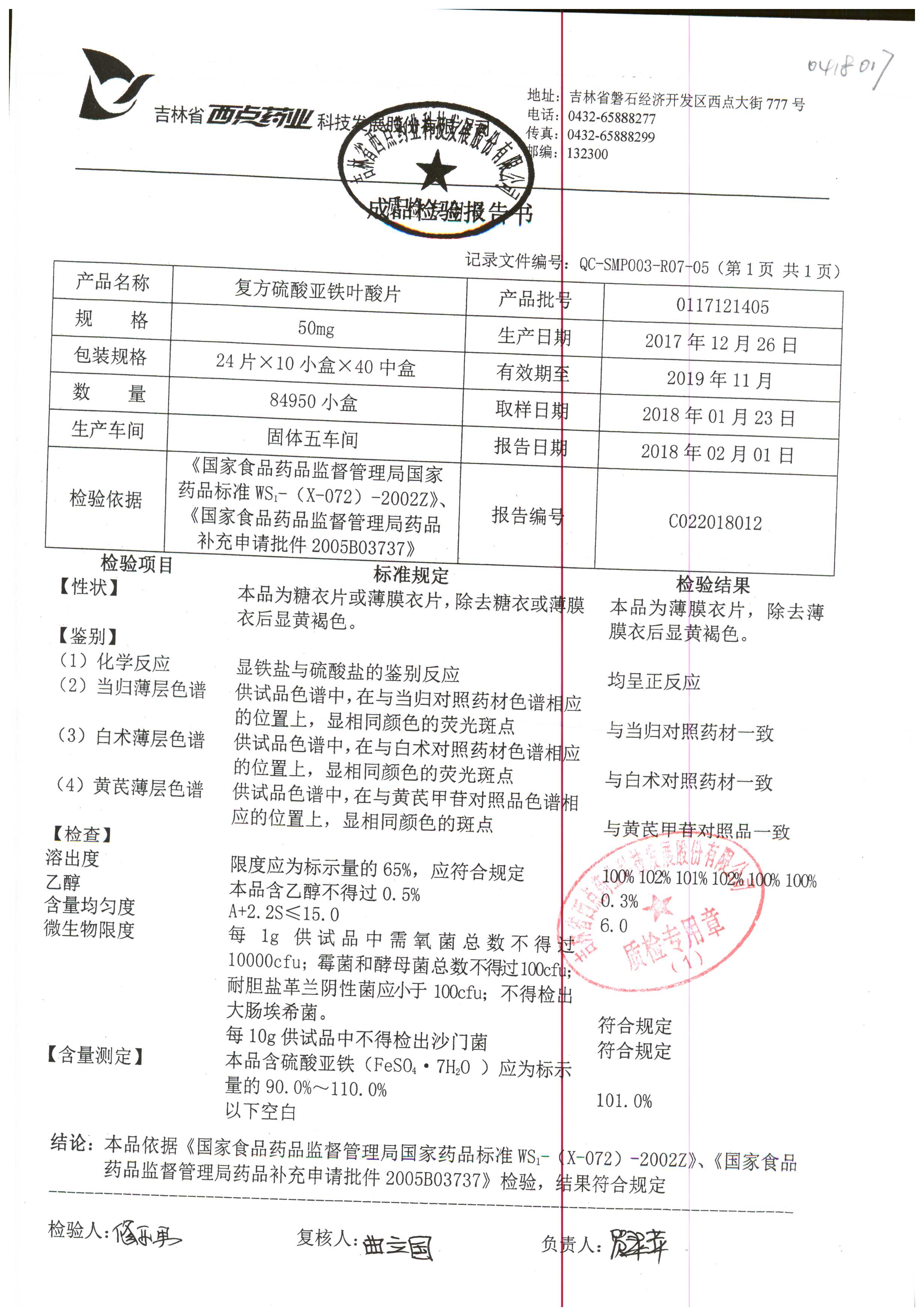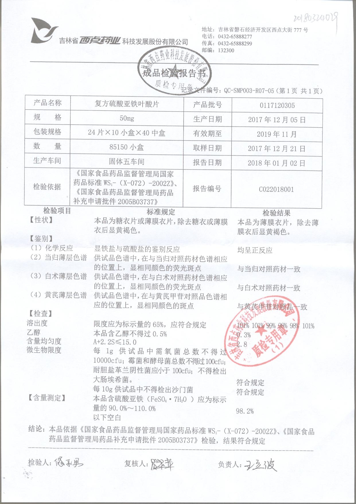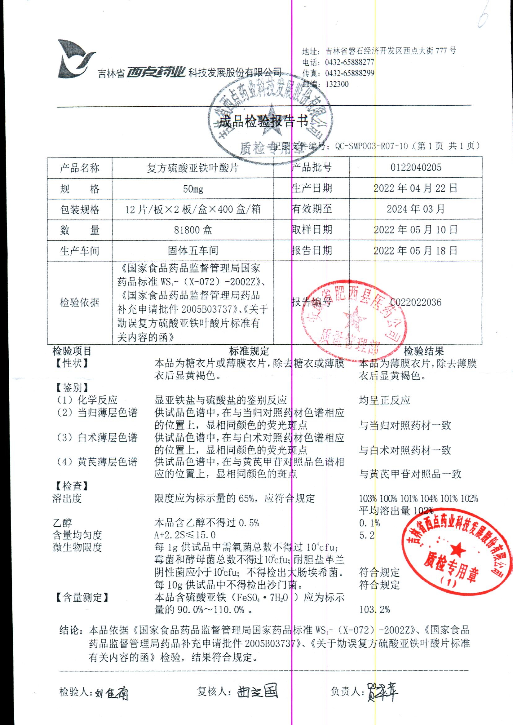 | 復方硫酸亞鐵葉酸片 | 50mg*24s | 0118030405 | 查看詳情 |