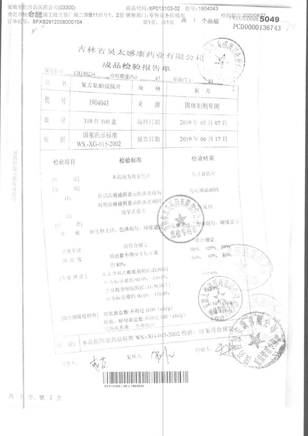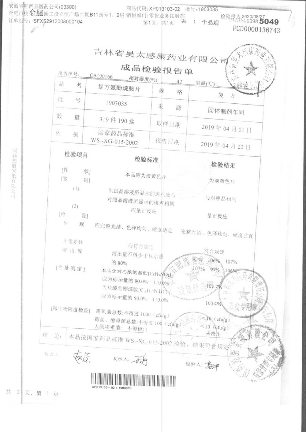 | 復方氨酚烷胺片 | 復方 | 1912059 | 查看詳情 |