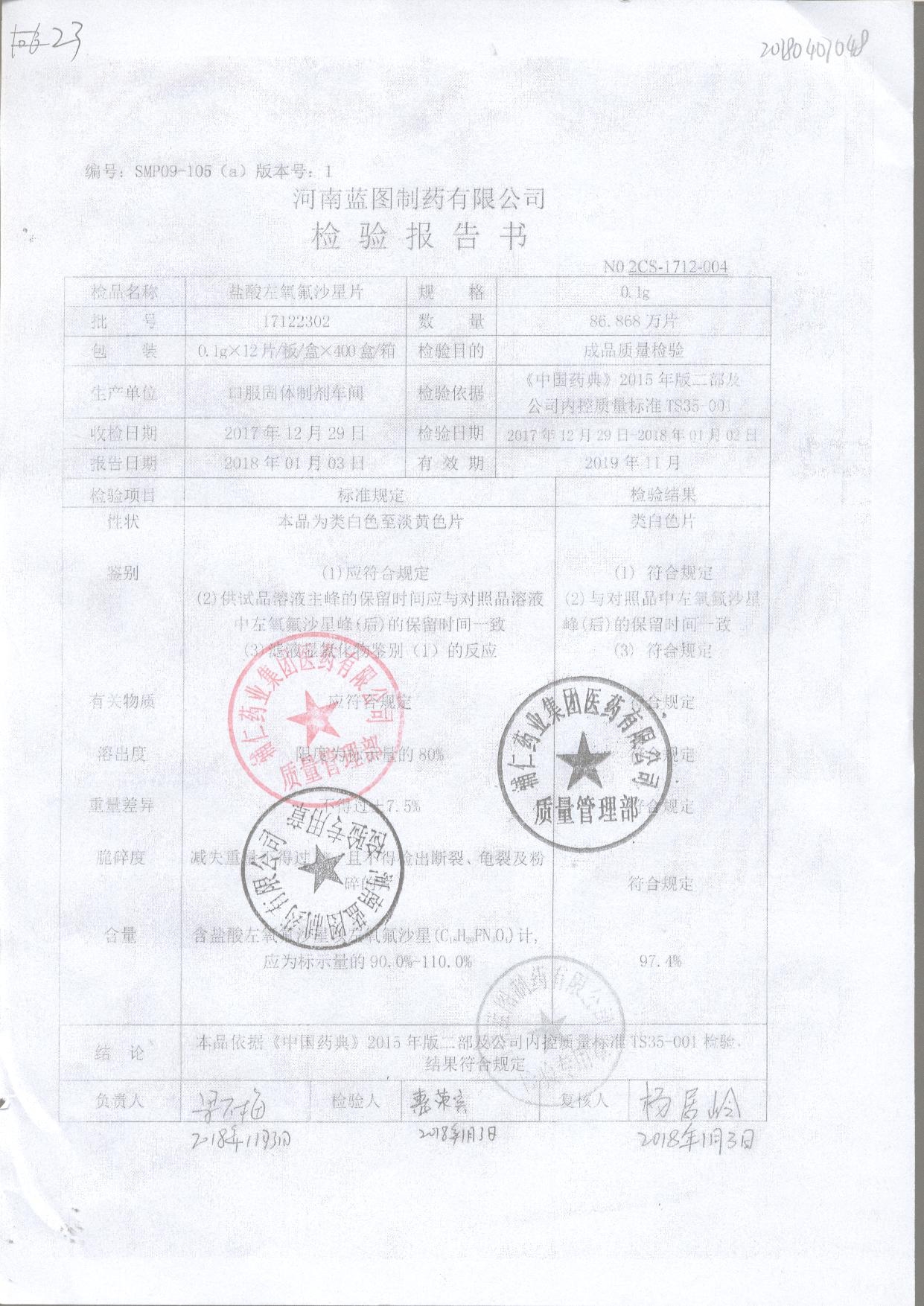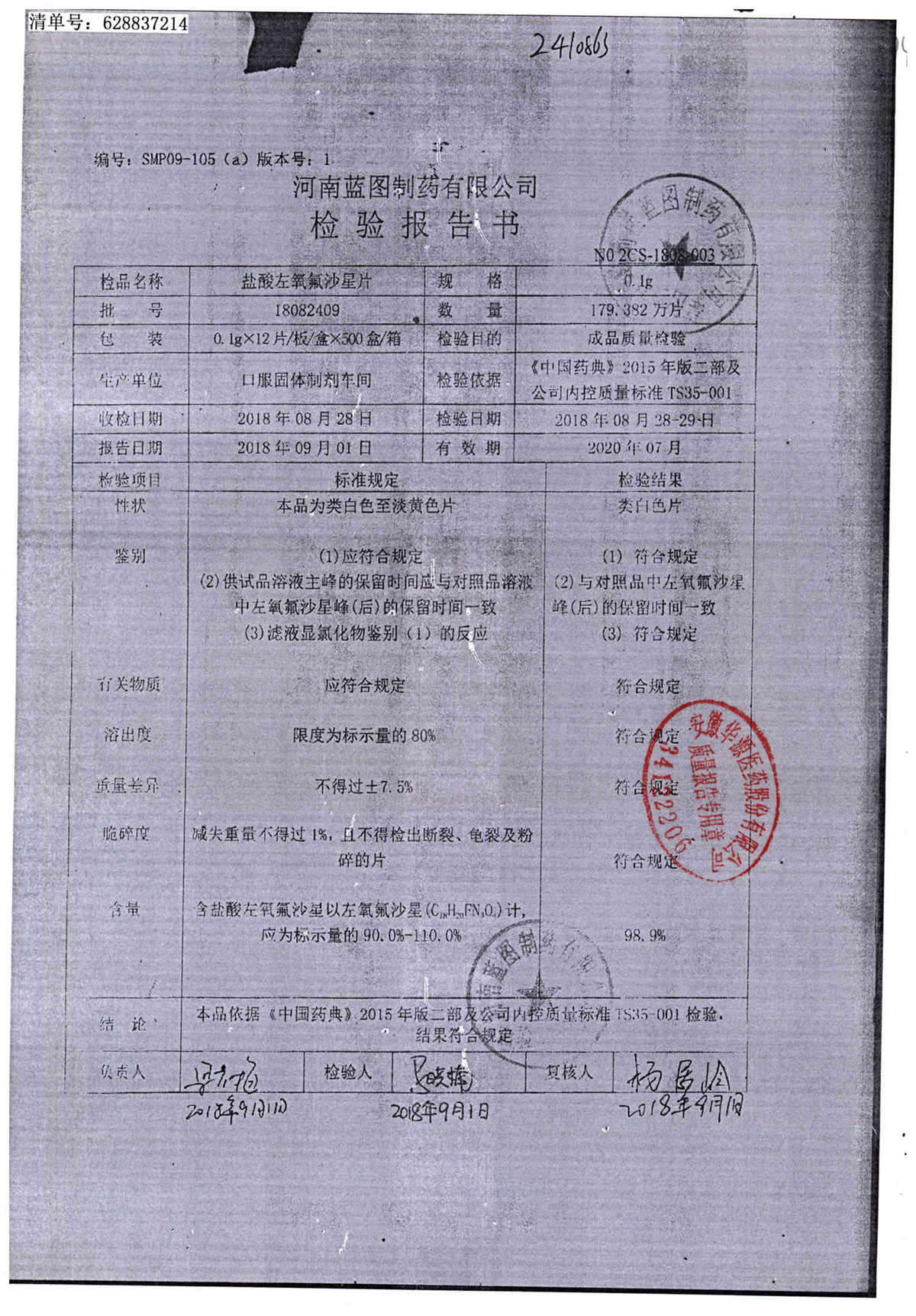 鹽酸左氧氟沙星片 0.1g*12片 18082409 查看詳情