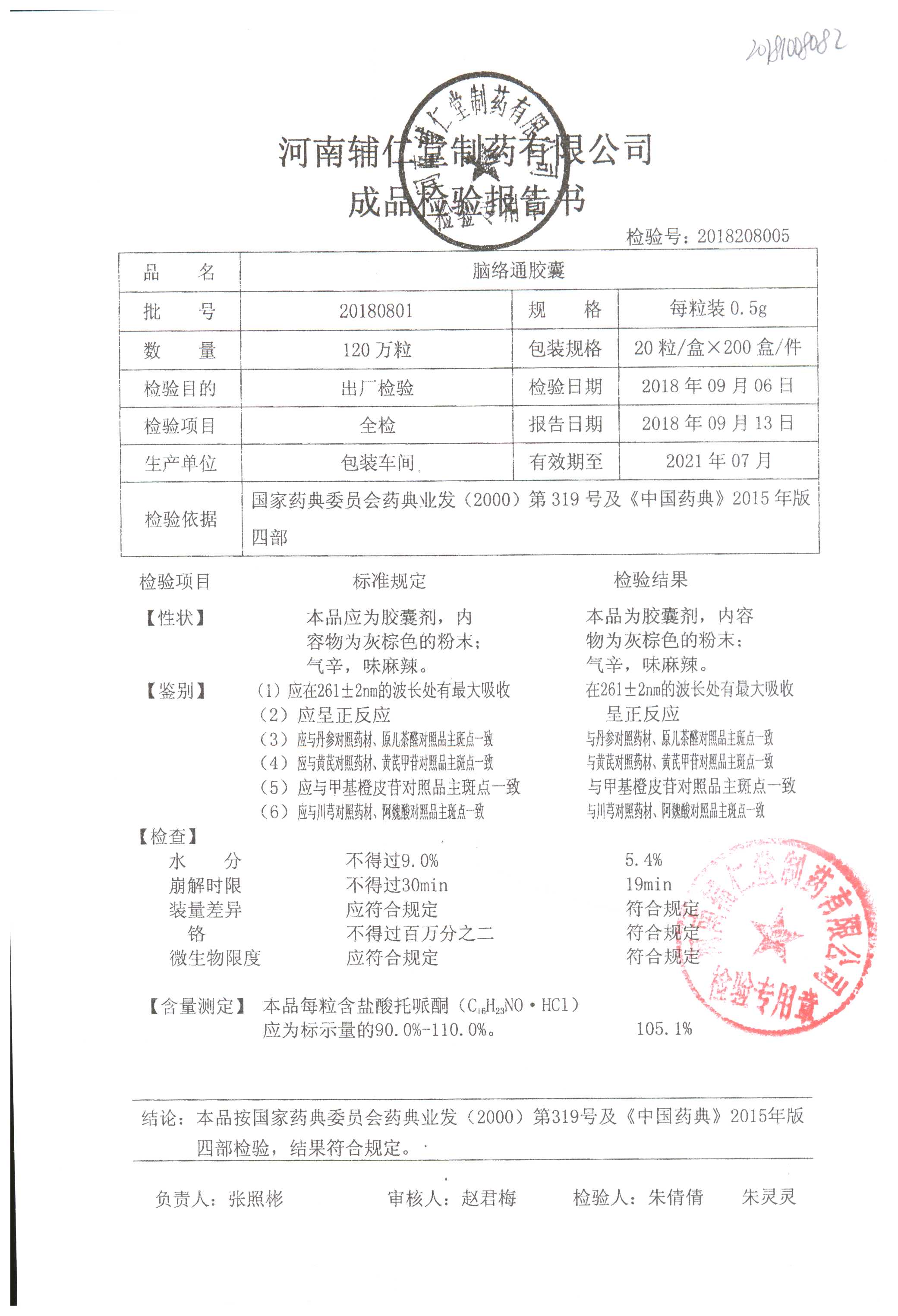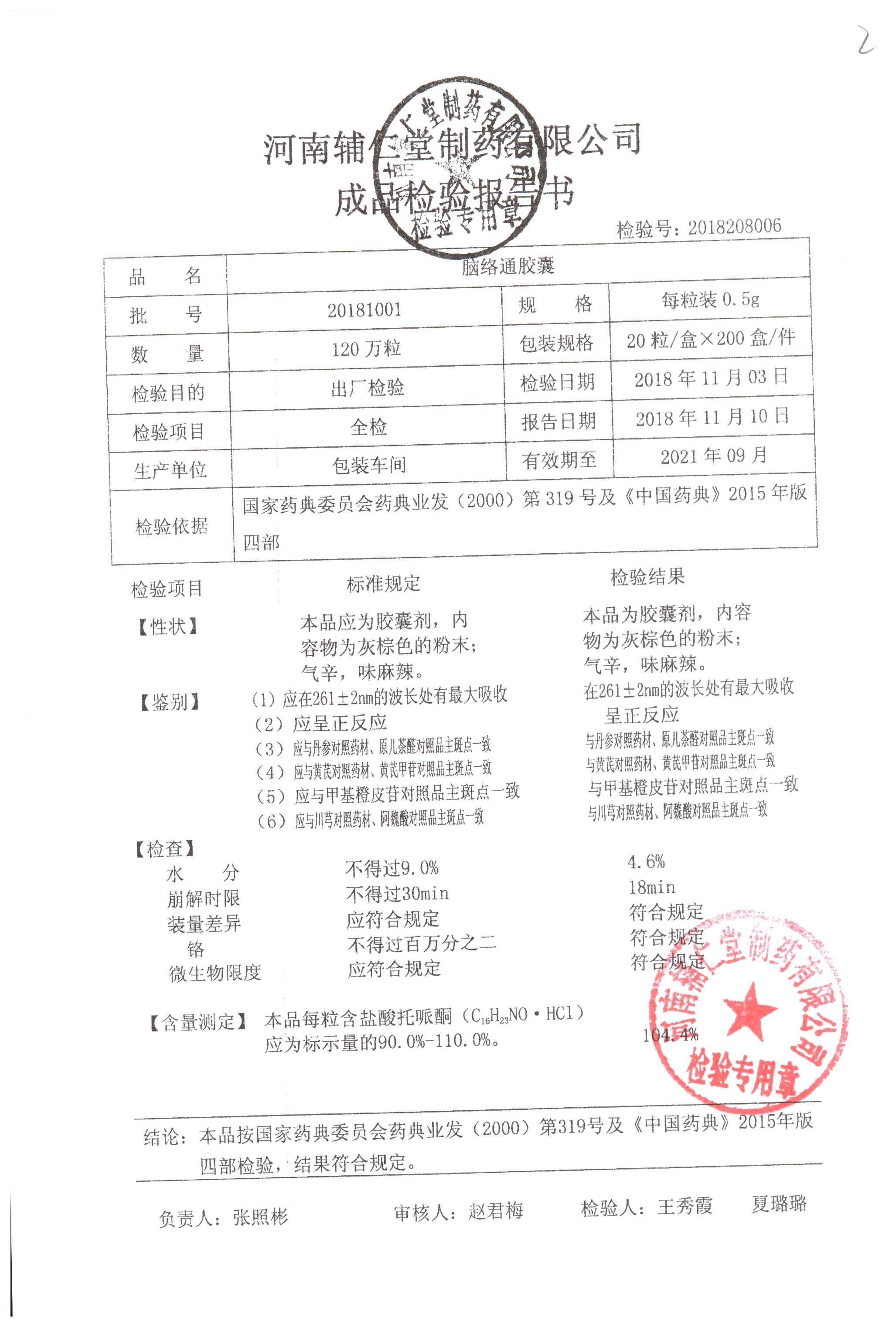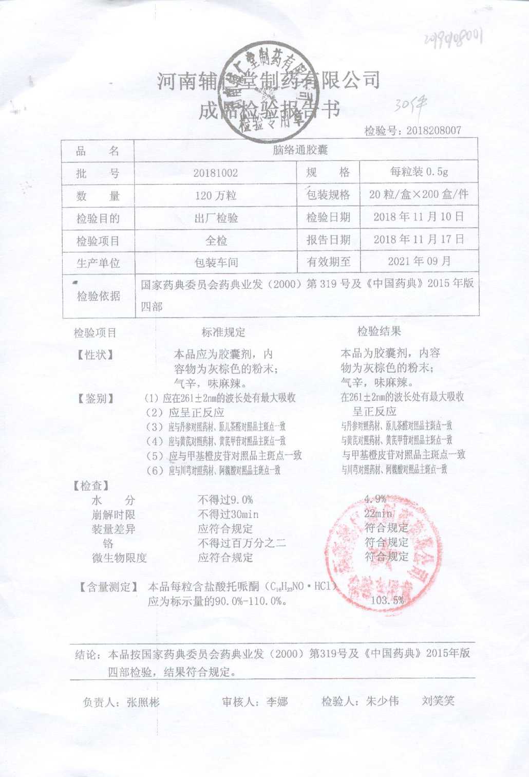 | 腦絡通膠囊 | 0.5g | 20181002 | 查看詳情 |