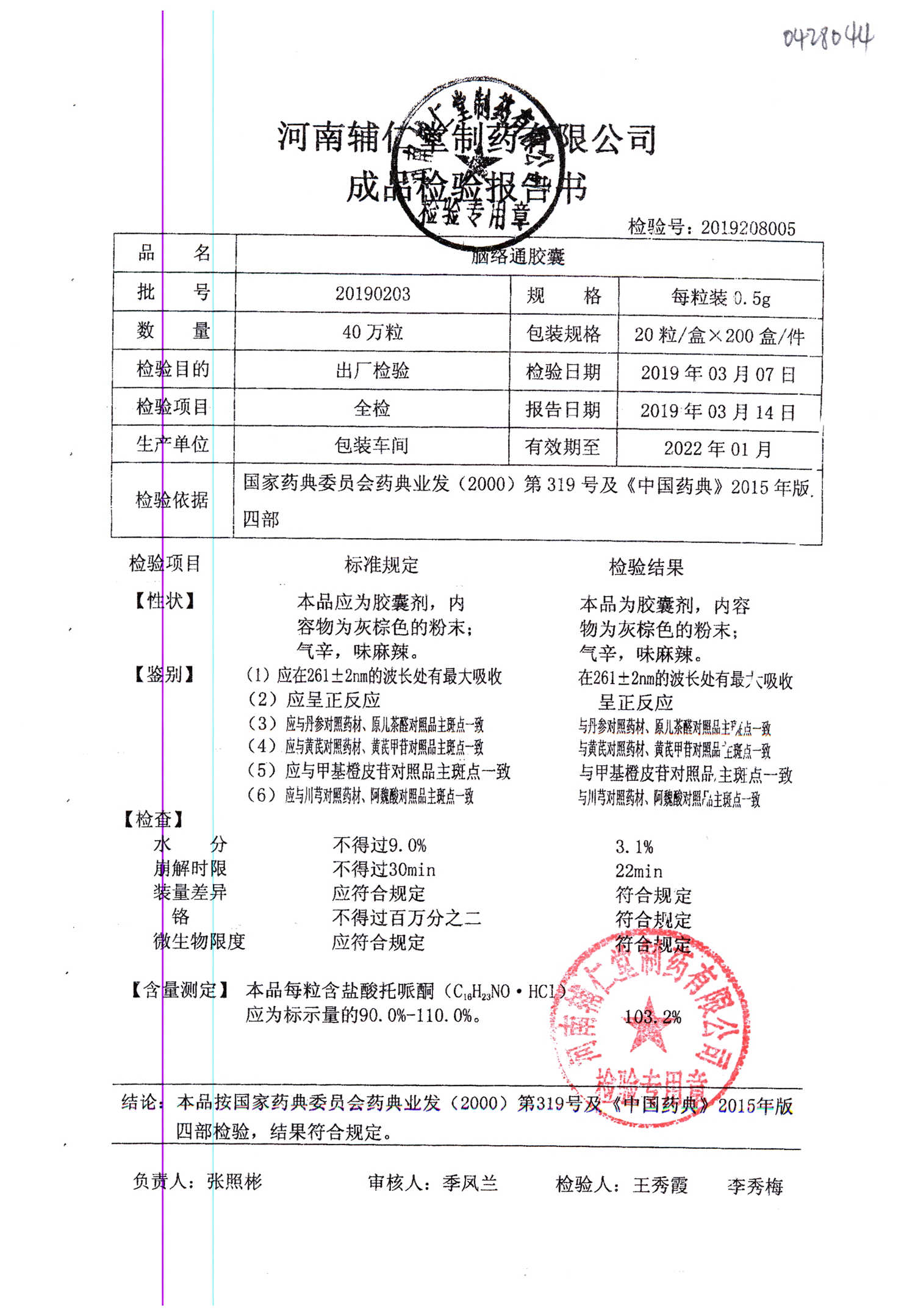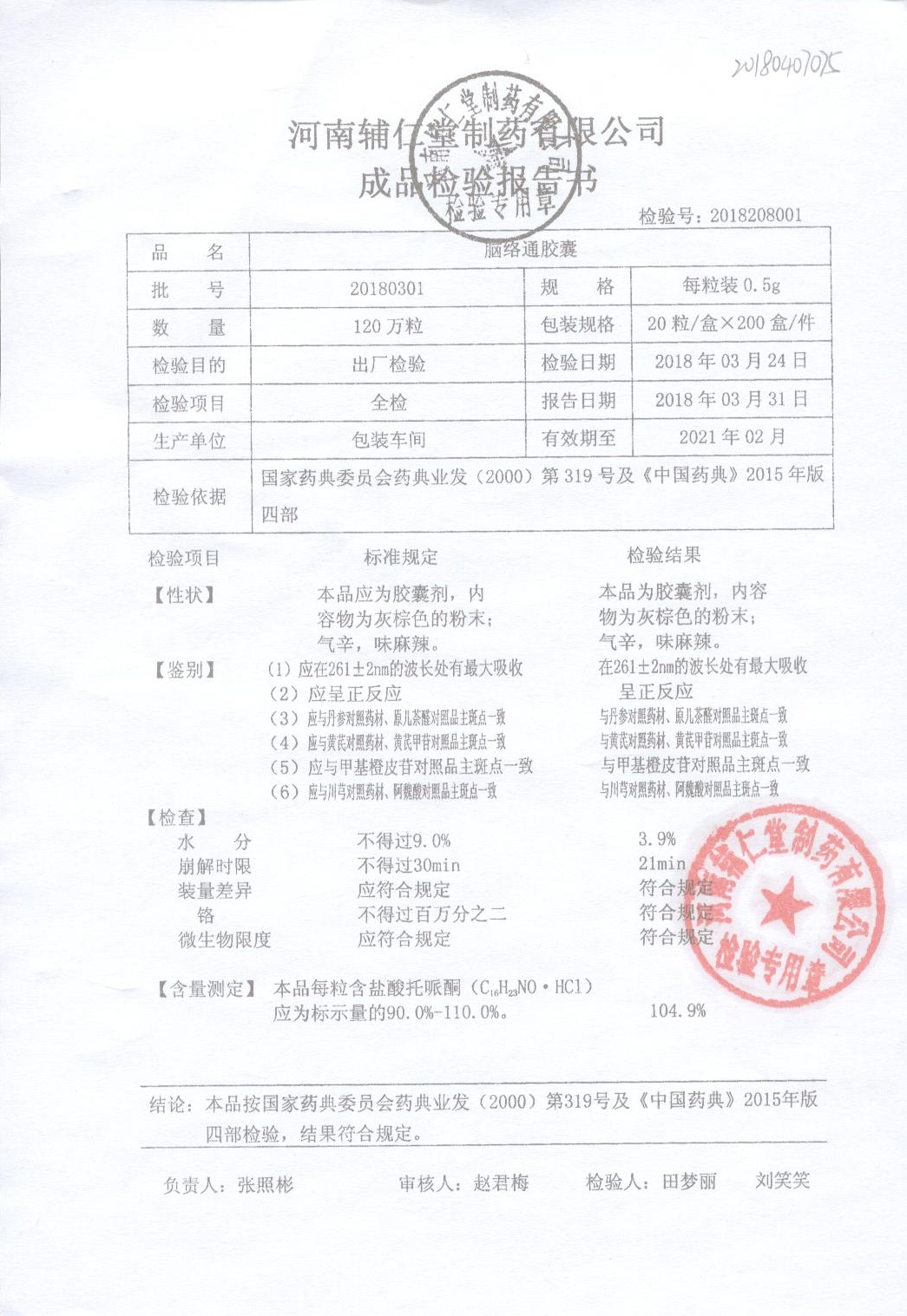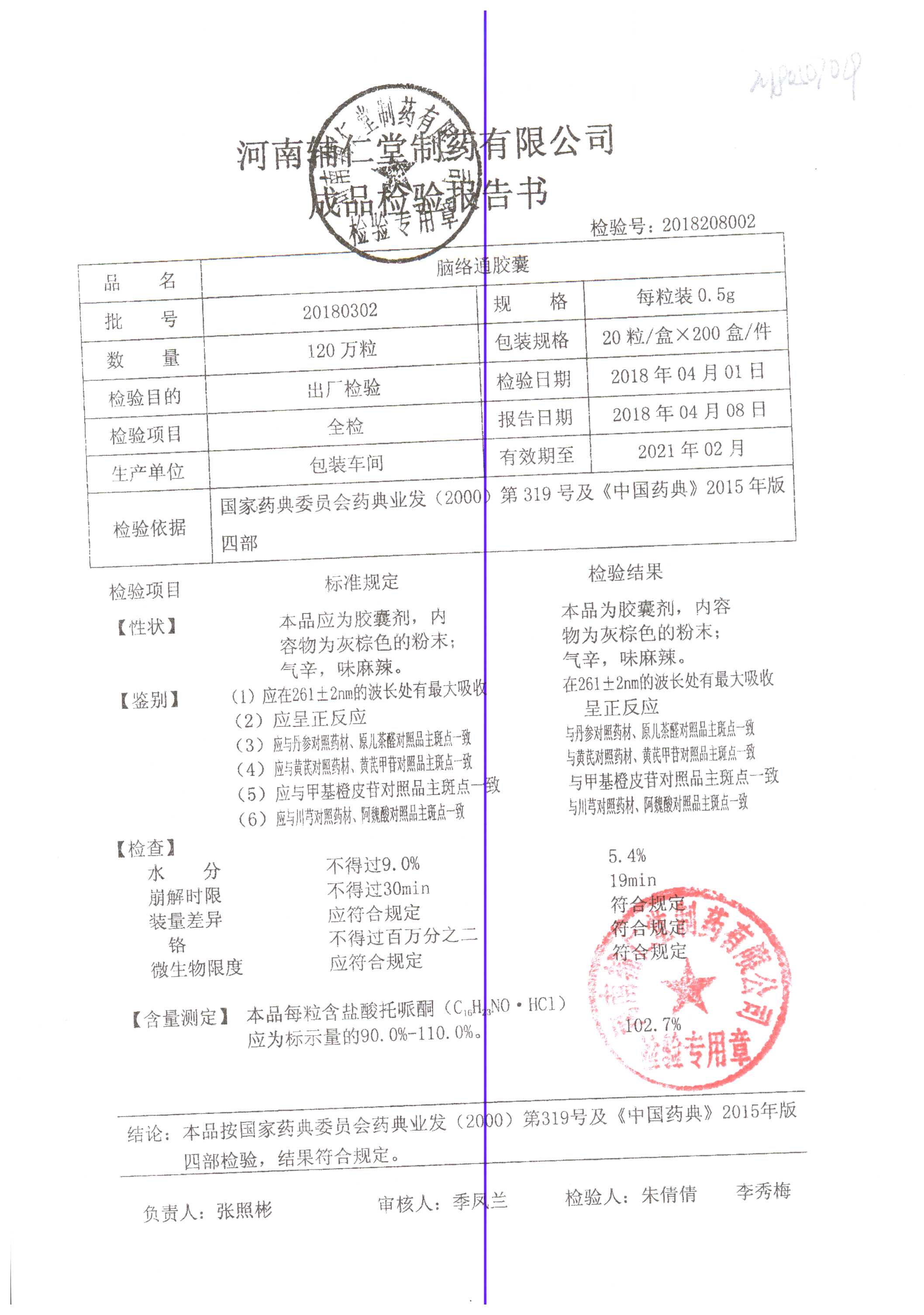 | 腦絡通膠囊 | 0.5g | 20180302 | 查看詳情 |