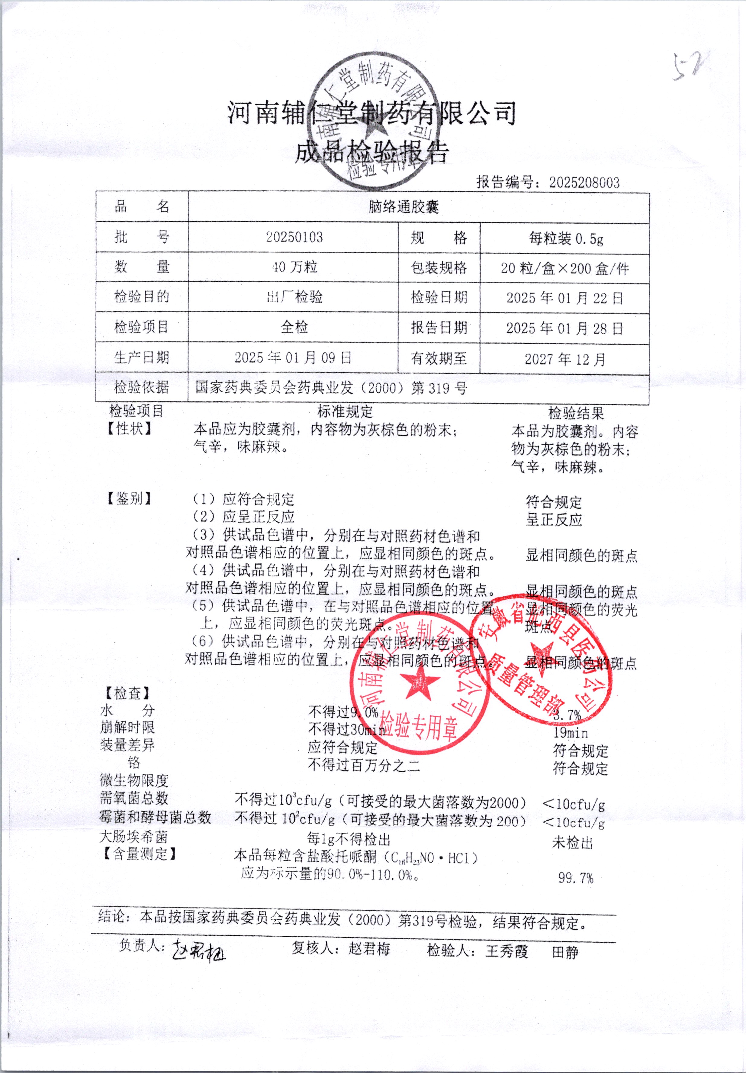 | 腦絡通膠囊 | 0.5g | 20250103 | 查看詳情 |