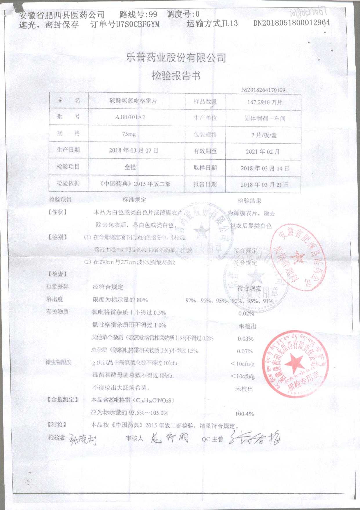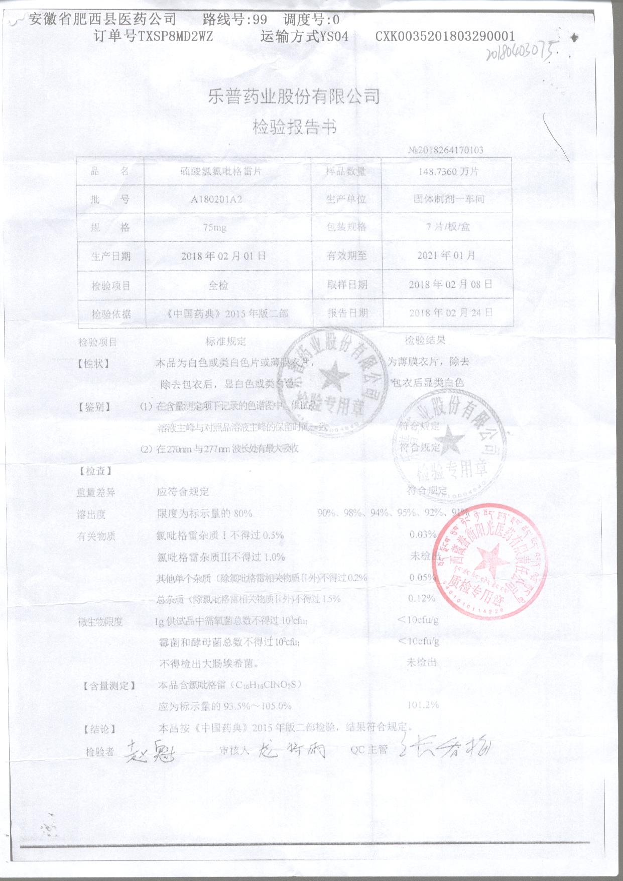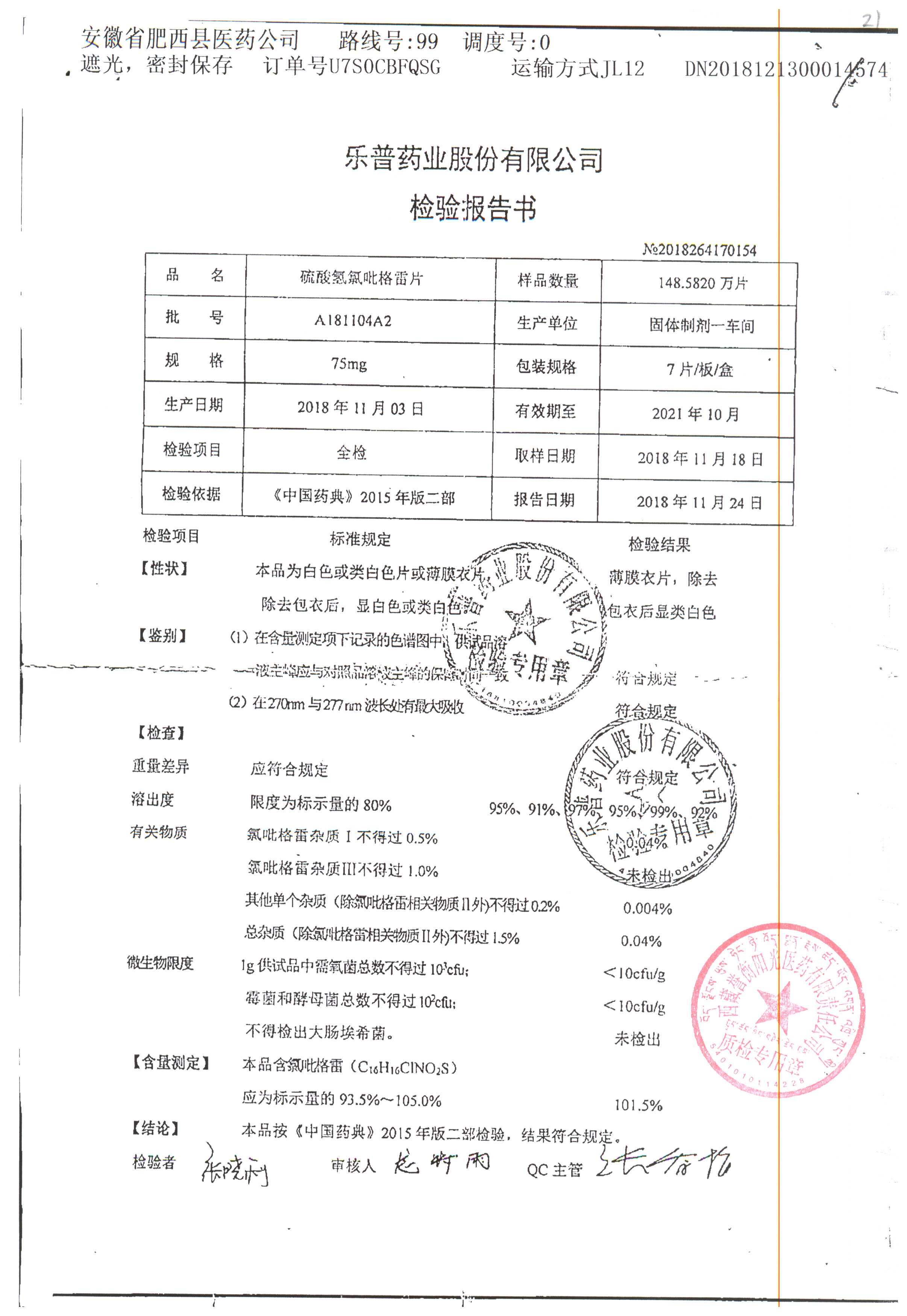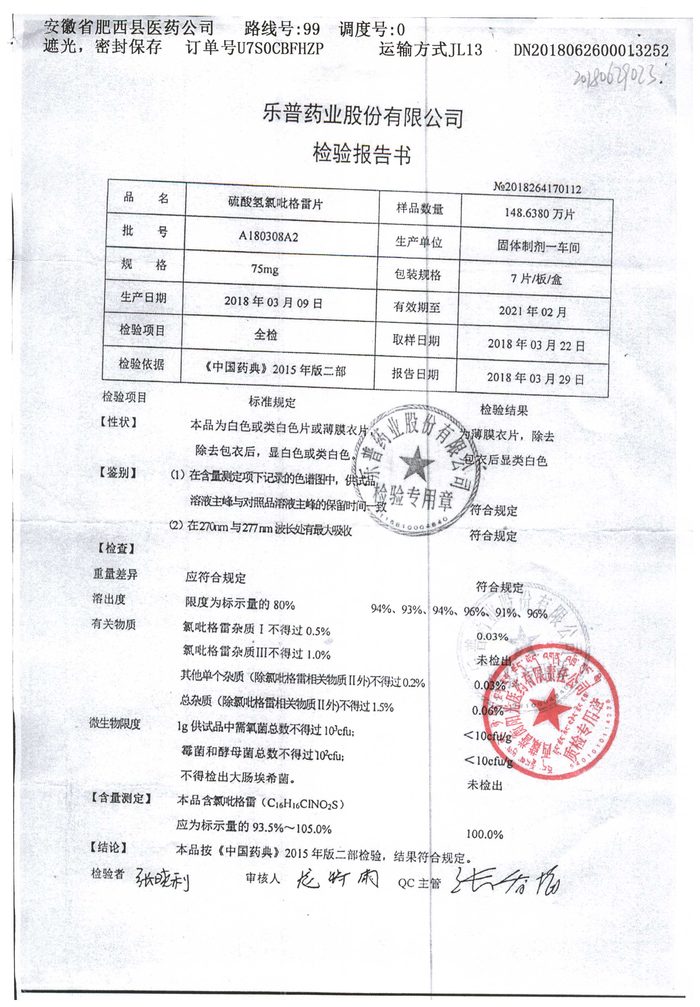 | 硫酸氫氯吡格雷片 | 75mg*7片 | A180604A2 | 查看詳情 |
