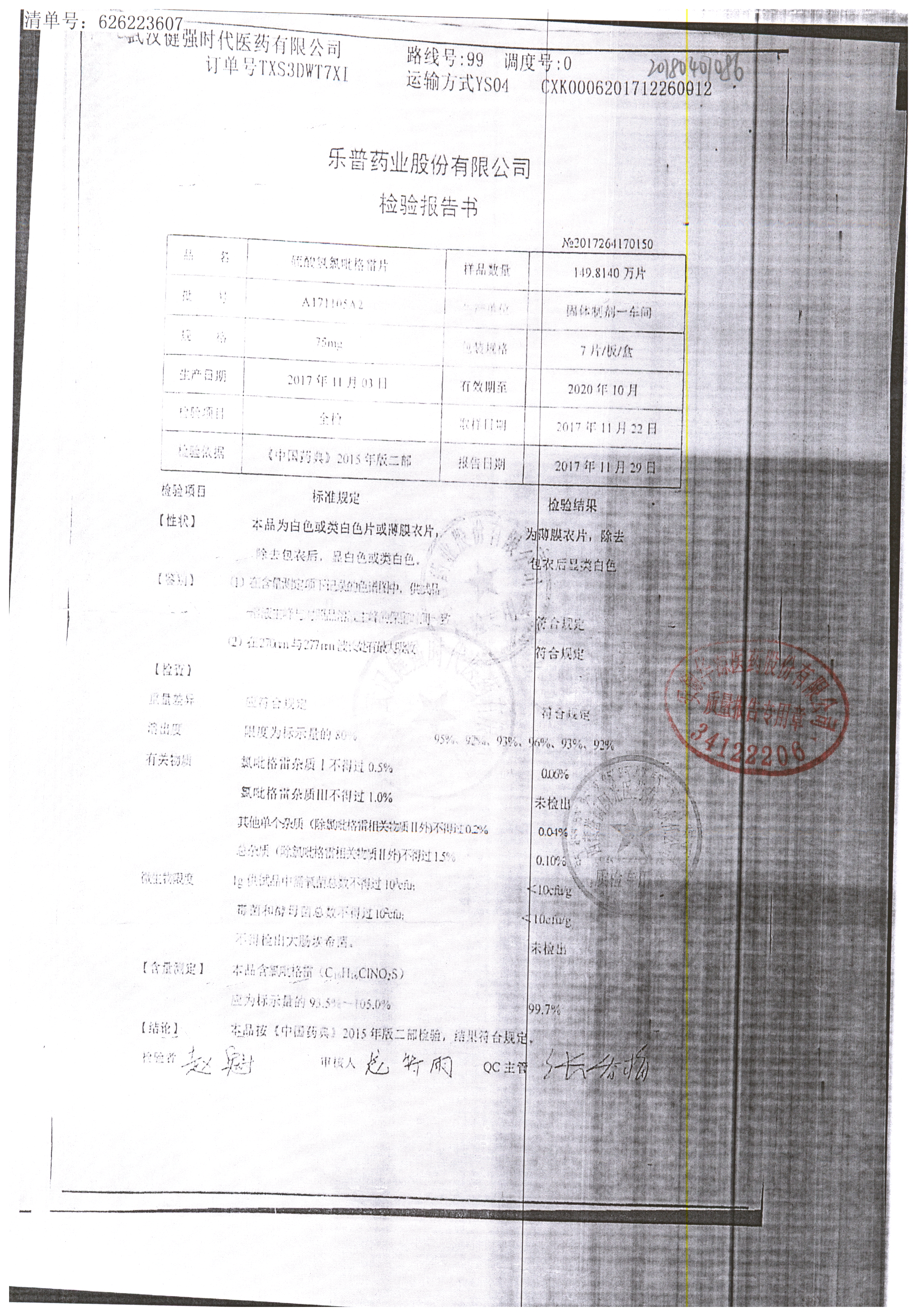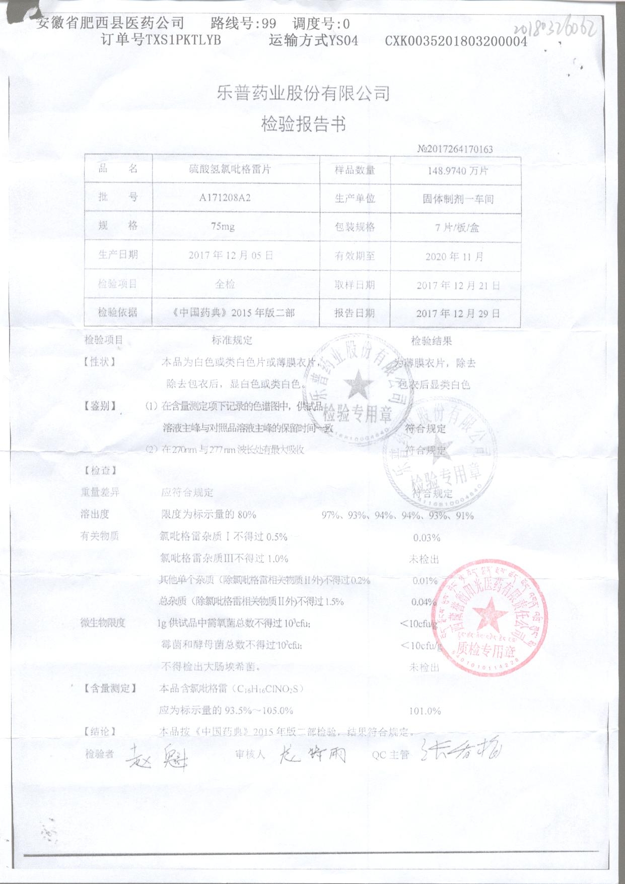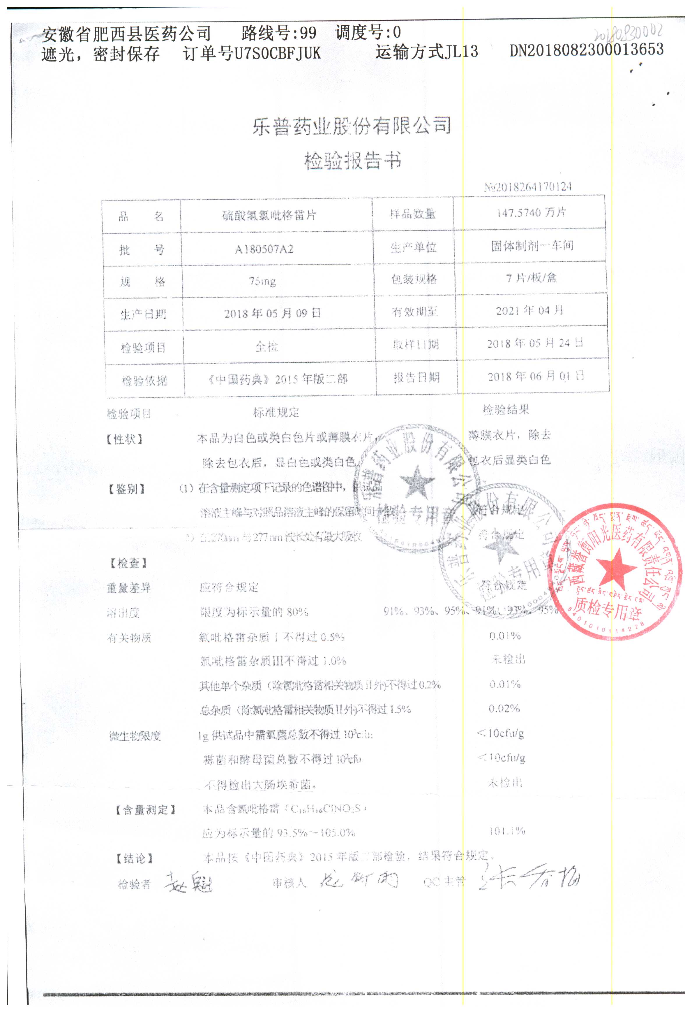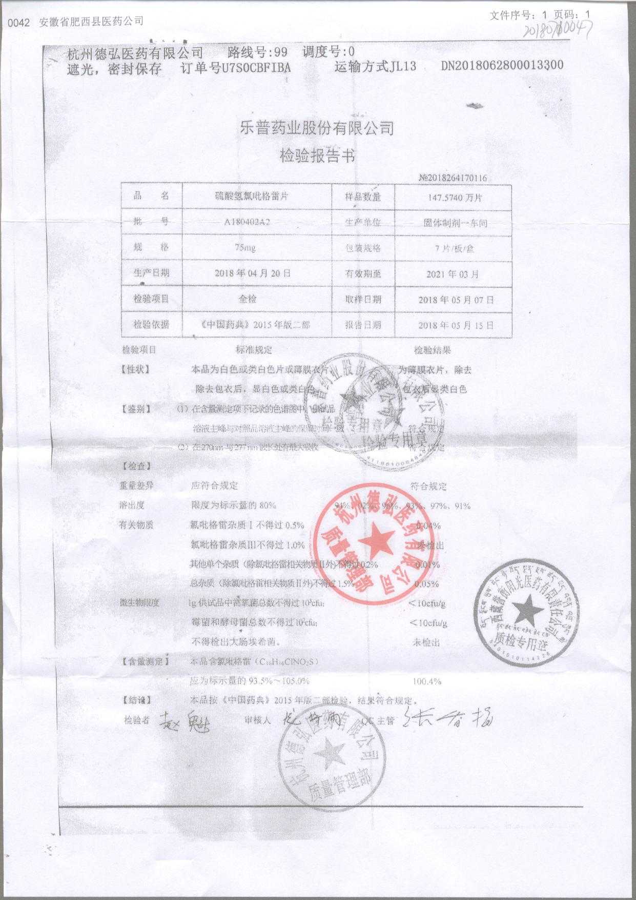 | 硫酸氫氯吡格雷片 | 75mg*7片 | A180604A2 | 查看詳情 |