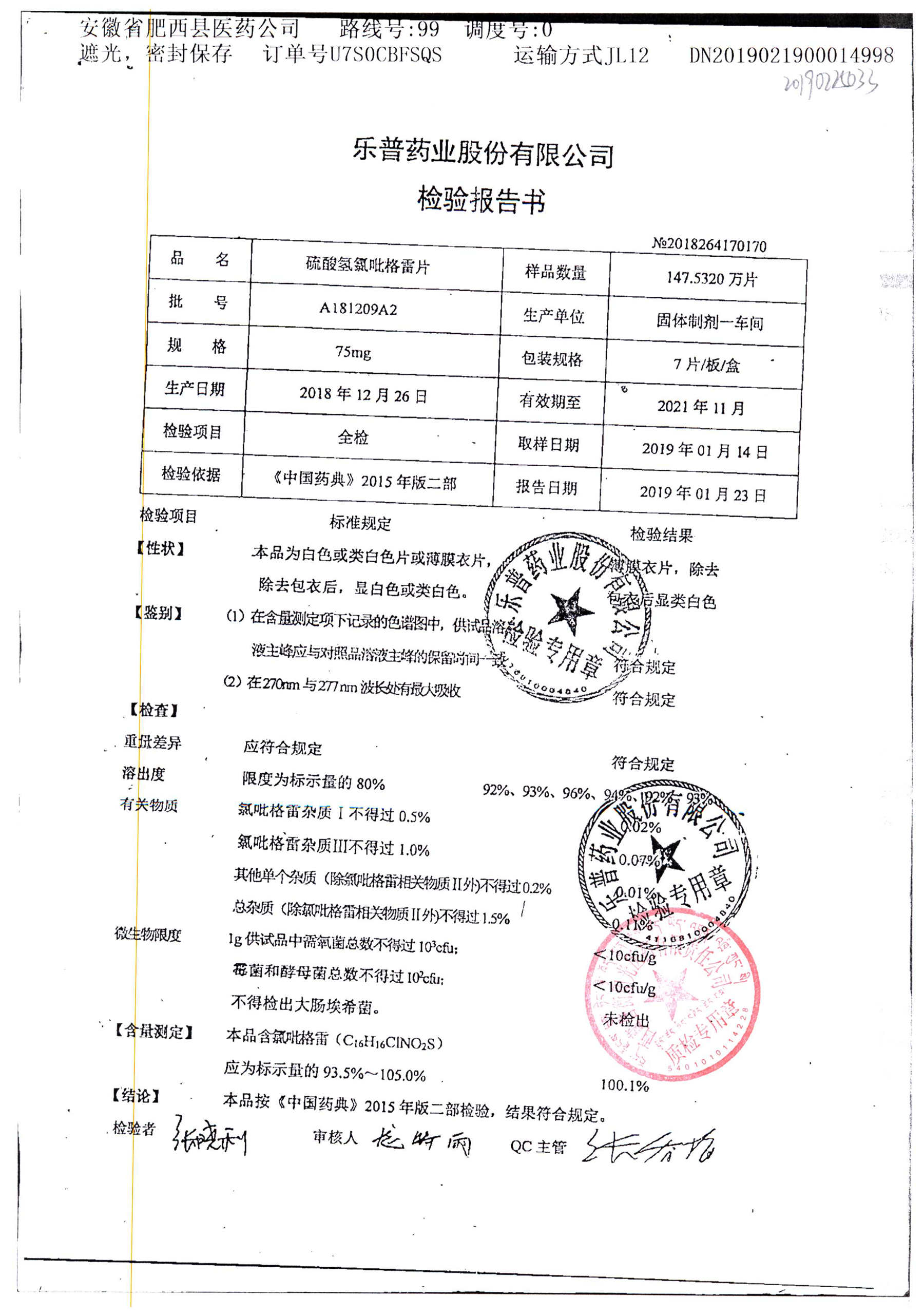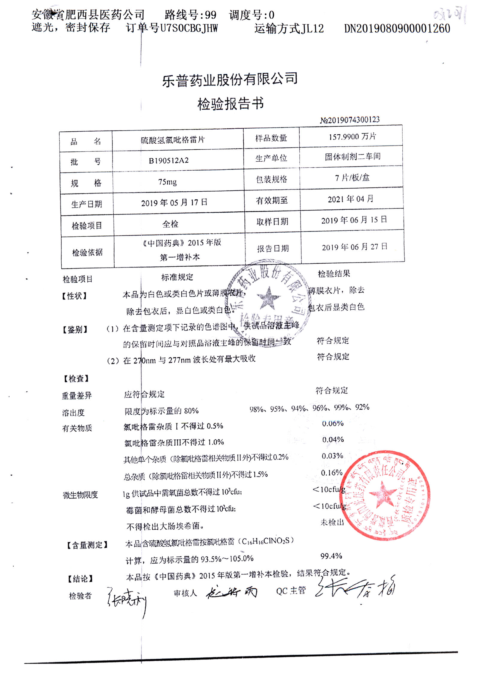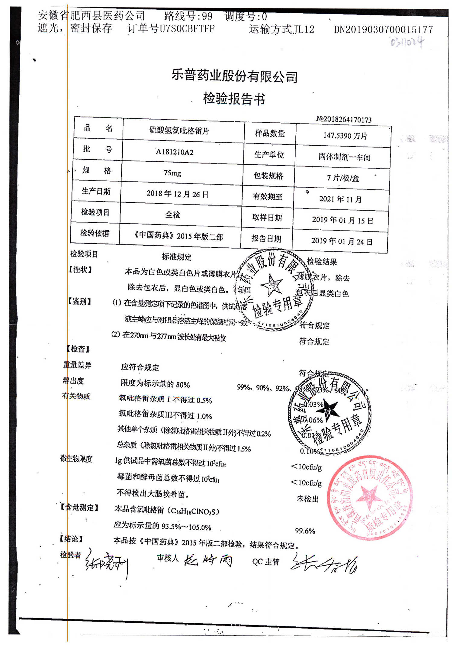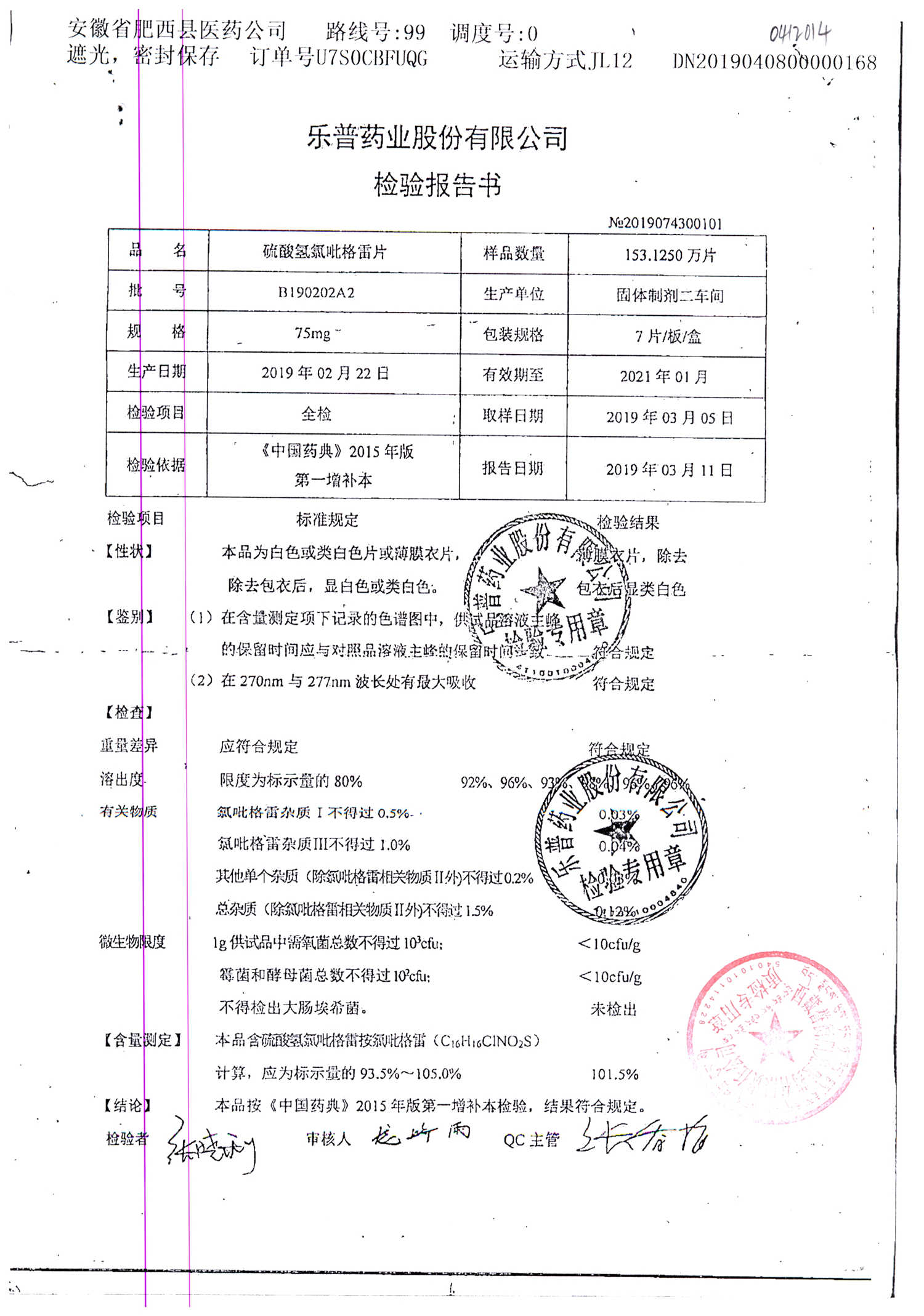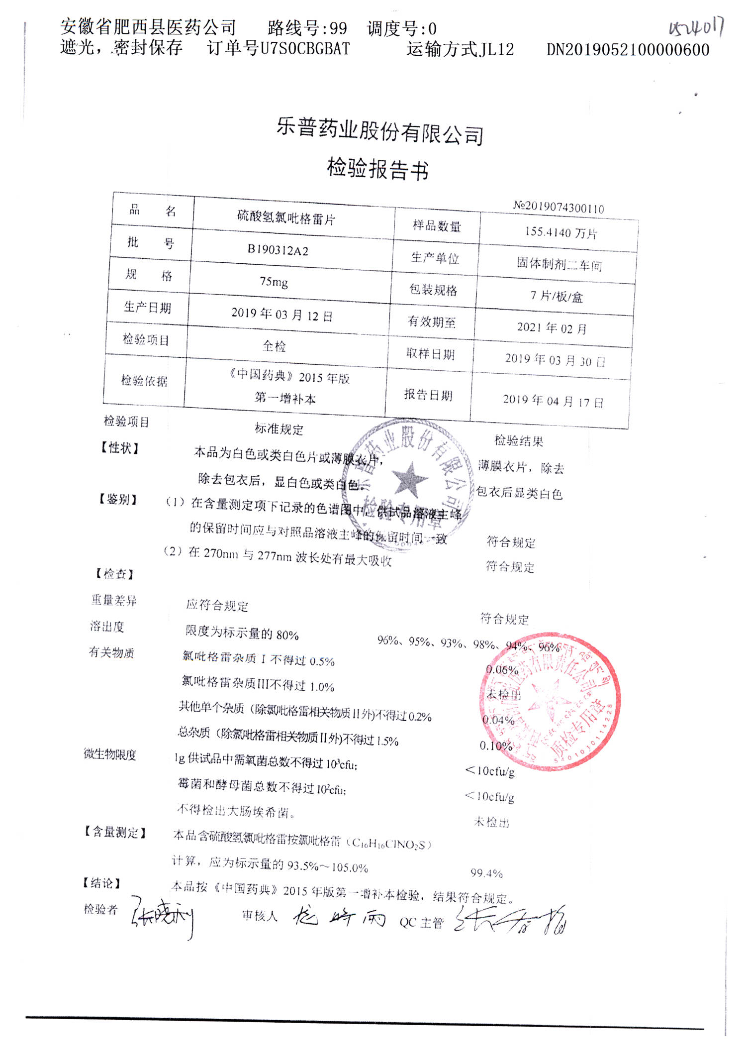| 硫酸氫氯吡格雷片 | 75mg*7片 | A190407A2 | 查看詳情 |