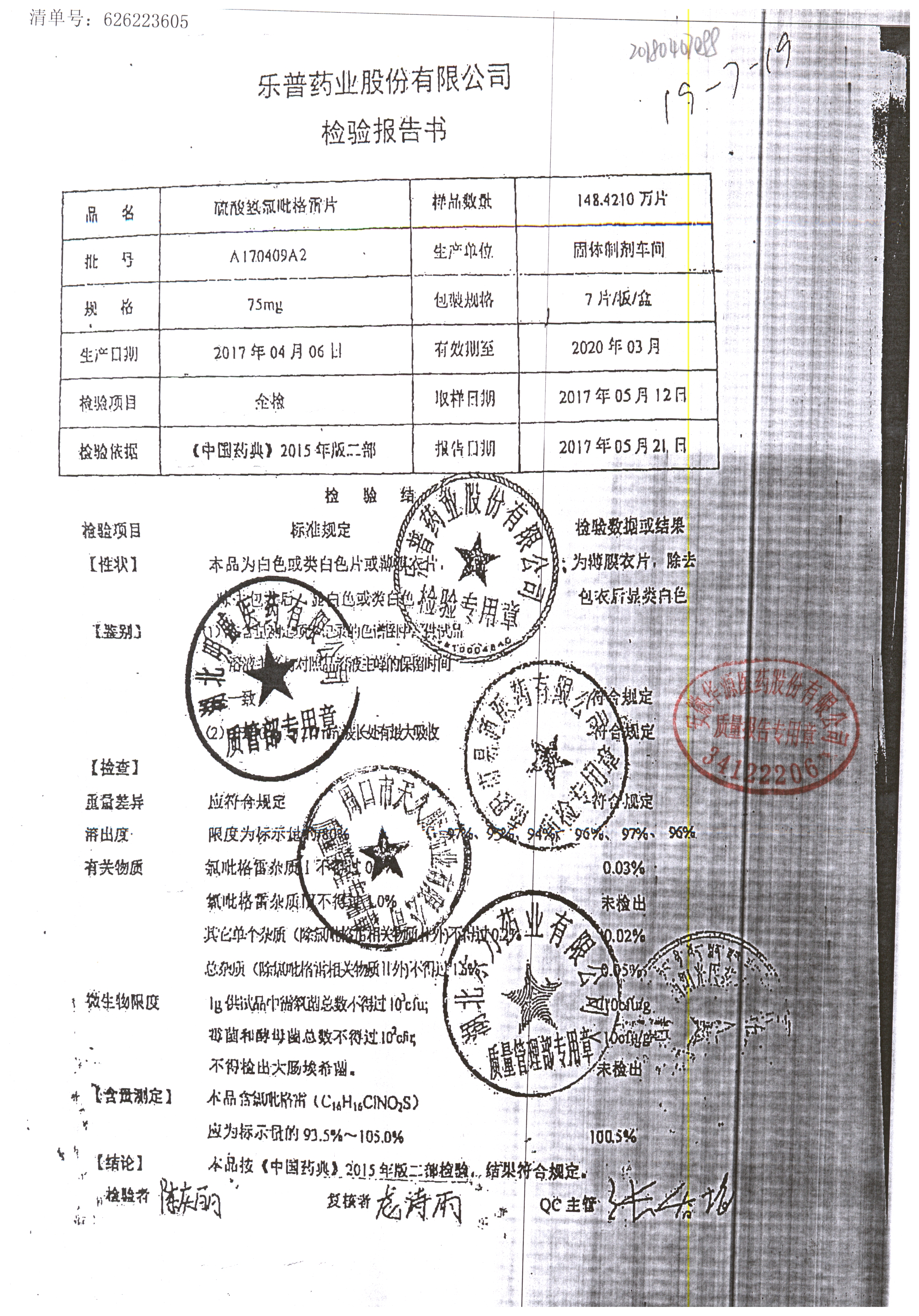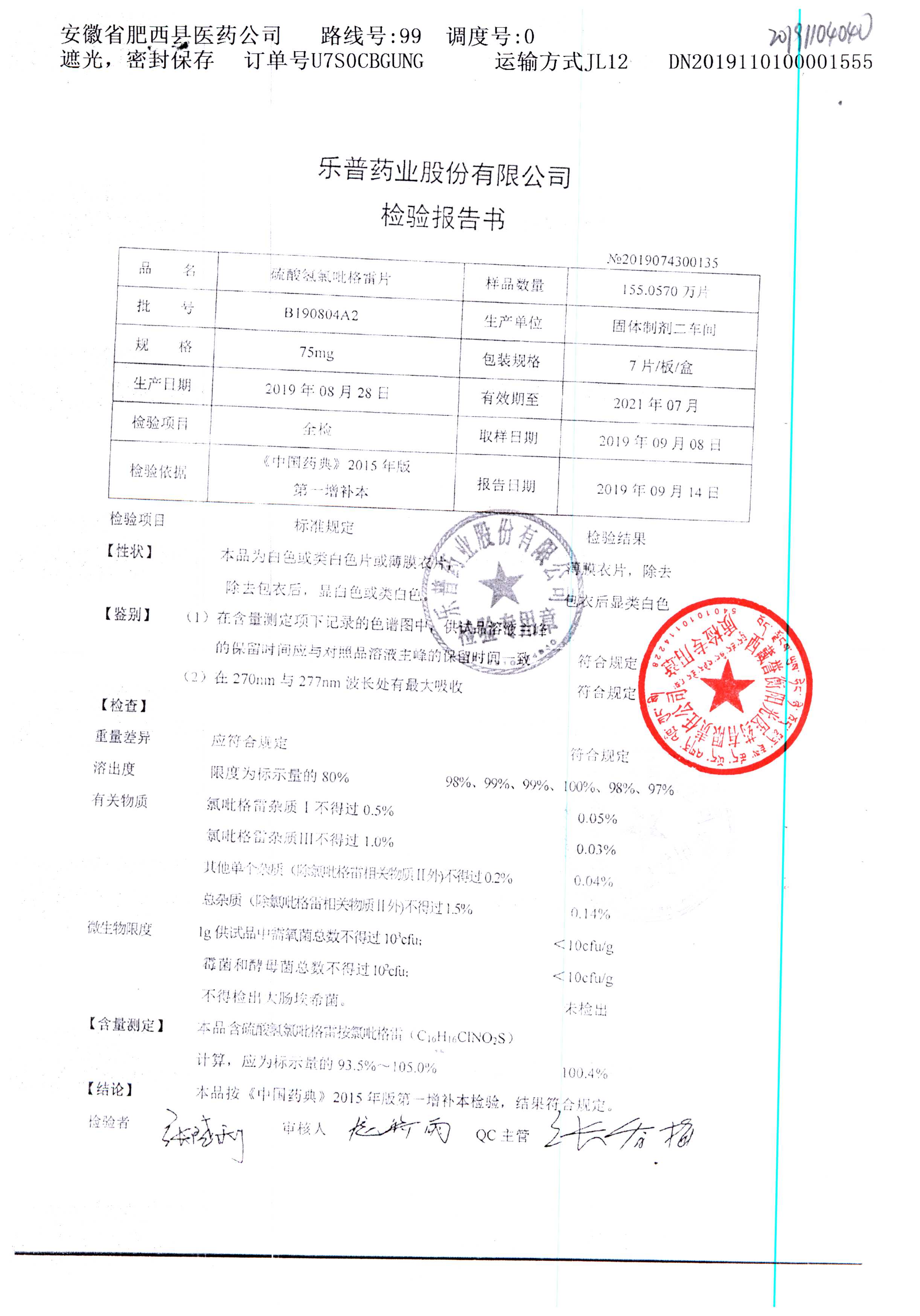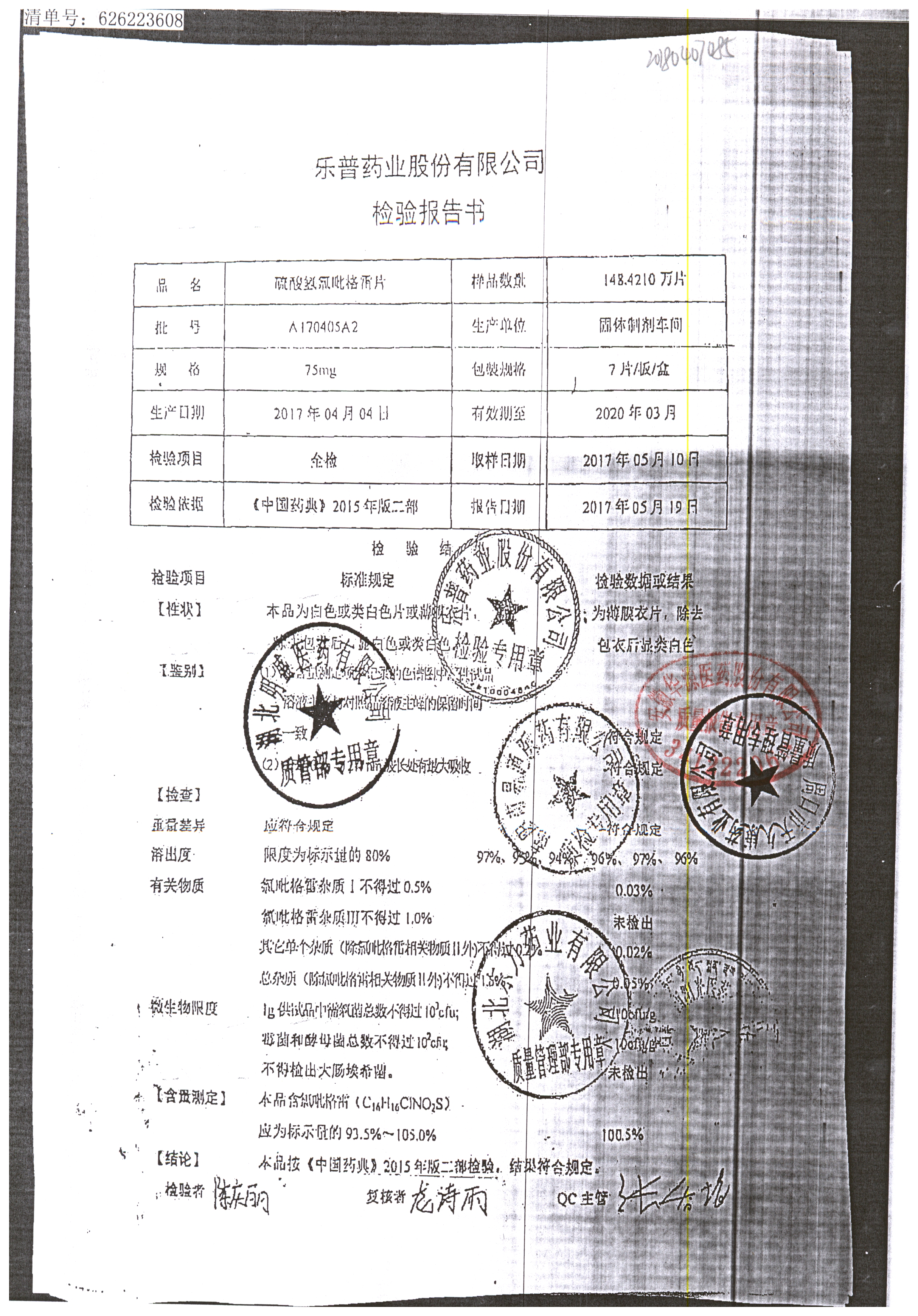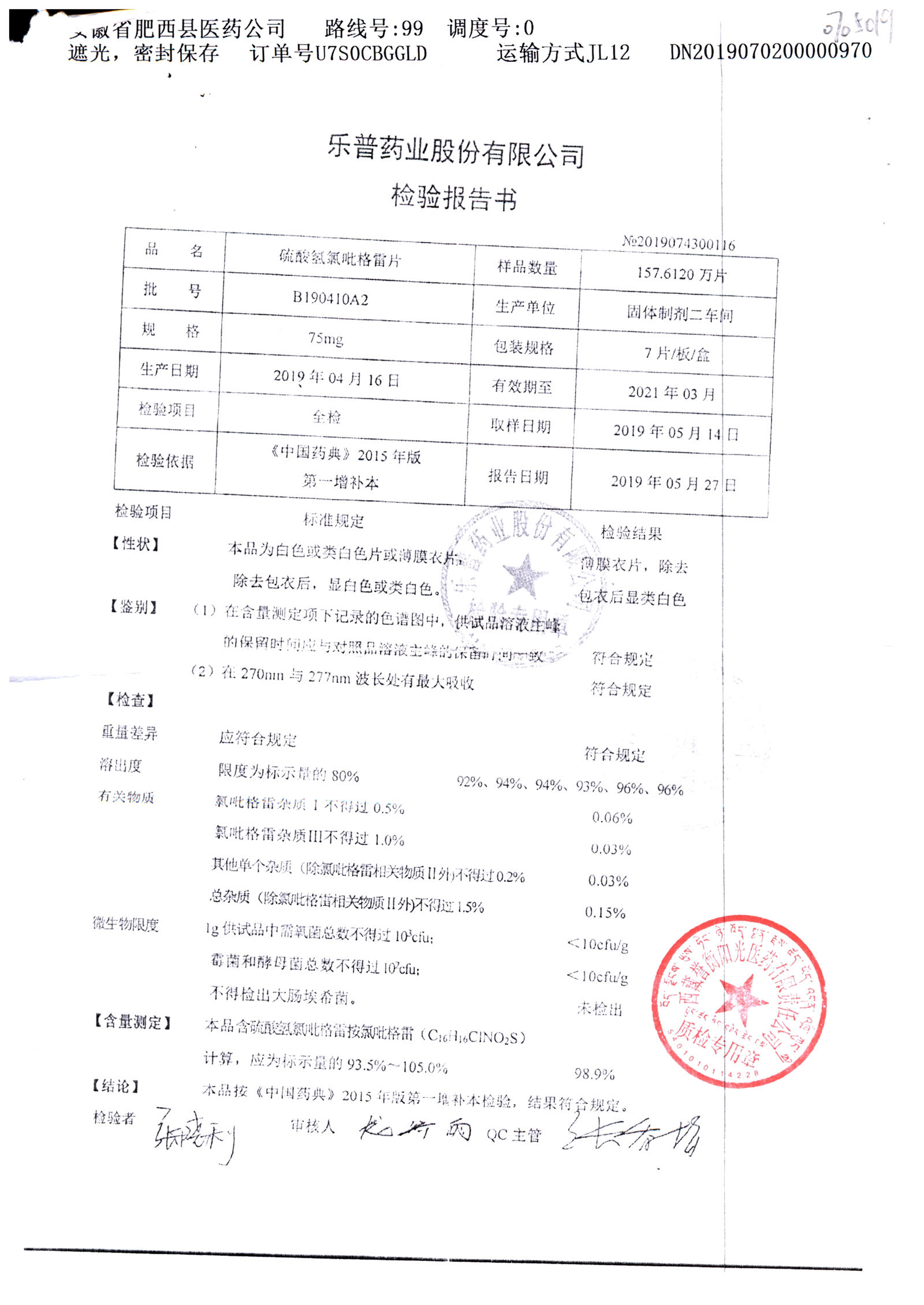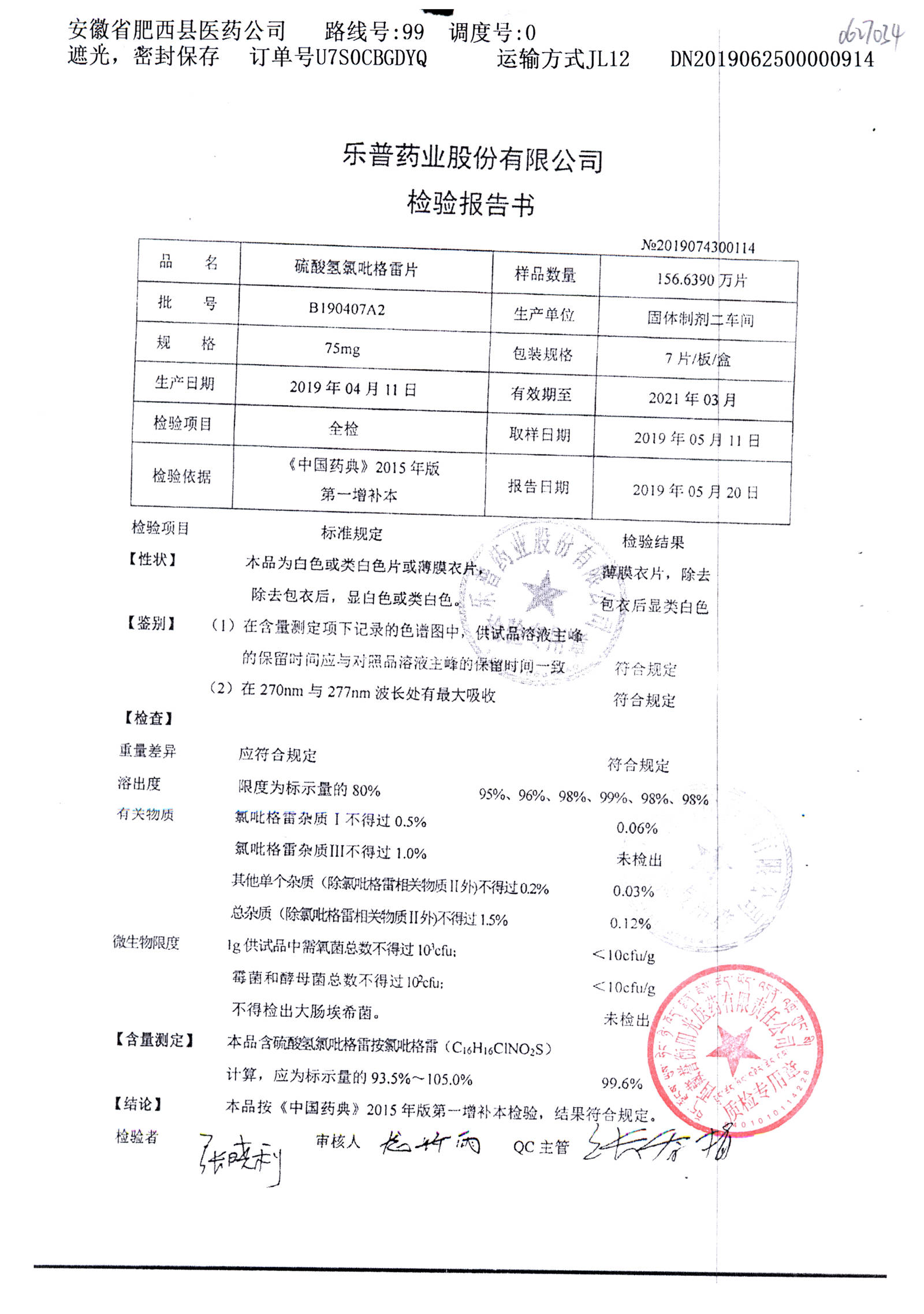 | 硫酸氫氯吡格雷片 | 75mg*7片 | A190407A2 | 查看詳情 |