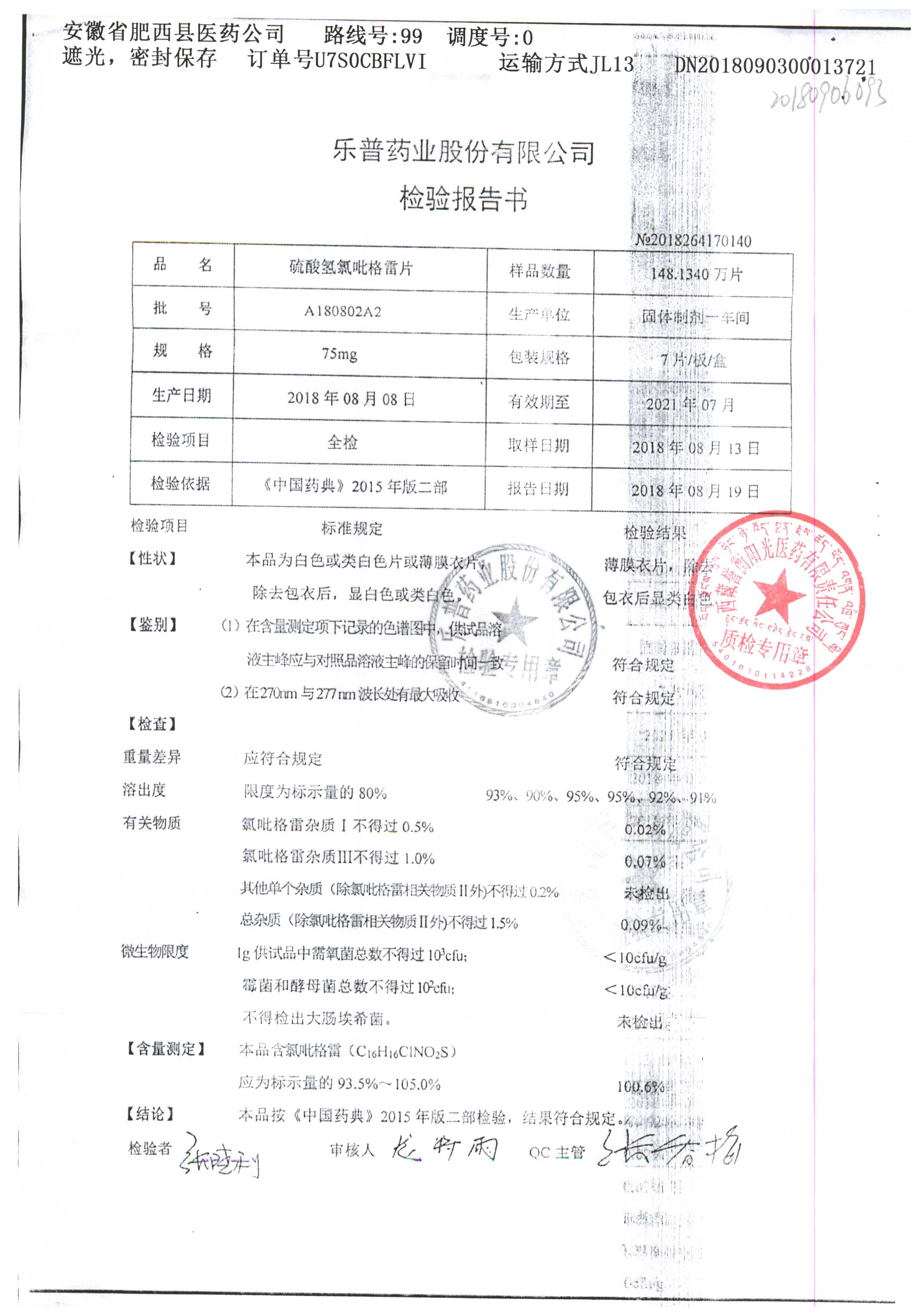| 硫酸氫氯吡格雷片 | 75mg*7片 | A180901A2 | 查看詳情 |