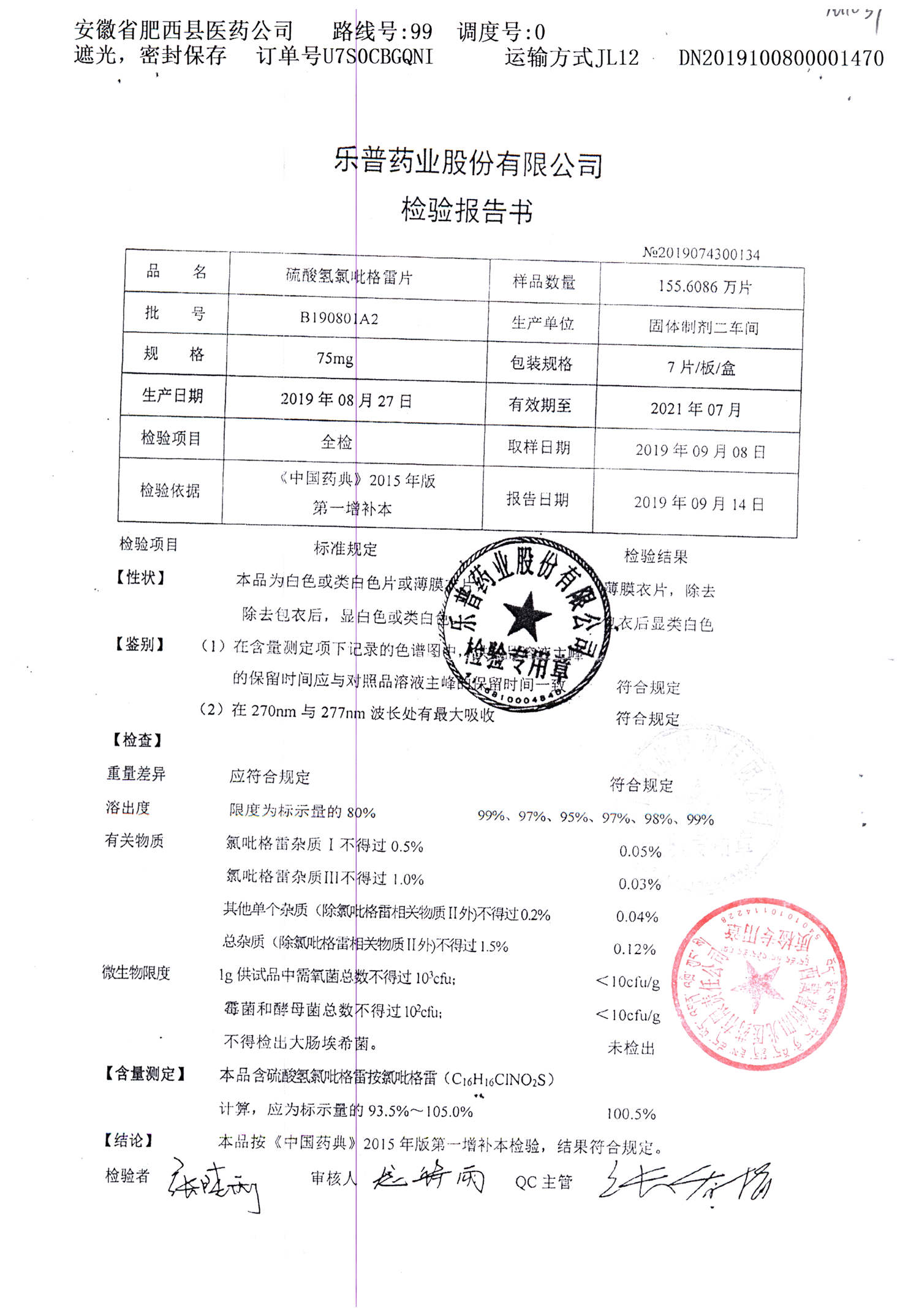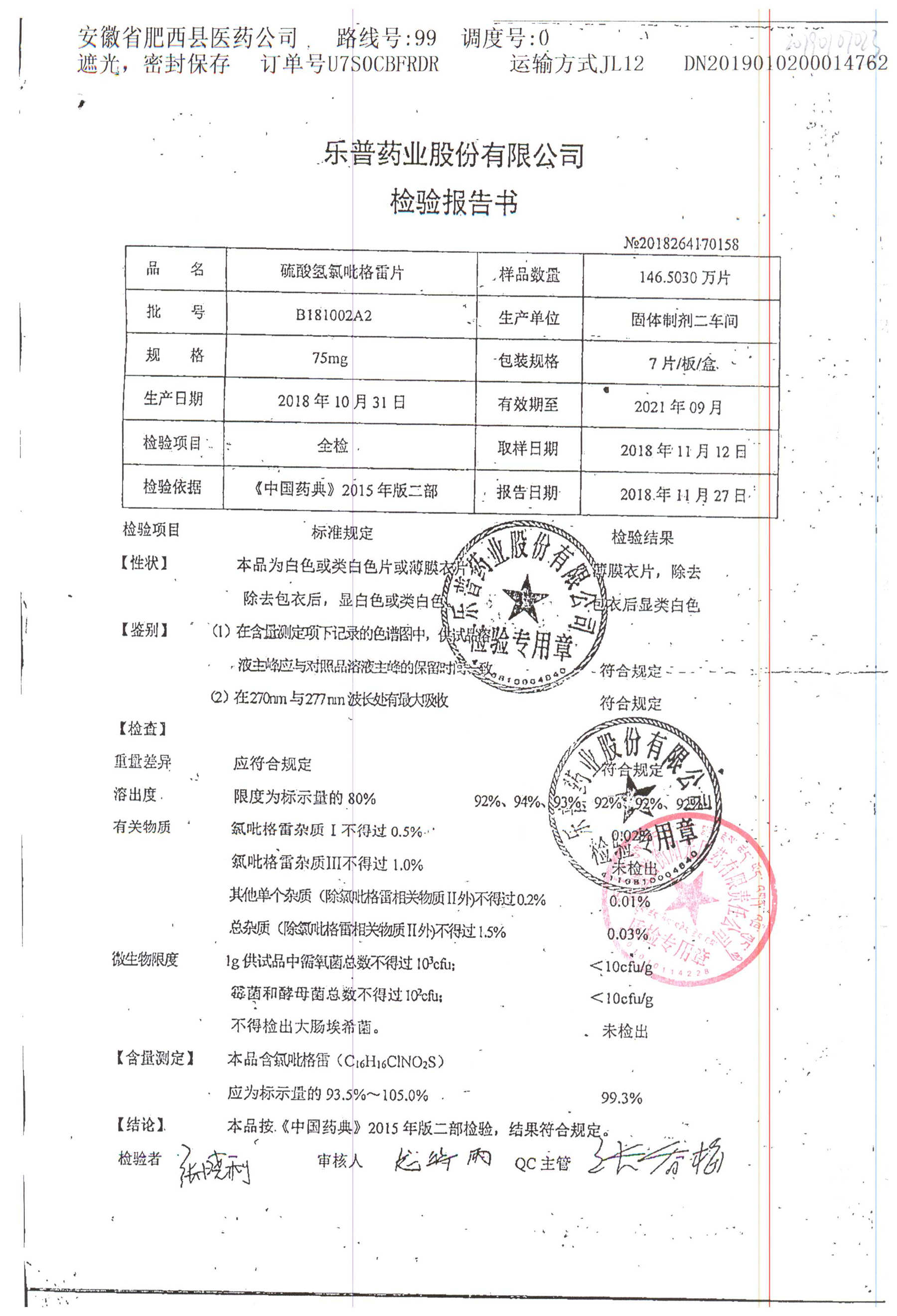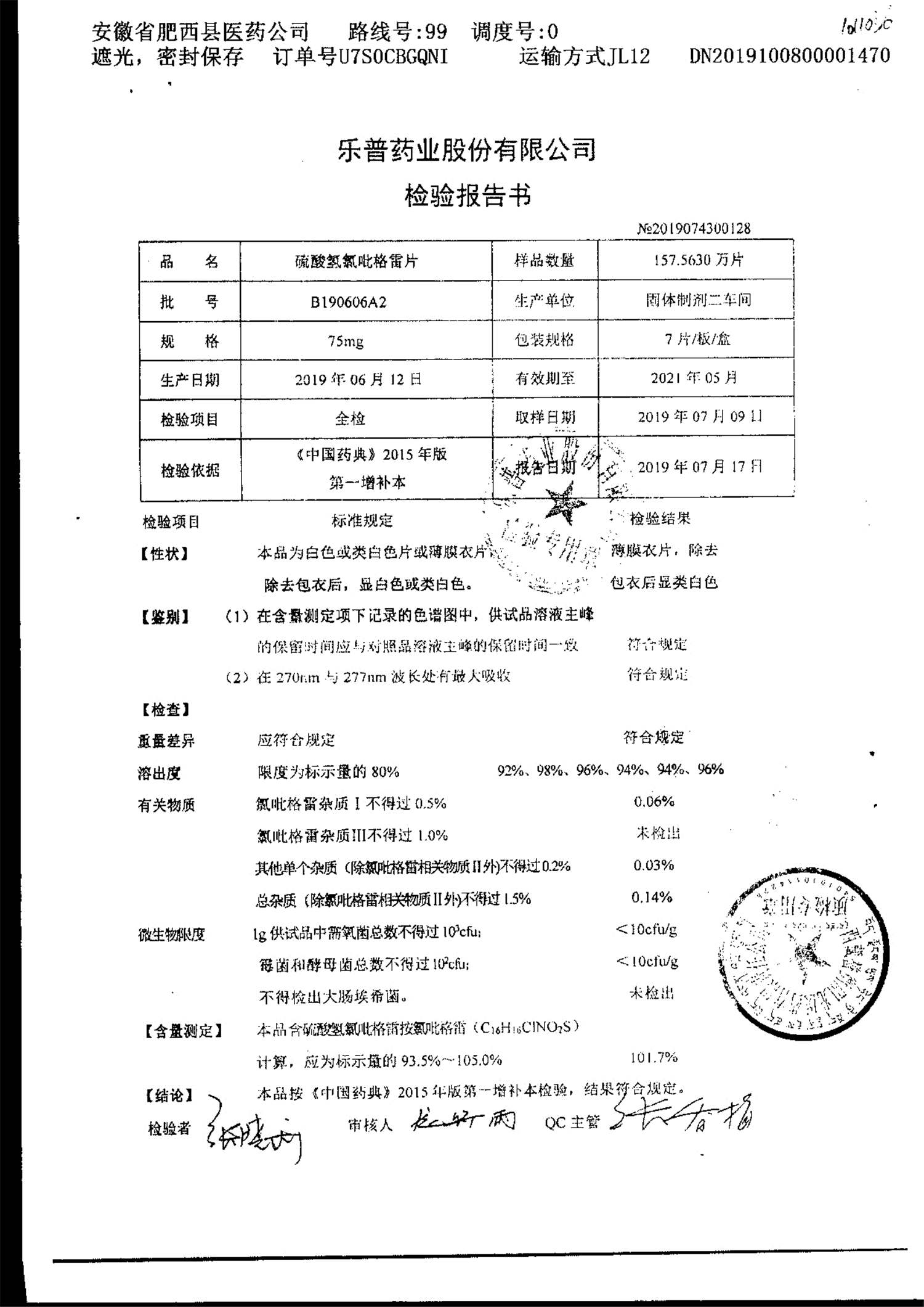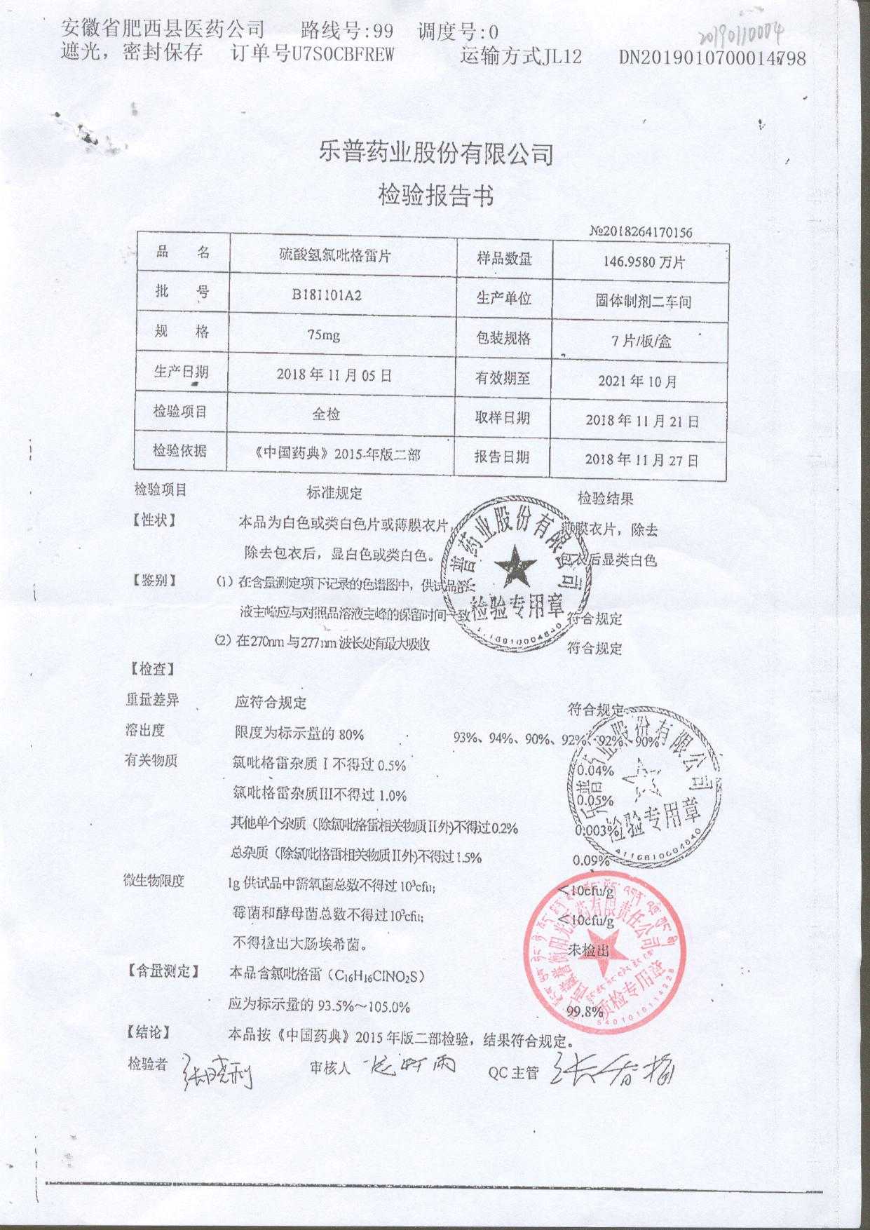 | 硫酸氫氯吡格雷片 | 75mg*7片 | B190801A2 | 查看詳情 |