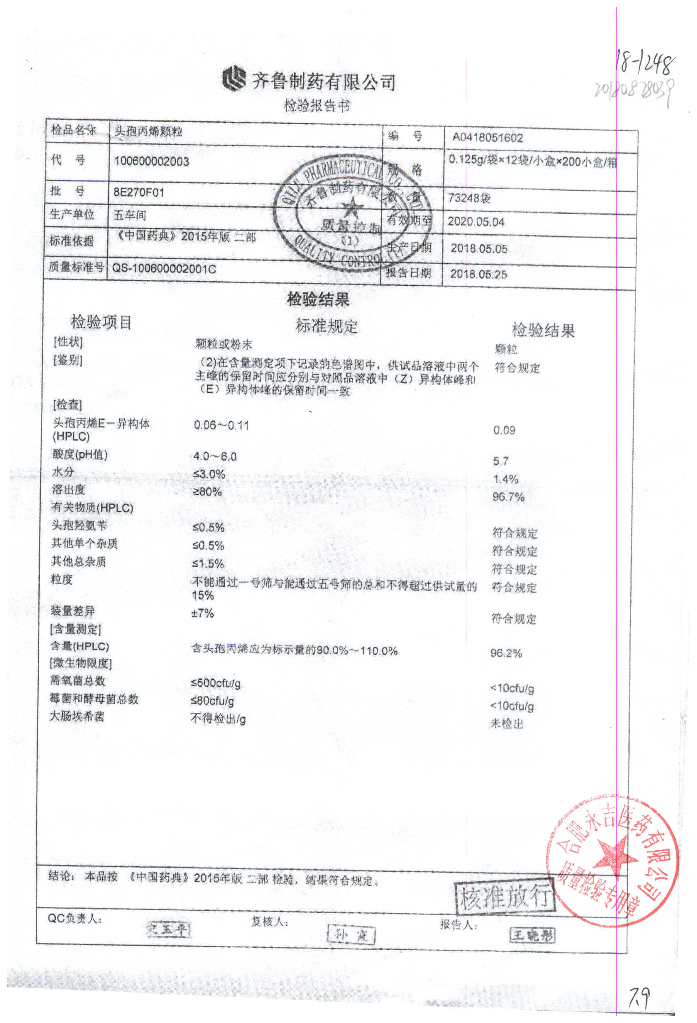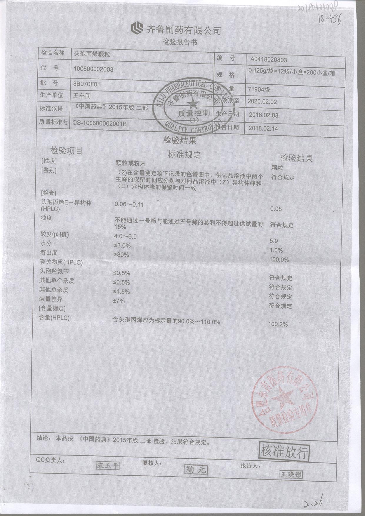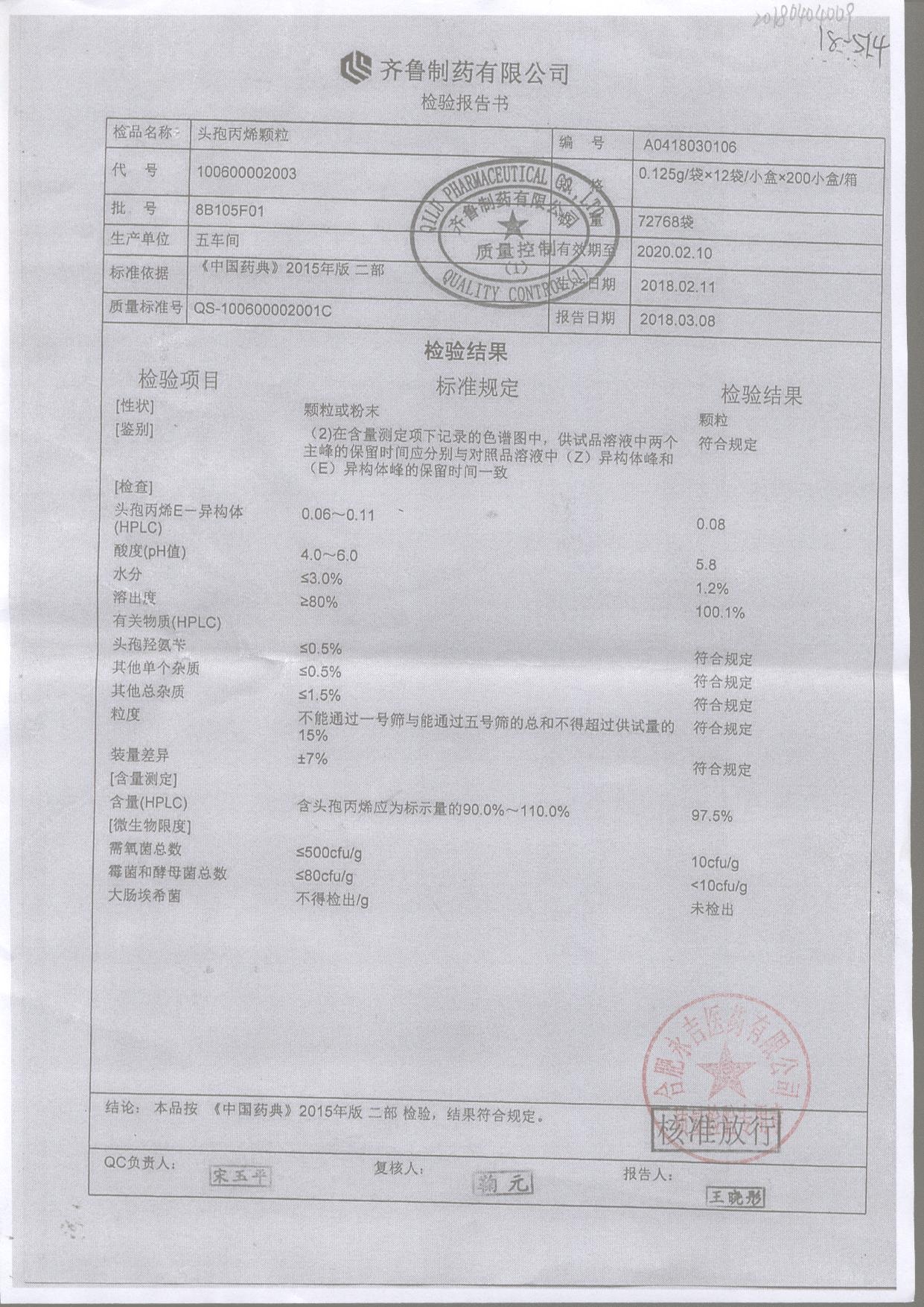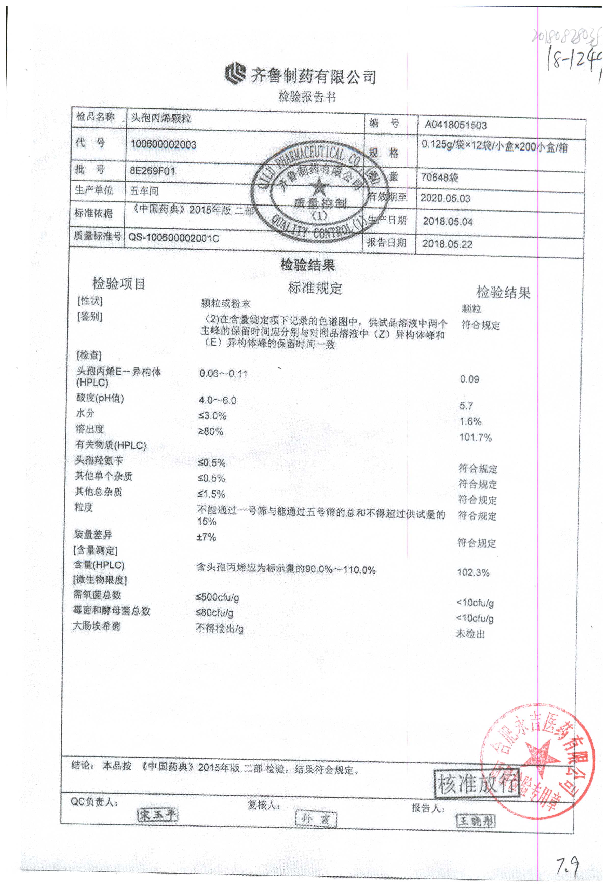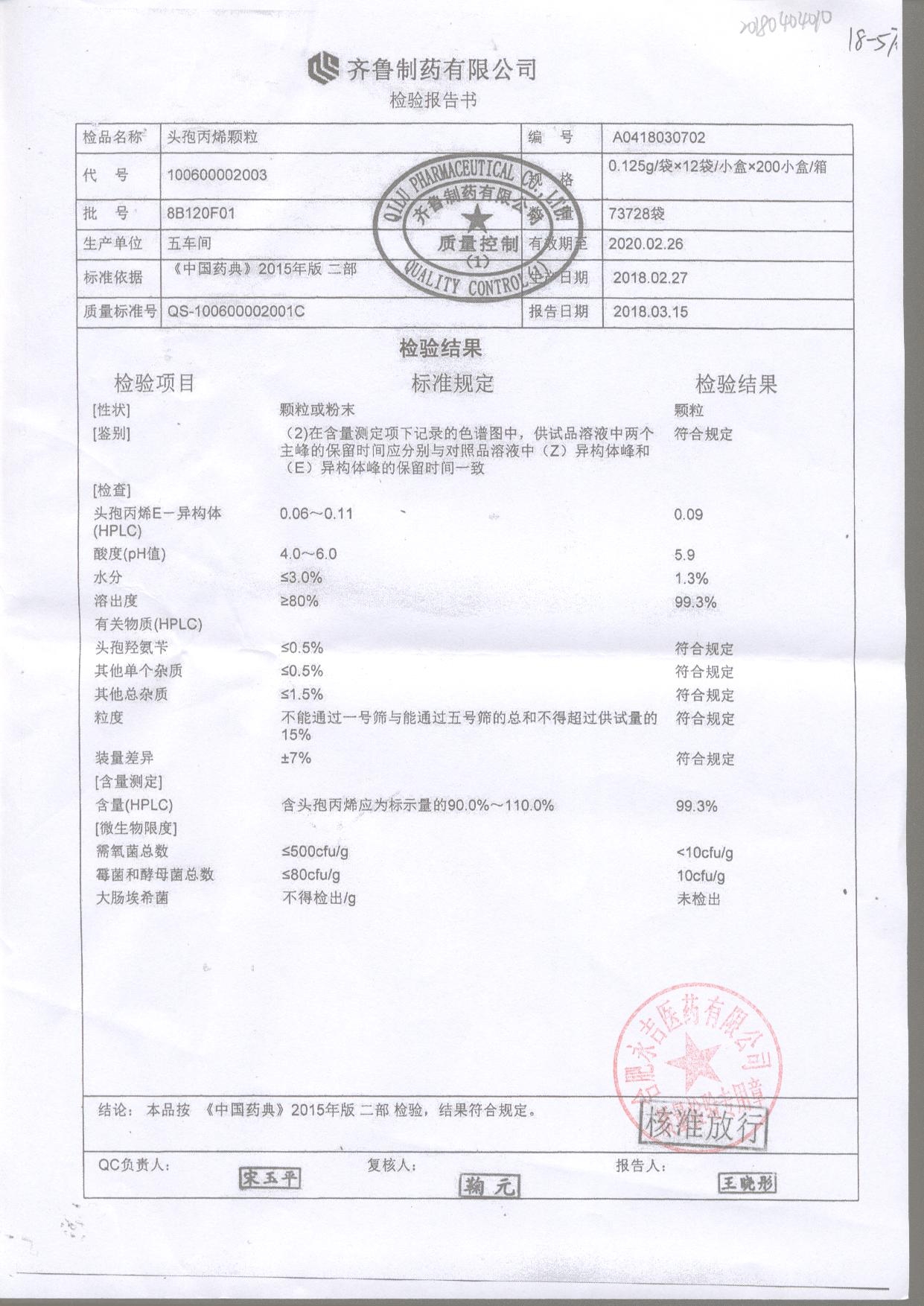 | 頭孢丙烯顆粒 | 0.125g*12袋 | 8H420F01 | 查看詳情 |