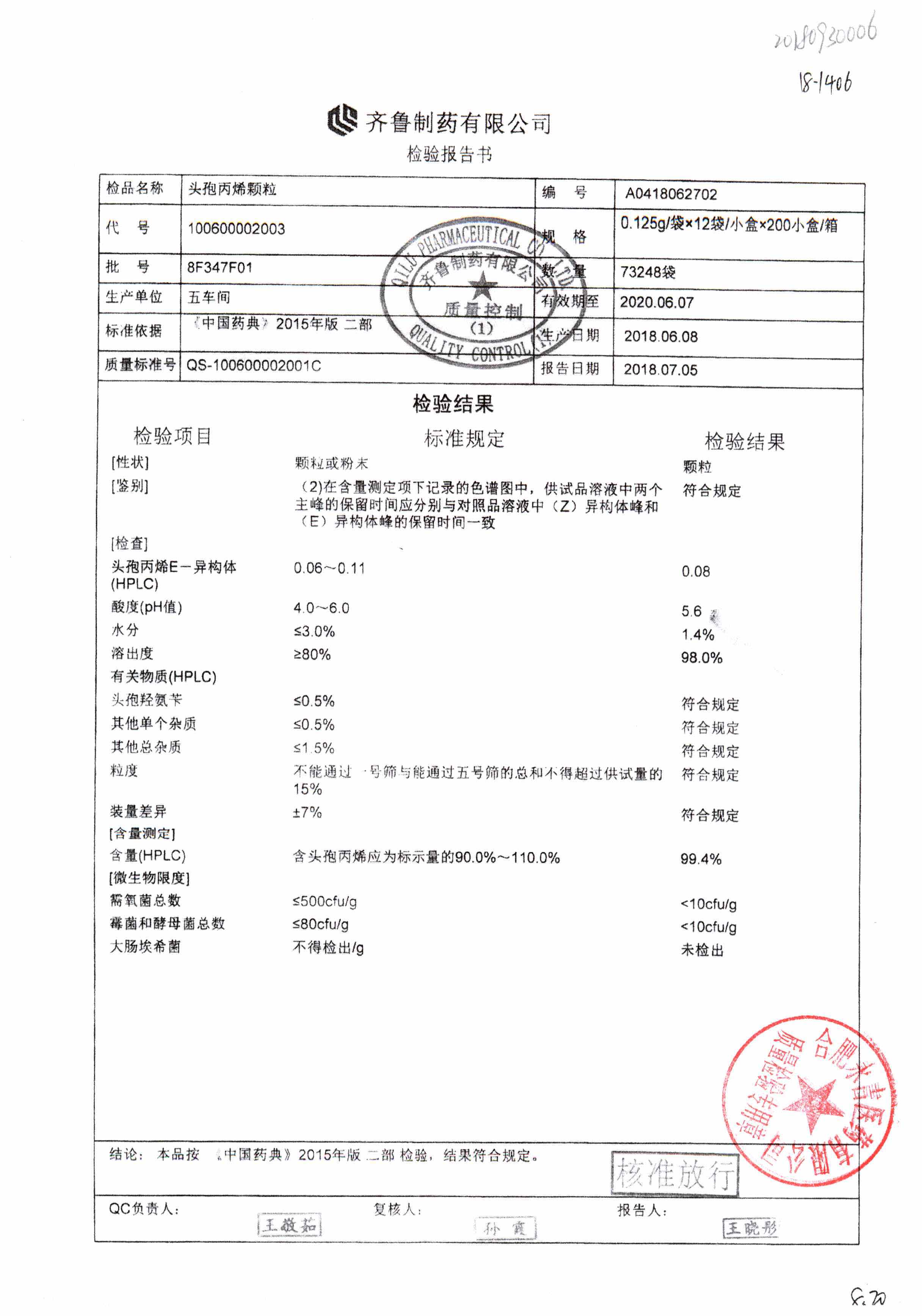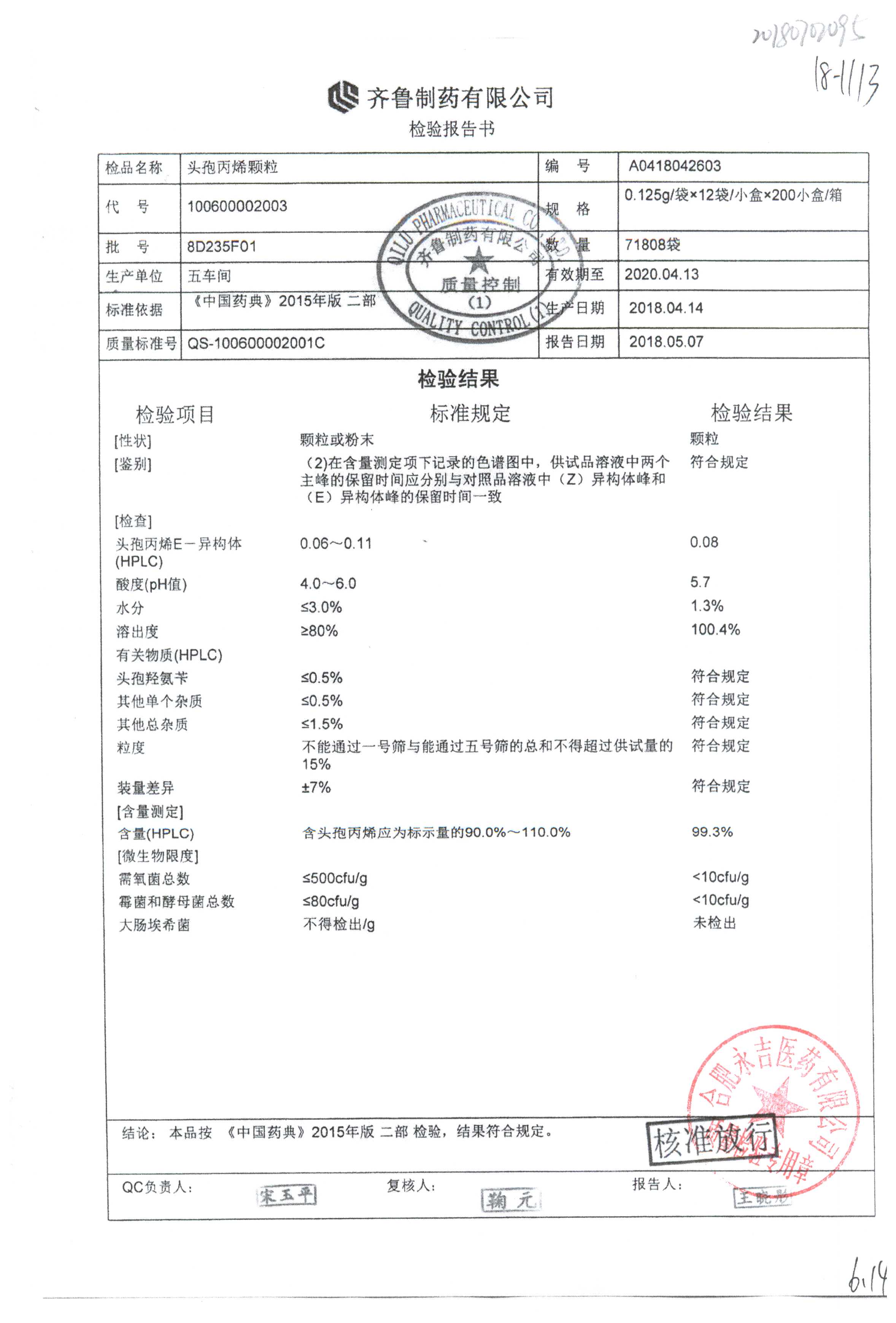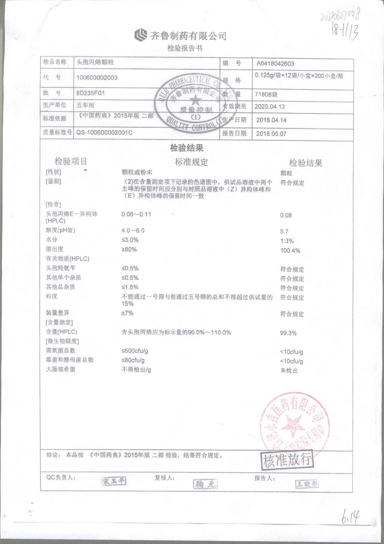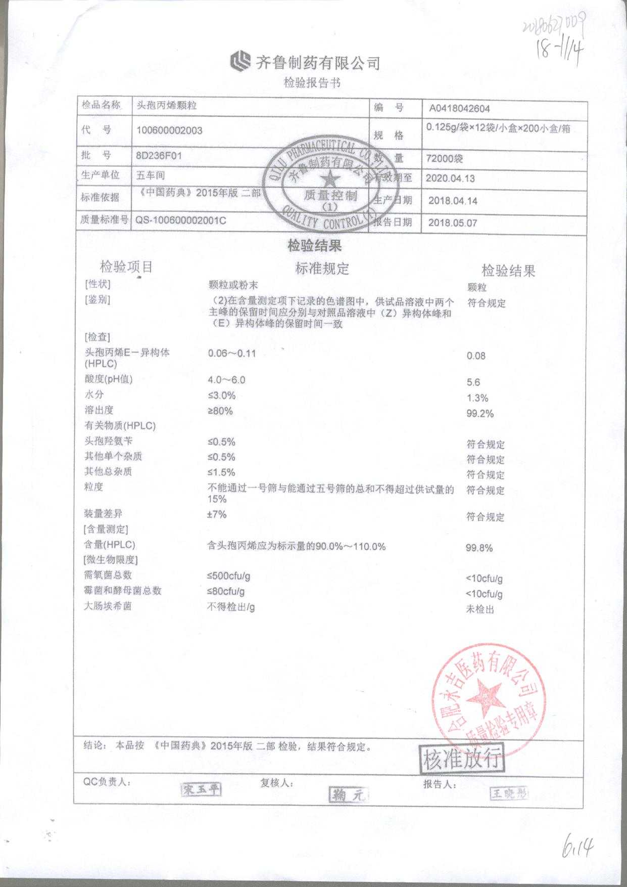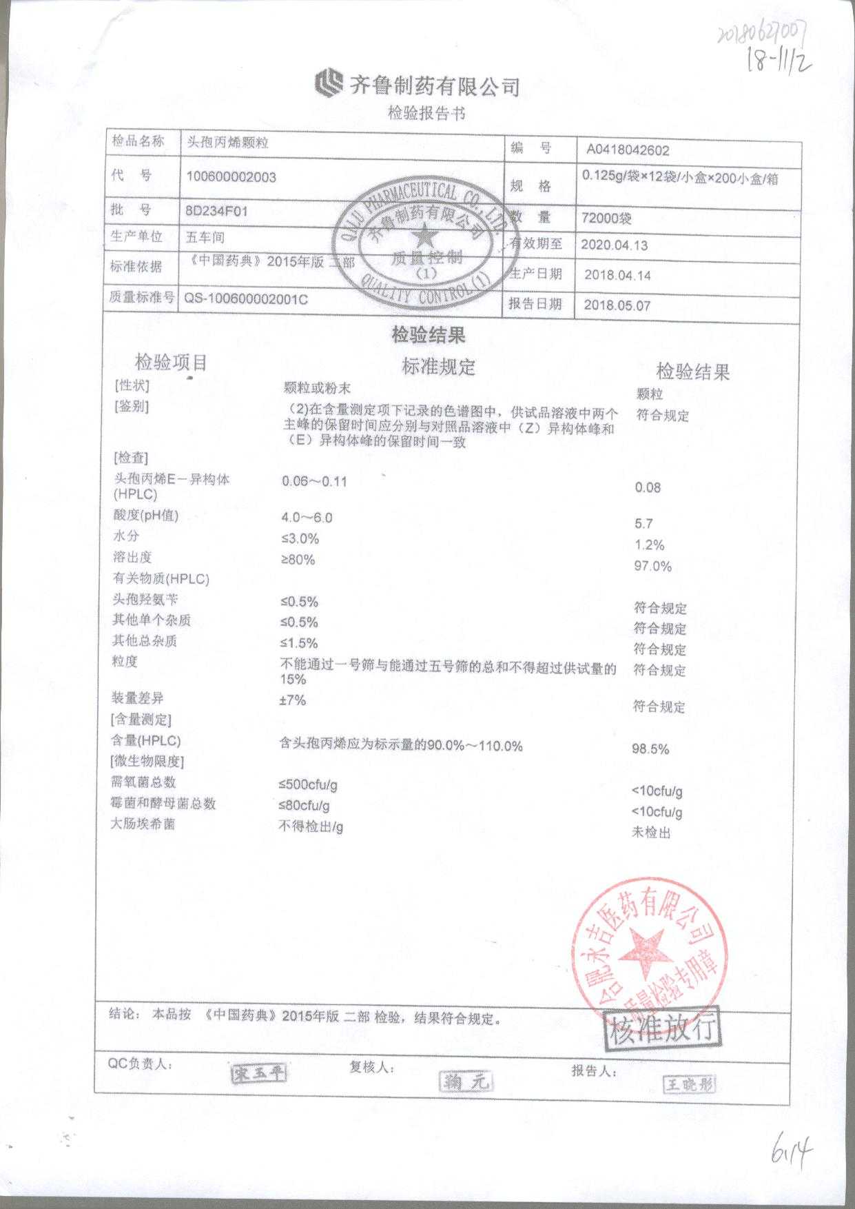 | 頭孢丙烯顆粒 | 0.125g*12袋 | 8H420F01 | 查看詳情 |